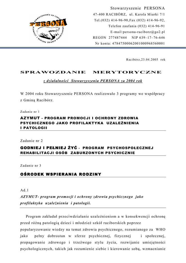Stowarzyszenie PERSONA 47-400 RACIBÓRZ, ul. Karola Miarki 7/1 Tel.(032) 414-96-90,Fax (032) 414-96-92, Telefon zaufania (032) 414-96-91 E-mail:[email protected] REGON 277487444 NIP 639–17–76-646 Nr konta: 47847500062001000968560001 Ra c ibór z,23.04 .2005 rok SPRAWOZDANIE MERYTORYCZNE z działalności Stowarzyszenia PERSONA za 2004 rok W 2004 roku Stowarzyszenie PERSONA realizowało 3 programy we współpracy z Gminą Racibórz. Z ad an ie nr 1 AZYMUT - PROGRAM PROMOCJI I OCHRONY ZDROWIA PSYCHICZNEGO JAKO PROFILAKTYKA UZALEŻNIENIA I PATOLOGII Zadanie nr 2 GODNIEJ I PEŁNIEJ ŻYĆ - PROGRAM PSYCHOSPOŁECZNEJ REHABILITACJI OSÓB ZABURZONYCH PSYCHICZNIE Zadanie nr 3 OŚRODEK WSPIERANIA RODZINY Ad.1 AZYMUT- program promocji i ochrony zdrowia psychicznego jako profilaktyka uzależnienia i patologii. Program zakładał przeciwdziałanie uzależnieniom a w konsekwencji ochronę przed różną patologią dzieci i młodzież szkół raciborskich poprzez popularyzowanie wiedzy na temat zdrowia psychicznego, rozumianego za WHO jako pełny dobrostan w sferze psychicznej, fizycznej i społecznej, propagowanie zdrowego i trzeźwego stylu życia, rozwijanie umiejętności psychologicznych, takich jak rozumienie siebie i kierowanie sobą, wzmacnianie własnych zasobów osobowościowych, które warunkują bycie sobą, nie uleganie negatywnym wpływom otoczenia, dostarczenie wiedzy nt. alkoholu i innych substancji psychoaktywnych oraz Równoległym celem było również mechanizmu powstawania uzależnienia. objęcie pomocą psychologiczną rodzin, rodziców i dzieci z grupy ryzyka, dotkniętych ww. problemem. Zajęcia odbywały się w ostatnich klasach szkół podstawowych. Prowadzone były spotkania edukacyjno - szkoleniowe dla rodziców i nauczycieli. Programem AZYMUT objęto łącznie około 550 osób. 1. Na realizację programu składały się: 2. Cykliczne spotkania edukacyjne z dziećmi i młodzieżą szkolną. 3. Zajęcia warsztatowe. 4. Poradnictwo psychologiczne i pedagogiczne dla rodziców, związane z postawami wychowawczymi rodziców, kryzysami wieku dorastania, problemami szkolnymi, zaburzonymi relacjami w kontaktach z rówieśnikami jako pośrednimi przyczynami popadania w uzależnienia. 5. Konsultacje i pomoc psychologiczna dla nauczycieli. 6. Spotkania szkoleniowe z Radami Pedagogicznymi. 7. Diagnoza postaw wobec środków uzależniających pedagogizowanych dzieci. 8. Badania socjometryczne ( Plebiscyt życzliwości, Zgadnij kto?, Ankieta socjometryczna) struktury i więzi klasowych ( dzieci izolowanych, odrzuconych, liderów klasy), klimatu klasy oraz opracowanie programu podnoszącego wzajemne więzi i spoistość klasy. Część edukacyjna zajęć obejmowała takie zagadnienia jak: 1. Zdrowie psychiczne jako efekt wszechstronnego rozwoju. 2. Ideały współczesnego młodego człowieka, wartości i cele życiowe. 3. Dzisiejsze specyficzne zagrożenia dla dzieci i młodzieży, patologiczne mechanizmy adaptacyjne i alternatywne formy człowieka zdrowego psychicznie. 4. Stres jako reakcja na zagrożenie. Techniki radzenia sobie z trudnymi sytuacjami. 5. Prawdy i mity o alkoholu i narkotykach. Używki jako pułapka i błędny mechanizm przystosowawczy. Zajęcia warsztatowe prowadzone były metodami aktywnymi pracy z grupątechnikami socjoterapeutycznymi i obejmowały następujące zagadnienia: 1. Moje wartości i cele życiowe. 2. Przyjaciele jako moje zasoby. 3. Rozwijanie umiejętności społecznych 4. Dostrzeganie potrzeb innych, rozwijanie empatii 5. Trening asertywności. Bycie sobą. Techniki obrony swojej niezależności, obrona swoich praw i harmonia z otoczeniem. 6. Komunikacja werbalna i niewerbalna. 7. Poznawanie i wyrażanie emocji 8. Nauka umiejętności współpracy z innymi, wspólnej zabawy. 9. Podnoszenie samooceny. Poznawanie swoich zasobów i budowanie pozytywnego obrazu siebie. 10.Mój indywidualny program na życie. 11.Wolność i odpowiedzialność. Nabywanie umiejętności lepszego kontaktowania się z samym sobą i radzenia sobie w trudnych sytuacjach. Dzieci i młodzież ze specyficznymi problemami i z grupy ryzyka były kierowane do OWR, gdzie kontynuują terapię ( ADHD, fobie, agresja, przemoc, niepowodzenia szkolne. Stwierdza się ogromne zapotrzebowanie na takie formy pomocy. Ad.2 GODNIEJ I PEŁNIEJ ŻYĆ - Program psychospołecznej rehabilitacji osób zaburzonych psychicznie Program adresowany był do osób zaburzonych psychicznie nie wymagających hospitalizacji, społecznym, Podejmowane wykazujących głównie do działanie deficyty osób i dysfunkcje chorych terapeutyczne na i w schizofrenię rehabilitacyjne funkcjonowaniu i ich miały rodzin. na celu przywracanie osób chorych psychicznie do społeczeństwa, przeciwdziałanie ich stygmatyzacji, marginalizacji i alienacji, mobilizowanie do aktywności, usprawnianie zaburzonych przez proces chorobowy funkcji, szczególnie w zakresie kompetencji społecznych i terapeutycznych była również edukacja osób chorych objęte zostały wsparcia). komunikowania się. Celem działań podopiecznych i ich rodzin. Rodziny pomocą i wsparciem ( utworzono dla nich grupę Zaprogramowana rehabilitacja psychospołeczna miała charakter wielorakich i systematycznych oddziaływań terapeutycznych: interwencje psychoterapeutyczne, treningi umiejętności społecznych, terapia zajęciowa, psychoterapia indywidualna i grupowa, muzykoterapia aktywna i receptywna, arteterapia, relaksacja, choreoterapia, aktywne formy spędzania czasu wolnego. Równolegle prowadzona była działalność klubowa i świetlicowa. Zajęcia prowadzone były w dni robocze po 3 godziny dziennie. Jedna godzina zajęć każdego dnia realizowana była przez prowadzących nieodpłatnie. W pracy z osobami zaburzonymi psychicznie, specjalistów realizujących zadanie wspiera 6 wolontariuszy. Oprócz zajęć terapeutycznych organizowane były wycieczki (Kotlina Kłodzka, Kraków i Wieliczka, Obora), spotkania integracyjne i noworoczne. W okresie letnim ucz