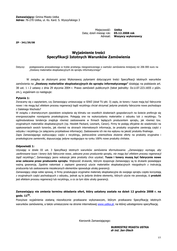 Zamawiający: Gmina Miasto Ustka Adres: 76-270 Ustka, ul. Ks. Kard. S. Wyszyńskiego 3 Miejscowość: Data; dzień miesiąc rok: Adresat: Ustka 05.12.2008 rok Wszyscy wykonawcy ZP - 341/39/08 Wyjaśnienie treści Specyfikacji Istotnych Warunków Zamówienia Dotyczy: postępowania prowadzonego w trybie przetargu nieograniczonego o wartości zamówienia mniejszej niż 206 000 euro na „Dostawy materiałów eksploatacyjnych do sprzętu informatycznego” W związku ze złożonymi przez Wykonawcę pytaniami dotyczącymi treści Specyfikacji istotnych warunków zamówienia na „Dostawy materiałów eksploatacyjnych do sprzętu informatycznego” działając na podstawie art. 38 ust. 1 i 2 ustawy z dnia 29 stycznia 2004 r. Prawo zamówień publicznych (tekst jednolity: Dz.U.07.223.1655 z późn. zm.), wyjaśniam co następuje: Pytanie 1: Zwracamy się z zapytaniem, czy Zamawiający umieszczając w SIWZ (dział TU pkt. 3) zapis, że tonery i tusze mają być fabrycznie nowe i nie mogą być efektem procesu regeneracji bądź recyklingu chciał otrzymać jedynie produkty fabrycznie nowe pochodzące z Dalekiego Wschodu? W związku z dramatycznym zjawiskiem ocieplania się klimatu we wszelkich działaniach gospodarczych na świecie preferuje się energooszczędne rozwiązania proekologiczne. Polegają one na wykorzystaniu materiałów z odzysku lub z recyklingu. Ta ogólnoświatowa tendencja znajduje również zastosowanie w firmach będących producentem sprzętu, jak również tzw. oryginalnych materiałów eksploatacyjnych (np. Hewlett Packard, Lexmark, Canon). Firmy te podają oficjalnie do wiadomości na opakowaniach swoich tonerów, jak również na stronach internetowych informacje, że produkty oryginalne zawierają części z odzysku i recyklingu (w załączeniu przykładowe informacje). Zastosowanie ich nie ma wpływu na jakość produktu finalnego. Zapis Zamawiającego wykluczający części z recyklingu, jednocześnie uniemożliwia złożenie oferty na produkty oryginalne i proekologiczne zamienniki, dopuszczając jedyne występujące na rynku 100% nowe produkty chińskie. Odpowiedź 1: Używając w dziale III ust. 3 Specyfikacji istotnych warunków zamówienia sformułowania: „Zamawiający wymaga, aby zaoferowane tusze i tonery były fabrycznie nowe, zalecane przez producenta sprzętu, nie mogą być efektem procesu regeneracji bądź recyklingu”, Zamawiający jasno wskazuje jakie produkty chce uzyskać. Tusze i tonery muszą być fabrycznie nowe oraz zalecane przez producenta sprzętu. Większość drukarek, którymi dysponuje Zamawiający są to drukarki posiadające ważną gwarancję. Zgodnie natomiast z zapisami gwarancji użycie materiałów eksploatacyjnych niezgodnych z instrukcją producenta lub zastosowanie niezalecanych elementów spowoduje utratę gwarancji. Zamawiający zdaje sobie sprawę, iż firmy produkujące oryginalne materiały eksploatacyjne do swojego sprzętu często korzystają z oryginalnych części pochodzących z odzysku, jednak są to jedynie drobne elementy, których użycie nie powoduje, iż produkt jest efektem procesu regeneracji lub recyklingu, a co za tym idzie utraty gwarancji. Zamawiający nie zmienia terminu składania ofert, który ustalony została na dzień 12 grudnia 2008 r. na godz. 1100. Powyższe wyjaśnienia zostaną niezwłocznie przekazane wykonawcom, którym przekazano Specyfikację istotnych warunków zamówienia, a także umieszczone na stronie internetowej www.ustka.pl, na której udostępniono specyfikację. Kierownik Zamawiającego: BURMISTRZ MIASTA USTKA dr inż. Jan Olech 1/1