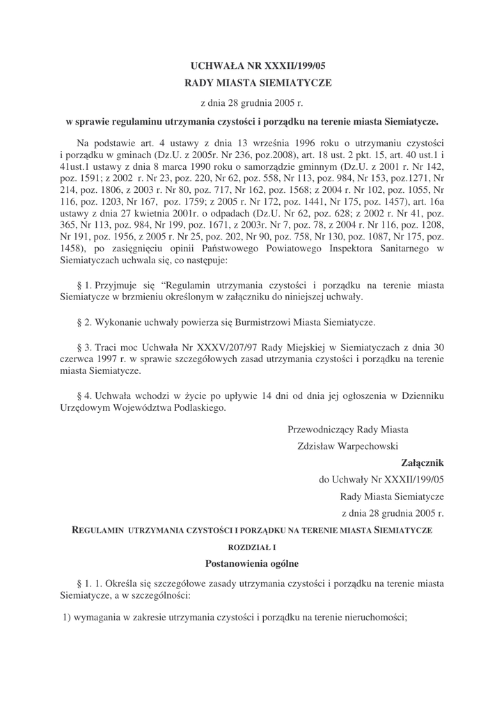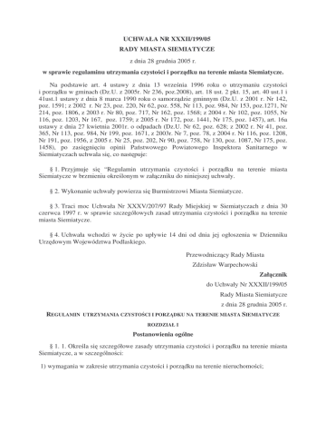 UCHWAŁA NR XXXII/199/05 RADY MIASTA SIEMIATYCZE z dnia 28 grudnia 2005 r. w sprawie regulaminu utrzymania czysto ci i porz dku na terenie miasta Siemiatycze. Na podstawie art. 4 ustawy z dnia 13 wrze nia 1996 roku o utrzymaniu czysto ci i porz dku w gminach (Dz.U. z 2005r. Nr 236, poz.2008), art. 18 ust. 2 pkt. 15, art. 40 ust.1 i 41ust.1 ustawy z dnia 8 marca 1990 roku o samorz dzie gminnym (Dz.U. z 2001 r. Nr 142, poz. 1591; z 2002 r. Nr 23, poz. 220, Nr 62, poz. 558, Nr 113, poz. 984, Nr 153, poz.1271, Nr 214, poz. 1806, z 2003 r. Nr 80, poz. 717, Nr 162, poz. 1568; z 2004 r. Nr 102, poz. 1055, Nr 116, poz. 1203, Nr 167, poz. 1759; z 2005 r. Nr 172, poz. 1441, Nr 175, poz. 1457), art. 16a ustawy z dnia 27 kwietnia 2001r. o odpadach (Dz.U. Nr 62, poz. 628; z 2002 r. Nr 41, poz. 365, Nr 113, poz. 984, Nr 199, poz. 1671, z 2003r. Nr 7, poz. 78, z 2004 r. Nr 116, poz. 1208, Nr 191, poz. 1956, z 2005 r. Nr 25, poz. 202, Nr 90, poz. 758, Nr 130, poz. 1087, Nr 175, poz. 1458), po zasi gni ciu opinii Pa stwowego Powiatowego Inspektora Sanitarnego w Siemiatyczach uchwala si , co nast puje: § 1. Przyjmuje si “Regulamin utrzymania czysto ci i porz dku na terenie miasta Siemiatycze w brzmieniu okre lonym w zał czniku do niniejszej uchwały. § 2. Wykonanie uchwały powierza si Burmistrzowi Miasta Siemiatycze. § 3. Traci moc Uchwała Nr XXXV/207/97 Rady Miejskiej w Siemiatyczach z dnia 30 czerwca 1997 r. w sprawie szczegółowych zasad utrzymania czysto ci i porz dku na terenie miasta Siemiatycze. § 4. Uchwała wchodzi w ycie po upływie 14 dni od dnia jej ogłoszenia w Dzienniku Urz dowym Województwa Podlaskiego. Przewodnicz cy Rady Miasta Zdzisław Warpechowski Zał cznik do Uchwały Nr XXXII/199/05 Rady Miasta Siemiatycze z dnia 28 grudnia 2005 r. REGULAMIN UTRZYMANIA CZYSTO CI I PORZ DKU NA TERENIE MIASTA SIEMIATYCZE ROZDZIAŁ I Postanowienia ogólne § 1. 1. Okre la si szczegółowe zasady utrzymania czysto ci i porz dku na terenie miasta Siemiatycze, a w szczególno ci: 1) wymagania w zakresie utrzymania czysto ci i porz dku na terenie nieruchomo ci; 2 2) rodzaje i minimaln pojemno urz dze przeznaczonych do zbierania odpadów komunalnych i gromadzenia nieczysto ci ciekłych na terenie nieruchomo ci oraz na drogach publicznych; 3) cz stotliwo i sposób pozbywania si odpadów komunalnych i nieczysto ci ciekłych z terenu nieruchomo ci oraz terenów przeznaczonych do u ytku publicznego; 4) maksymalny poziom odpadów komunalnych ulegaj cych biodegradacji dopuszczonych do składowania na składowiskach; 5) inne wymagania wynikaj ce z gminnego planu gospodarki odpadami; 6) obowi zki osób utrzymuj cych zwierz ta domowe maj ce na celu ochron przed zagro eniem lub uci liwo ci dla ludzi oraz przed zanieczyszczeniem terenów przeznaczonych do wspólnego u ytku; 7) wymagania odno nie utrzymywania zwierz t gospodarskich na terenach wył czonych z produkcji rolniczej; 8) wyznaczenie obszarów podlegaj cych obowi zkowej deratyzacji i terminów jej przeprowadzania. 2. Ilekro w uchwale jest mowa o: 1) ustawie – nale y przez to rozumie ustaw z dnia 13 wrze nia 1996 roku o utrzymaniu czysto ci i porz dku w gminach (Dz. U. z 2005r. Nr 236, poz. 2008); 2) wła cicielach nieruchomo ci – nale y przez to rozumie tak e współwła cicieli, u ytkowników wieczystych, oraz jednostki organizacyjne i osoby posiadaj ce nieruchomo ci w zarz dzie lub u ytkowaniu, a tak e inne podmioty władaj ce nieruchomo ciami maj ce realizowa obowi zki w zakresie utrzymania czysto ci i porz dku, przy czym: a) na terenie budowy wykonywanie obowi zków wła ciciela nieruchomo ci nale y do wykonawcy robót budowlanych, b) na terenach wydzielonych kraw nikiem lub oznakowaniem poziomym oraz przystanków komunikacyjnych obowi zki uprz tni cia i pozbycia si błota, niegu, lodu i innych zanieczyszcze , nale do przedsi biorców u ytkuj cych tereny słu ce komunikacji publicznej, c) na drogach publicznych obowi zki utrzymania czysto ci i porz dku, a tak e zbieranie i pozbywanie si odpadów zgromadzonych w urz dzeniach do tego przeznaczonych oraz utrzymanie tych urz dze w odpowiednim stanie sanitarnym, porz dkowym i technicznym, pozbywanie si błota, niegu, lodu i innych zanieczyszcze uprz tni tych z chodników przez wła cicieli nieruchomo ci przyległych do drogi publicznej, uprz tni cie i pozbycie si błota, niegu, lodu i innych zanieczyszcze z chodników, je eli zarz d drogi pobiera opłaty z tytułu postoju lub parkowania pojazdów na takim chodniku, nale do zarz du drogi. 3) umowach – nale y przez to rozumie umowy, rozumiane zgodnie z tre ci art. 6. ust. 1 ustawy, podpisane z podmiotem uprawnionym przez wła cicieli nieruchomo ci; 4) indywidualnych kontach – nale y przez to rozumie prowadzony przez podmiot uprawniony rejestr umów z wła cicielami nieruchomo ci, w którym na bie co odnotowywana jest masa wyselekcjonowanych i przekazanych podmiotowi uprawnionemu przez wła cicieli nieruchomo ci odpadów; 2006-01-03 13:09:00 3 5) górnych stawkach opłat – nale y przez to rozumie zgodnie z tre ci art. 6 ust. 2. ustawy górne stawki opłat ponoszonych przez wła cicieli nieruchomo ci za usługi, podmiotów uprawnionych, w zakresie pozbywania si zebranych na terenie nieruchomo ci odpadów komunalnych oraz nieczysto ci ciekłych; 6) Krajowym Planie Gospodarki Odpadami (dalej: KPGO ) – nale y rozumie przez to dokument przyj ty przez Rad Ministrów zgodnie z tre ci art. 14 ust. 4 ustawy z dnia 27 kwietnia 2001 r. o odpadach (Dz. U. z 2001 r. Nr 62, poz. 628) i ogłoszony w Monitorze Polskim z 2003 r. Nr 11, poz. 159; 7) stawkach opłat – nale y rozumie przez to wysoko opłat uiszczanych przez wła ciciela nieruchomo ci podmiotowi uprawnionemu za odbiór odpadów komunalnych lub wywóz nieczysto ci płynnych ze zbiorników bezodpływowych; 8) zni kach w opłatach – nale y przez to rozumie , zgodnie z tre ci art. 6 ust. 4 ustawy, zni ki, w stosunku do stawek opłat, udzielane w roku nast pnym wła cicielom nieruchomo ci za za