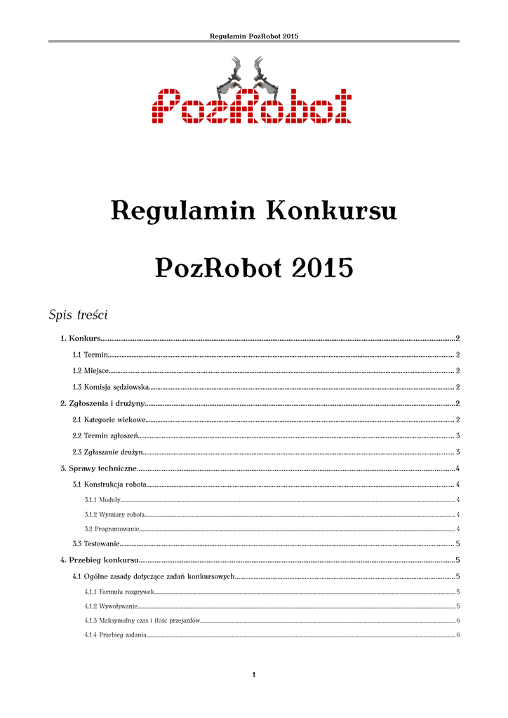 Regulamin PozRobot 2015 Regulamin Konkursu PozRobot 2015 Spis treści 1. Konkurs......................................................................................................................................................................................................2 1.1 Termin........................................................................................................................................................................................................... 2 1.2 Miejsce........................................................................................................................................................................................................... 2 1.3 Komisja sędziowska.................................................................................................................................................................................... 2 2. Zgłoszenia i drużyny.............................................................................................................................................................................2 2.1 Kategorie wiekowe...................................................................................................................................................................................... 2 2.2 Termin zgłoszeń.......................................................................................................................................................................................... 3 2.3 Zgłaszanie drużyn....................................................................................................................................................................................... 3 3. Sprawy techniczne.................................................................................................................................................................................4 3.1 Konstrukcja robota..................................................................................................................................................................................... 4 3.1.1 Moduły...................................................................................................................................................................................................................................................................... 4 3.1.2 Wymiary robota................................................................................................................................................................................................................................................... 4 3.2 Programowanie....................................................................................................................................................................................................................................................... 4 3.3 Testowanie..................................................................................................................................................................................................... 5 4. Przebieg konkursu................................................................................................................................................................................5 4.1 Ogólne zasady dotyczące zadań konkursowych................................................................................................................................. 5 4.1.1 Formuła rozgrywek............................................................................................................................................................................................................................................ 5 4.1.2 Wywoływanie......................................................................................................................................................................................................................................................... 5 4.1.3 Maksymalny czas i ilość przejazdów........................................................................................................................................................................................................ 6 4.1.4 Przebieg zadania.................................................................................................................................................................................................................................................. 6 1 Regulamin PozRobot 2015 1. Konkurs VII Ogólnopolski Konkurs Robotyki PozRobot 2015 (zwany dalej Konkursem) polega na zbudowaniu z zestawu LEGO® Mindstorms RCX, NXT lub EV3 (kategorie KADET i JUNIOR) własnego robota oraz zaprogramowaniu go do wykonywania określonych dalej zadań oraz na zbudowaniu konstrukcji z klocków LEGO i przygotowaniu prezentacji (kategoria START). 1.1 Termin Konkurs rozpocznie się dnia 9 maja 2015 roku o godzinie 10:00. Od godziny 9:00 będzie możliwość programowania oraz testowania robota na planszach testowych. Czas trwania samego Konkursu nie powinien przekraczać 7 godzin. 1.2 Miejsce Concordia Design, ul. Zwierzyniecka 3 (budynek Starej Drukarni), 60-813 Poznań – sale Lumina i Creative room (poziom 0) 1.3 Komisja sędziowska Nad prawidłowym przebiegiem Konkursu czuwa komisja sędziowska wskazana przez Organizatora. 2. Zgłoszenia i drużyny Do Konkursu mogą się zgłaszać zespoły złożone z 2 – 3 osób. Drużyny mogą składać się wyłącznie z dzieci w wieku 4 – 19 lat. Każda drużyna musi mieć również dorosłego (wiek minimum 21 lat) opiekuna. Jeden opiekun może być trenerem maksymalnie trzech drużyn. 2.1 Kategorie wiekowe W ramach Konkursu zrealizowane zostaną zawody dla trzech kategorii wiekowych • kategoria START – dzieci w wieku 4 – 7 lat, • kategoria KADET – dzieci w wieku 8 – 12 lat, • kategoria JU