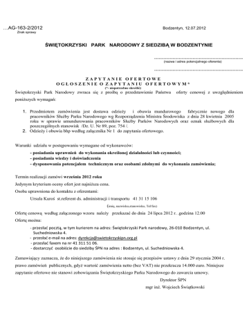 …AG-163-2/2012 Bodzentyn, 12.07.2012 Znak sprawy ŚWIĘTOKRZYSKI PARK NARODOWY Z SIEDZIBĄ W BODZENTYNIE …………………………………………………. (nazwa i adres potencjalnego oferenta) …………………………………………………. ZAPYTANIE OFERTOWE OGŁOSZENIE O ZAPYTANIU OFERTOWYM* (*- niepotrzebne skreślić) Świętokrzyski Park Narodowy zwraca się z prośbą o przedstawienie Państwa oferty cenowej z uwzględnieniem poniŜszych wymagań: 1. Przedmiotem zamówienia jest dostawa odzieŜy i obuwia mundurowego fabrycznie nowego dla pracowników SłuŜby Parku Narodowego wg Rozporządzenia Ministra Środowiska z dnia 28 kwietnia 2005 roku w sprawie umundurowania pracowników SłuŜby Parków Narodowych oraz oznak słuŜbowych dla poszczególnych stanowisk /Dz. U. Nr 89, poz. 754 /. 2. OdzieŜy i obuwia bhp według załącznika Nr 1 do zapytania ofertowego. Warunki udziału w postępowaniu wymagane od wykonawców: - posiadania uprawnień do wykonania określonej działalności lub czynności; - posiadania wiedzy i doświadczenia - dysponowania potencjałem technicznym oraz osobami zdolnymi do wykonania zamówienia; Termin realizacji zamówi września 2012 roku Jedynym kryterium oceny ofert jest najniŜsza cena. Osoba uprawniona do kontaktu z oferentami: Ursula Kuroś st.referent ds. administracji i transportu 41 31 15 106 (imię, nazwisko,stanowisko, Tel/fax) Ofertę cenową według załączonego wzoru naleŜy przekazać do dnia 24 lipca 2012 r. .godzina 12.00 Ofertę moŜna: - przesłać pocztą, w tym kurierem na adres: Świętokrzyski Park narodowy, 26-010 Bodzentyn, ul. Suchedniowska 4. - przesłać e-mail na adres: [email protected] - przesłać faxem na nr 41 311 51 06. - dostarczyć osobiście do siedziby ŚPN na adres : Bodzentyn, ul. Suchedniowska 4. Zamawiający zaznacza, Ŝe do niniejszego zamówienia nie stosuje się przepisów ustawy z dnia 29 stycznia 2004 r. prawo zamówień publicznych, gdyŜ wartość zamówienia netto (bez VAT) nie przekracza 14.000 euro. Niniejsze zapytanie ofertowe nie stanowi zobowiązania Świętokrzyskiego Parku Narodowego do zawarcia umowy. Dyrektor ŚPN mgr inŜ. Wojciech Świątkowski Zał. nr 1 Oferta na dostawę odzieŜy i obuwia mundurowego fabrycznie nowego dla pracowników SłuŜby Parku Narodowego wg Rozporządzenia Ministra Środowiska z dnia 28 kwietnia 2005 roku w sprawie umundurowania pracowników SłuŜby Parków Narodowych oraz oznak słuŜbowych dla poszczególnych stanowisk /Dz. U. z 2005 r. Nr 89, poz. 754 /. Nazwa firmy:…………………………………………………………………………. Adres:…………………………………………………………………………………. NIP……………………………….. REGON………………………………………. Data sporządzenia oferty…………………………………………………………… Imię i Nazwisko osoby uprawnionej do występowania w imieniu oferenta………………………………………………………………….. Ja, niŜej podpisany oświadczam, Ŝe w imieniu wyŜej wymienionej firmy przystępuję do zapytania ofertowego na dostawę odzieŜy i obuwia mundurowego fabrycznie nowego dla pracowników SłuŜby Parku Narodowego wg Rozporządzenia Ministra Środowiska z dnia 28 kwietnia 2005 roku w sprawie umundurowania pracowników SłuŜby Parków Narodowych oraz oznak słuŜbowych dla poszczególnych stanowisk /Dz. U. z 2005 roku Nr 89, poz. 754 / i oferuję następujące ceny na poszczególne sorty mundurowe. L.p. 1 2 3 4 5 6 7 8 9 10 Asortyment Marynarka męska z gabardyny Spodnie męskie z gabardyny Kurtka zielona z podpinką z polaru Koszula biała Koszula oliwkowozielona męska długi rękaw Czapka w kolorze zielo – nym z wizerunkiem orła w koronie wyk. z metalu Oznaki słuŜbowe haftowane bajorkiem Półbuty na grub zelówce w kolorze brązowym męskie z membraną sympatex lub równowaŜną Buty zimowe brązowe Rękawice skórkowe w Liczba sztuk lub par 13 56 4 34 48 13 13 3 2 16 Cena netto za szt. lub parę Razem netto Cena brutto szt. lub pary Razem brutto Okre s gwar ancji kolorze brązowym Krawat zielony 20 Czapka zimowa z orzełk 9 Półbuty brązowe 21 mundurowe wykonane ze skóry 14 Rajstopy damskie letnie 9 15 Rajstopy damskie zimowe 9 16 Skarpety męskie letnie 111 17 Skarpety męskie zimowe 111 18 Szalik 34 19 Koszula oliwkowozielona 3 męska krótki rękaw Ogółem sorty mundurowe OdzieŜ i obuwie bhp Kurtka wielosezonowa z 1 podpinką z polaru Buty gumowo-filcowe 20 Buty skórzane męskie z 1 membraną sympatex lub równowaŜną 11 12 13 Netto………………………, /słownie:……………………………………………….. Brutto……………………., /słownie:……………………………………………….. Oświadczam, Ŝe: - dostawa będzie zrealizowane w dniu 28 września 2012 r. w miejscu wskazanym przez Zamawiającego. miejscowość Data podpis