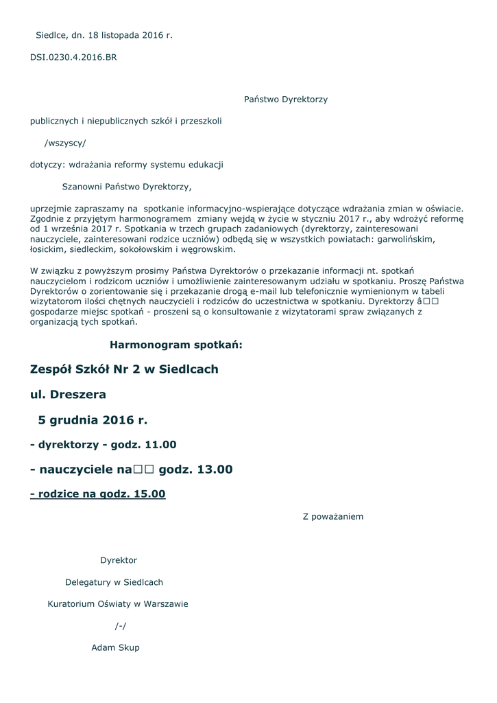 Siedlce, dn. 18 listopada 2016 r. DSI.0230.4.2016.BR Państwo Dyrektorzy publicznych i niepublicznych szkół i przeszkoli /wszyscy/ dotyczy: wdrażania reformy systemu edukacji Szanowni Państwo Dyrektorzy, uprzejmie zapraszamy na spotkanie informacyjno-wspierające dotyczące wdrażania zmian w oświacie. Zgodnie z przyjętym harmonogramem zmiany wejdą w życie w styczniu 2017 r., aby wdrożyć reformę od 1 września 2017 r. Spotkania w trzech grupach zadaniowych (dyrektorzy, zainteresowani nauczyciele, zainteresowani rodzice uczniów) odbędą się w wszystkich powiatach: garwolińskim, łosickim, siedleckim, sokołowskim i węgrowskim. W związku z powyższym prosimy Państwa Dyrektorów o przekazanie informacji nt. spotkań nauczycielom i rodzicom uczniów i umożliwienie zainteresowanym udziału w spotkaniu. Proszę Państwa Dyrektorów o zorientowanie się i przekazanie drogą e-mail lub telefonicznie wymienionym w tabeli wizytatorom ilości chętnych nauczycieli i rodziców do uczestnictwa w spotkaniu. Dyrektorzy â gospodarze miejsc spotkań - proszeni są o konsultowanie z wizytatorami spraw związanych z organizacją tych spotkań. Harmonogram spotkań: Zespół Szkół Nr 2 w Siedlcach ul. Dreszera 5 grudnia 2016 r. - dyrektorzy - godz. 11.00 - nauczyciele na godz. 13.00 - rodzice na godz. 15.00 Z poważaniem Dyrektor Delegatury w Siedlcach Kuratorium Oświaty w Warszawie /-/ Adam Skup