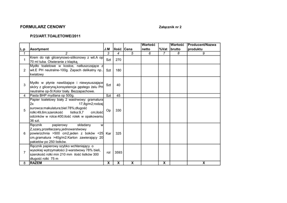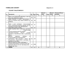 FORMULARZ CENOWY Załącznik nr 2 P/23/ART.TOALETOWE/2011 L.p 1 1 2 3 4 5 6 7 8 Asortyment J.M 3 2 Krem do rąk glicerynowo-silikonowy z wit.A op Szt 70 ml tuba. Otwieranie z klapką. Mydło toaletowe w kostce, natłuszczające z wit.E PH neutralne-100g. Zapach delikatny np.. Szt kwiatowy Mydło w płynie nawilżające i niewysuszające skóry z gliceryną,konsystencja gęstego żelu PH neutralne op-5l.Kolor biały. Bezzapachowe. Pasta BHP mydlana op 500g. Papier toaletowy biały 2 wastrwowy: gramatura 2x 17,8g/m2;rodzaj surowca:makulatura;biel:78%;długość rolki:49,6m;szerokość listka:9,7 cm;ilość odcinków w rolce:400;ilość rolek w opakowaniu 36 szt. Ręcznik papierowy składany w Z,szary,przetłaczany,jednowarstwowy powierzchnia >500 cm2,jeden z boków <25 cm,gramatura >40g/m2.Karton zawierający 20 pakietów po 250 listków. Ręcznik papierowy szybko wchłaniający o wysokiej wytrzymałości 2-warstwowy 78% bieli, szerokość rolki min 210 mm ilość listków 300 długość rolki 75 m RAZEM Ilość Cena 4 5 Wartość netto 6 Wartość %Vat brutto 8 7 Producent/Nazwa produktu 9 270 180 Szt 40 Szt 45 Op 330 Kar 325 rol 3593 X X X X X