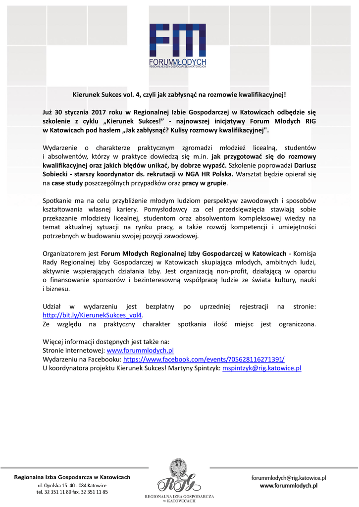 Kierunek Sukces vol. 4, czyli jak zabłysnąć na rozmowie kwalifikacyjnej! Już 30 stycznia 2017 roku w Regionalnej Izbie Gospodarczej w Katowicach odbędzie się szkolenie z cyklu „Kierunek Sukces!” - najnowszej inicjatywy Forum Młodych RIG w Katowicach pod hasłem „Jak zabłysnąć? Kulisy rozmowy kwalifikacyjnej". Wydarzenie o charakterze praktycznym zgromadzi młodzież licealną, studentów i absolwentów, którzy w praktyce dowiedzą się m.in. jak przygotować się do rozmowy kwalifikacyjnej oraz jakich błędów unikać, by dobrze wypaść. Szkolenie poprowadzi Dariusz Sobiecki - starszy koordynator ds. rekrutacji w NGA HR Polska. Warsztat będzie opierał się na case study poszczególnych przypadków oraz pracy w grupie. Spotkanie ma na celu przybliżenie młodym ludziom perspektyw zawodowych i sposobów kształtowania własnej kariery. Pomysłodawcy za cel przedsięwzięcia stawiają sobie przekazanie młodzieży licealnej, studentom oraz absolwentom kompleksowej wiedzy na temat aktualnej sytuacji na rynku pracy, a także rozwój kompetencji i umiejętności potrzebnych w budowaniu swojej pozycji zawodowej. Organizatorem jest Forum Młodych Regionalnej Izby Gospodarczej w Katowicach - Komisja Rady Regionalnej Izby Gospodarczej w Katowicach skupiająca młodych, ambitnych ludzi, aktywnie wspierających działania Izby. Jest organizacją non-profit, działającą w oparciu o finansowanie sponsorów i bezinteresowną współpracę ludzie ze świata kultury, nauki i biznesu. Udział w wydarzeniu jest bezpłatny po uprzedniej rejestracji na stronie: http://bit.ly/KierunekSukces_vol4. Ze względu na praktyczny charakter spotkania ilość miejsc jest ograniczona. Więcej informacji dostępnych jest także na: Stronie internetowej: www.forummlodych.pl Wydarzeniu na Facebooku: https://www.facebook.com/events/705628116271391/ U koordynatora projektu Kierunek Sukces! Martyny Spintzyk: [email protected]