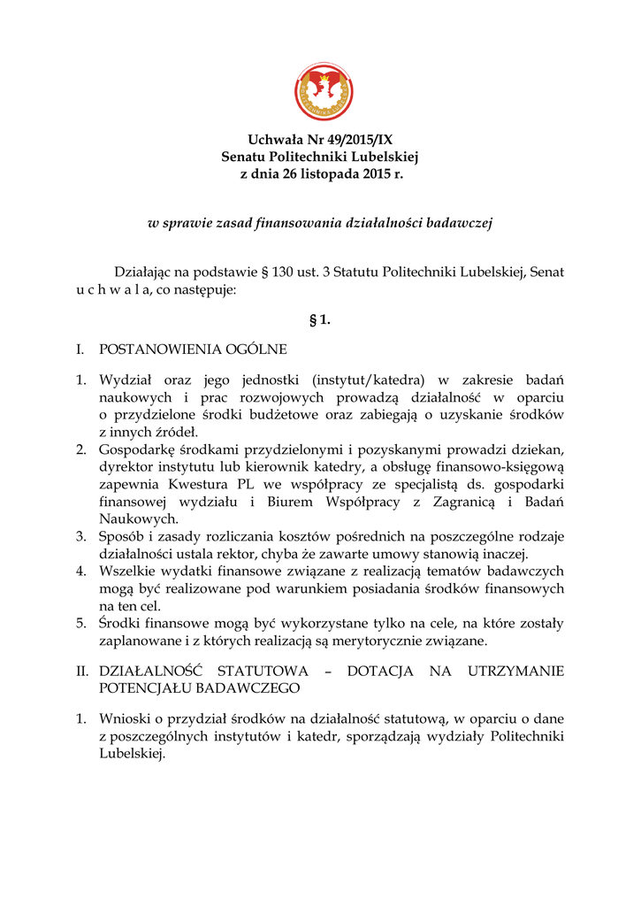 Uchwała Nr 49/2015/IX Senatu Politechniki Lubelskiej z dnia 26
