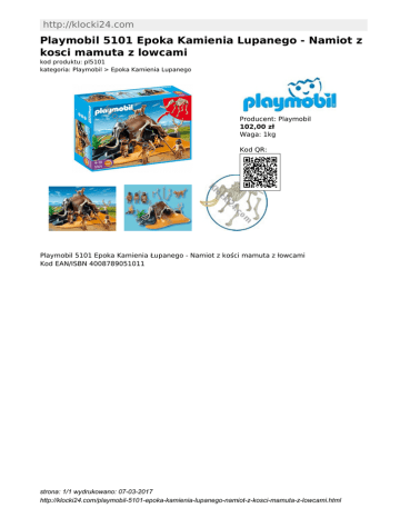 http://klocki24.com Playmobil 5101 Epoka Kamienia Lupanego - Namiot z kosci mamuta z lowcami kod produktu: pl5101 kategoria: Playmobil > Epoka Kamienia Lupanego Producent: Playmobil 102,00 zł Waga: 1kg Kod QR: Playmobil 5101 Epoka Kamienia Łupanego - Namiot z kości mamuta z łowcami Kod EAN/ISBN 4008789051011 strona: 1/1 wydrukowano: 07-03-2017 http://klocki24.com/playmobil-5101-epoka-kamienia-lupanego-namiot-z-kosci-mamuta-z-lowcami.html