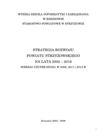 WYŻSZA SZKOŁA INFORMATYKI I ZARZĄDZANIA W RZESZOWIE STAROSTWO POWIATOWE W STRZYŻOWIE STRATEGIA ROZWOJU POWIATU STRZYŻOWSKIEGO NA LATA 2002 – 2016 WERSJA UZUPEŁNIONA W 2009, 2011 i 2015 R. Strzyżów 2002 - 2009 1 STRATEGIA ROZWOJU POWIATU STRZYŻOWSKIEGO NA LATA 2002 – 2016 Autorzy opracowania: Wyższa Szkoła Informatyki i Zarządzania w Rzeszowie: Bartłomiej Gębarowski, Marcin Leszczyński, Robert Góra (recenzja); Archiwum Państwowe w Rzeszowie: Zbigniew Irzyk; Starostwo Powiatowe w Strzyżowie i jednostki Powiatu Strzyżowskiego: Celina Bałchan, Jacek Boho, Bogusław Broda, Alina Dudzińska, Teresa Dziok, Czesław Furtek, Wiesław Gągorowski, Krystyna Homka, Renata Kopeć, Zbigniew Korab, Maria Koś, Krzysztof Piękoś, Wiesław Plezia, Stanisław Rokosz, Jan Stodolak, Barbara Szczygielska, Ryszard Szeniak, Andrzej Twardowski, Jadwiga Urban, Andrzej Włodyka, Małgorzata Wojewódka, Mieczysław Wrona, Monika Zdunek, Janusz Ziobro; opracowanie map: Beata Pieńkowska i Przemysław Czarnik; opracowanie wykresów, tabel i przygotowanie edytorskie: Iwona Niemiec, Anna Balicka; tekst i redakcja całości: Robert Godek Zarząd Powiatu składa podziękowanie za współpracę w opracowaniu Strategii Rozwoju Powiatu Strzyżowskiego Wyższej Szkole Informatyki i Zarządzania w Rzeszowie, Urzędowi Statystycznemu w Rzeszowie, Rzeszowskiej Agencji Rozwoju Regionalnego w Rzeszowie, Agencji Rozwoju Regionalnego „Karpaty” w Krośnie, Kierownikowi Zespołu Terenowego w Strzyżowie Ośrodka Doradztwa Rolniczego w Boguchwale, Rzeszowskiemu Zakładowi Energetycznemu S. A. w Rzeszowie, Rozdzielni Gazu w Strzyżowie Zakładu Gazowniczego w Rzeszowie Polskiego Górnictwa Naftowego i Gazownictwa S. A. w Warszawie, Nadleśniczemu i Nadleśnictwu Strzyżów, Naczelnikowi i Urzędowi Skarbowemu w Strzyżowie, Regionalnemu Zarządowi Gospodarki Wodnej w Krakowie, Archiwum Państwowemu w Rzeszowie, Dyrekcji Zespołu Karpackich Parków Krajobrazowych w Krośnie, Wojewódzkiemu Inspektorowi i Inspektoratowi Ochrony Środowiska w Rzeszowie, Wojewódzkiemu Konserwatorowi Zabytków w Rzeszowie, Wojewódzkiemu Konserwatorowi Przyrody w Rzeszowie, Podkarpackiej Regionalnej Kasie Chorych w Rzeszowie, Biuru Urządzania Lasu i Geodezji Leśnej Oddział w Przemyślu, Podkarpackiemu Biuru Planowania Przestrzennego w Rzeszowie, Urzędowi Marszałkowskiemu w Rzeszowie, Urzędom Gmin w Czudcu, Frysztaku, Niebylcu, Wiśniowej, Urzędowi Miasta i Gminy w Strzyżowie 2 SPIS TREŚCI: WPROWADZENIE .............................................................................................................................. 9 I. SYTUACJA SPOŁECZNO – GOSPODARCZA I STAN ŚRODOWISKA .............................. 11 1. OGÓLNA CHARAKTERYSTYKA POWIATU STRZYŻOWSKIEGO ................................. 11 1.1. Powierzchnia i ludność powiatu w poszczególnych okresach jego funkcjonowania ................ 11 1.2. Pozycja powiatu na tle województwa podkarpackiego.............................................................. 13 2. SEKTORY DZIAŁALNOŚCI SPOŁECZNO – GOSPODARCZEJ ......................................... 20 2.1. ROLNICTWO, PRZETWÓRSTWO I RYNEK ROLNY ......................................................... 20 2.1.1. Warunki produkcji rolniczej i struktura agrarna ................................................................. 20 2.1.2. Produkcja rolnicza ......................................................................................................... 22 2.1.3. Warunki społeczno – ekonomiczne i zatrudnienie w rolnictwie ........................................ 26 2.1.4. Przetwórstwo i rynek rolny ................................................................................................. 27 2.2. PRZEMYSŁ, BUDOWNICTWO, SEKTOR MAŁYCH I ŚREDNICH PRZEDSIĘBIORSTW I USŁUGI RYNKOWE .................................................................................................................... 28 2. 2. 1. Przemysł ............................................................................................................................ 30 2.2.2. Sektor Małych i Średnich Przedsiębiorstw ......................................................................... 32 2.2.3. Budownictwo ...................................................................................................................... 34 2.2.4. Usługi rynkowe ................................................................................................................... 35 2.3. EDUKACJA, KULTURA I SPORT .......................................................................................... 36 2.3.1. Edukacja .............................................................................................................................. 36 2.3.2. Kultura ................................................................................................................................ 42 2.3.3. Sport .................................................................................................................................... 43 2.4. OCHRONA ZDROWIA ORAZ POMOC SPOŁECZNA ......................................................... 43 2.5. TURYSTYKA I REKREACJA ................................................................................................. 50 2.5.1. Warunki rozwoju turystyki i rekreacji ................................................................................ 50 3. STAN I JAKOŚĆ ŚRODOWISKA W POWIECIE STRZYŻOWSKIM.................................. 53 3.1. Charakterystyka środowiska geograficznego i przyrodniczego................................................. 53 3.2. Jakość środowiska naturalnego .................................................................................................. 58 II. POTENCJAŁY ROZWOJOWE POWIATU STRZYŻOWSKIEGO ..................................... 61 1. ZASOBY I WALORY NATURALNE ....................................................................