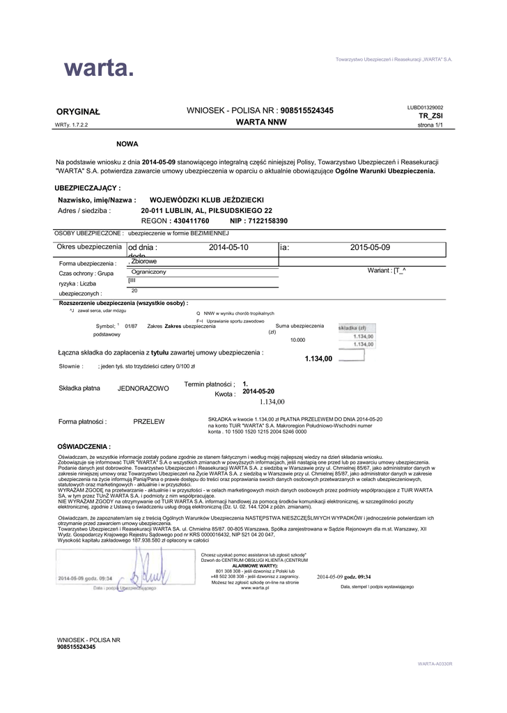 Towarzystwo Ubezpieczeń i Reasekuracji „WARTA" S.A. warta. LUBD01329002 WNIOSEK - POLISA NR : 908515524345 WARTA NNW ORYGINAŁ WRTy. 1.7.2.2 TR_ZSI strona 1/1 NOWA Na podstawie wniosku z dnia 2014-05-09 stanowiącego integralną część niniejszej Polisy, Towarzystwo Ubezpieczeń i Reasekuracji "WARTA" S.A. potwierdza zawarcie umowy ubezpieczenia w oparciu o aktualnie obowiązujące Ogólne Warunki Ubezpieczenia. UBEZPIECZAJĄCY : Nazwisko, imię/Nazwa : WOJEWÓDZKI KLUB JEŹDZIECKI Adres / siedziba : 20-011 LUBLIN, AL, PIŁSUDSKIEGO 22 REGON : 430411760 NIP : 7122158390 OSOBY UBEZPIECZONE : ubezpieczenie w formie BEZIMIENNEJ Okres ubezpieczenia od dnia : 2014-05-10 ia: 2015-05-09 dodn , Zbiorowe Forma ubezpieczenia : Wariant : [T_^ Ograniczony Czas ochrony : Grupa [III ryzyka : Liczba 20 ubezpieczonych : Rozszerzenie ubezpieczenia (wszystkie osoby) : ^J zawal serca, udar mózgu Symbol; 1 Q NNW w wyniku chorób tropikalnych F~l Uprawianie sportu zawodowo 01/87 Suma ubezpieczenia (zł) Zakres Zakres ubezpieczenia podstawowy 10.000 Łączna składka do zapłacenia z tytułu zawartej umowy ubezpieczenia : Słownie : 1.134,00 ; jeden tyś. sto trzydzieści cztery 0/100 zł Składka płatna JEDNORAZOWO Termin płatności ; Kwota : 1. 2014-05-20 1.134,00 Forma płatności : PRZELEW SKŁADKA w kwocie 1.134,00 zł PŁATNA PRZELEWEM DO DNIA 2014-05-20 na konto TUiR "WARTA" S.A. Makroregion Południowo-Wschodni numer konta . 10 1500 1520 1215 2004 5246 0000 OŚWIADCZENIA : Oświadczam, że wszystkie informacje zostały podane zgodnie ze stanem faktycznym i według mojej najlepszej wiedzy na dzień składania wniosku. Zobowiązuje się informować TUiR "WARTA" S.A o wszystkich zmianach w powyższych informacjach, jeśli nastąpią one przed lub po zawarciu umowy ubezpieczenia. Podanie danych jest dobrowolne. Towarzystwo Ubezpieczeń i Reasekuracji WARTA S.A. z siedzibą w Warszawie przy ul. Chmielnej 85/67, jako administrator danych w zakresie niniejszej umowy oraz Towarzystwo Ubezpieczeń na Życie WARTA S.A. z siedzibą w Warszawie przy ul. Chmielnej 85/87, jako administrator danych w zakresie ubezpieczenia na życie informują Panią/Pana o prawie dostępu do treści oraz poprawiania swoich danych osobowych przetwarzanych w celach ubezpieczeniowych, statutowych oraz marketingowych - aktualnie i w przyszłości. WYRAŻAM ZGODĘ na przetwarzanie - aktualnie i w przyszłości - w celach marketingowych moich danych osobowych przez podmioty współpracujące z TUiR WARTA SA, w tym przez TUnŻ WARTA S.A. i podmioty z nim współpracujące. NIE WYRAŻAM ZGODY na otrzymywanie od TUiR WARTA S.A. informacji handlowej za pomocą środków komunikacji elektronicznej, w szczególności poczty elektronicznej, zgodnie z Ustawą o świadczeniu usług drogą elektroniczną (Dz. U. 02. 144.1204 z póżn. zmianami). Oświadczam, że zapoznatem/am się z treścią Ogólnych Warunków Ubezpieczenia NASTĘPSTWA NIESZCZĘŚLIWYCH WYPADKÓW i jednocześnie potwierdzam ich otrzymanie przed zawarciem umowy ubezpieczenia. Towarzystwo Ubezpieczeń i Reasekuracji WARTA SA. ul. Chmielna 85/87. 00-805 Warszawa, Spółka zarejestrowana w Sądzie Rejonowym dla m.st. Warszawy, XII Wydz. Gospodarczy Krajowego Rejestru Sądowego pod nr KRS 0000016432, NIP 521 04 20 047, Wysokość kapitału zakładowego 187.938.580 zł opłacony w całości Chcesz uzyskać pomoc assistance lub zgłosić szkodę'' Dzwoń do CENTRUM OBSŁUGI KLIENTA (CENTRUM ALARMOWE WARTY): 801 308 308 - jeśli dzwonisz z Polski lub »48 502 308 308 - jeśli dzwonisz z zagranicy. Możesz tez zgłosić szkodę on-line na stronie www.warta.pl 2014-05-09 godz. 09:34 Dala, stempel \ podpis wystawiającego WNIOSEK - POLISA NR 908515524345 WARTA-A0330R