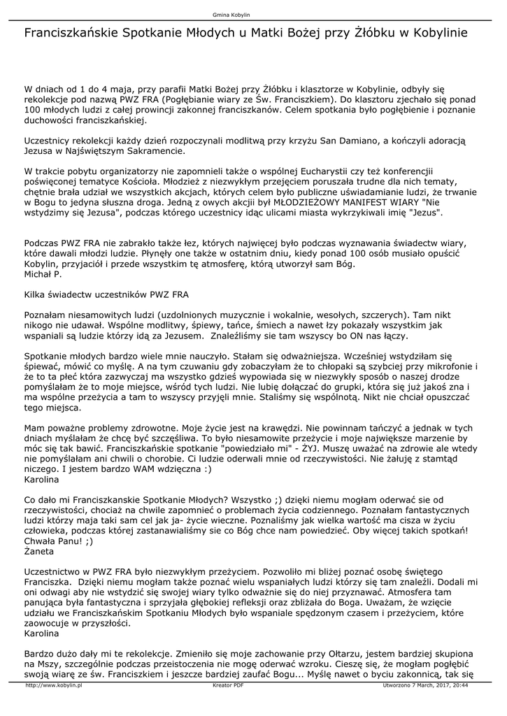 Gmina Kobylin Franciszkańskie Spotkanie Młodych u Matki Bożej przy Żłóbku w Kobylinie W dniach od 1 do 4 maja, przy parafii Matki Bożej przy Żłóbku i klasztorze w Kobylinie, odbyły się rekolekcje pod nazwą PWZ FRA (Pogłębianie wiary ze Św. Franciszkiem). Do klasztoru zjechało się ponad 100 młodych ludzi z całej prowincji zakonnej franciszkanów. Celem spotkania było pogłębienie i poznanie duchowości franciszkańskiej. Uczestnicy rekolekcji każdy dzień rozpoczynali modlitwą przy krzyżu San Damiano, a kończyli adoracją Jezusa w Najświętszym Sakramencie. W trakcie pobytu organizatorzy nie zapomnieli także o wspólnej Eucharystii czy też konferencjii poświęconej tematyce Kościoła. Młodzież z niezwykłym przejęciem poruszała trudne dla nich tematy, chętnie brała udział we wszystkich akcjach, których celem było publiczne uświadamianie ludzi, że trwanie w Bogu to jedyna słuszna droga. Jedną z owych akcjii był MŁODZIEŻOWY MANIFEST WIARY "Nie wstydzimy się Jezusa", podczas którego uczestnicy idąc ulicami miasta wykrzykiwali imię "Jezus". Podczas PWZ FRA nie zabrakło także łez, których najwięcej było podczas wyznawania świadectw wiary, które dawali młodzi ludzie. Płynęły one także w ostatnim dniu, kiedy ponad 100 osób musiało opuścić Kobylin, przyjaciół i przede wszystkim tę atmosferę, którą utworzył sam Bóg. Michał P. Kilka świadectw uczestników PWZ FRA Poznałam niesamowitych ludzi (uzdolnionych muzycznie i wokalnie, wesołych, szczerych). Tam nikt nikogo nie udawał. Wspólne modlitwy, śpiewy, tańce, śmiech a nawet łzy pokazały wszystkim jak wspaniali są ludzie którzy idą za Jezusem. Znaleźliśmy sie tam wszyscy bo ON nas łączy. Spotkanie młodych bardzo wiele mnie nauczyło. Stałam się odważniejsza. Wcześniej wstydziłam się śpiewać, mówić co myślę. A na tym czuwaniu gdy zobaczyłam że to chłopaki są szybciej przy mikrofonie i że to ta płeć która zazwyczaj ma wszystko gdzieś wypowiada się w niezwykły sposób o naszej drodze pomyślałam że to moje miejsce, wśród tych ludzi. Nie lubię dołączać do grupki, która się już jakoś zna i ma wspólne przeżycia a tam to wszyscy przyjęli mnie. Staliśmy się wspólnotą. Nikt nie chciał opuszczać tego miejsca. Mam poważne problemy zdrowotne. Moje życie jest na krawędzi. Nie powinnam tańczyć a jednak w tych dniach myślałam że chcę być szczęśliwa. To było niesamowite przeżycie i moje największe marzenie by móc się tak bawić. Franciszkańskie spotkanie "powiedziało mi" - ŻYJ. Muszę uważać na zdrowie ale wtedy nie pomyślałam ani chwili o chorobie. Ci ludzie oderwali mnie od rzeczywistości. Nie żałuję z stamtąd niczego. I jestem bardzo WAM wdzięczna :) Karolina Co dało mi Franciszkanskie Spotkanie Młodych? Wszystko ;) dzięki niemu mogłam oderwać sie od rzeczywistości, chociaż na chwile zapomnieć o problemach życia codziennego. Poznałam fantastycznych ludzi którzy maja taki sam cel jak ja- życie wieczne. Poznaliśmy jak wielka wartość ma cisza w życiu człowieka, podczas której zastanawialiśmy sie co Bóg chce nam powiedzieć. Oby więcej takich spotkań! Chwała Panu! ;) Żaneta Uczestnictwo w PWZ FRA było niezwykłym przeżyciem. Pozwoliło mi bliżej poznać osobę świętego Franciszka. Dzięki niemu mogłam także poznać wielu wspaniałych ludzi którzy się tam znaleźli. Dodali mi oni odwagi aby nie wstydzić się swojej wiary tylko odważnie się do niej przyznawać. Atmosfera tam panująca była fantastyczna i sprzyjała głębokiej refleksji oraz zbliżała do Boga. Uważam, że wzięcie udziału we Franciszkańskim Spotkaniu Młodych było wspaniale spędzonym czasem i przeżyciem, które zaowocuje w przyszłości. Karolina Bardzo dużo dały mi te rekolekcje. Zmieniło się moje zachowanie przy Ołtarzu, jestem bardziej skupiona na Mszy, szczególnie podczas przeistoczenia nie mogę oderwać wzroku. Cieszę się, że mogłam pogłębić swoją wiarę ze św. Franciszkiem i jeszcze bardziej zaufać Bogu... Myślę nawet o byciu zakonnicą, tak się http://www.kobylin.pl Kreator PDF Utworzono 7 March, 2017, 20:44 Gmina Kobylin zmieniła moja miłość do Boga. Bardzo się cieszę z tego powodu ;) Nie mogę pominąć faktu, że pierwszy raz na mojej drodze życia spotkałam tak wspaniałych ludzi. Pozdrawiam ;) Nigdy nie czułam się tak wspaniale jak na PWZ FRA, Bóg objawił mi się tam w ludziach. W Was, kochani przyjaciele. Otrzymałam od Was tyle ciepła. Każdy uśmiech, słowo, gest, każde przytulenie napełniało Bożą miłością. Zaowocowało to gorącym pragnieniem by żyć wzorem św. Franciszka: „Panie uczyń nas narzędziem Twojego pokoju […] Spraw, abyśmy mogli nie tyle szukać pociechy, co pociechę dawać; nie tyle szukać zrozumienia, co rozumieć; nie tyle szukać miłości, co kochać; albowiem dając - otrzymujemy…” Byliście dla mnie żywymi świadkami Jezusa i to przemieniło moje serce. Za to wszystko CHWAŁA PANU! Agnieszka Szczęść Boże! Mam 15 lat. Kiedy przyjechałam do Kobylina, trochę zdziwiło mnie mało liczne przybycie moich rówieśników. Mimo to, już wkrótce poczułam się jak w domu. Pewnego razu stałam samotnie w 'biurze' i nagle jedna z przechodzących osób powiedziała do mnie: "Dobrze, że jesteś"- niby to słowa tak banalne, a bardzo mnie uszczęśliwiły. Czułam się tak, jakby to Bóg do mnie przemówił. Kiedy ostatniego dnia mieliśmy modlitwę na łonie natury, moje Pismo Święte zostało w walizce. Wtedy podszedł do mnie jeden z ojców i powiedział po prostu: "Weź moje". Kolejny prosty gest, a tak wiele mnie nauczył. I od tamtej pory jeszcze bardziej staram się dzielić ze wszystkimi. Ten sam ojciec po filmie o Marii Goretti rzekł, że jestem podobna do aktorki grającą tą świętą. Nie byłam przekonana, więc wtedy powiedział: "A może bardziej do Jezusa?". Bardzo bym tego chciała. Powinnam 