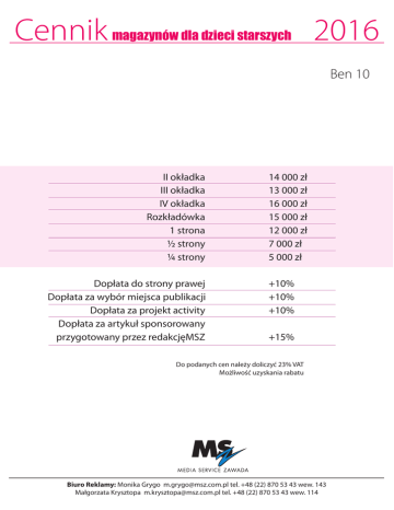 Cennik magazynów dla dzieci starszych 2016 Ben 10 II okładka III okładka IV okładka Rozkładówka 1 strona ½ strony ¼ strony Dopłata do strony prawej Dopłata za wybór miejsca publikacji Dopłata za projekt activity Dopłata za artykuł sponsorowany przygotowany przez redakcjęMSZ 14 000 zł 13 000 zł 16 000 zł 15 000 zł 12 000 zł 7 000 zł 5 000 zł +10% +10% +10% +15% Do podanych cen należy doliczyć 23% VAT Możliwość uzyskania rabatu Biuro Reklamy: Monika Grygo [email protected] tel. +48 (22) 870 53 43 wew. 143 Małgorzata Krysztopa [email protected] tel. +48 (22) 870 53 43 wew. 114