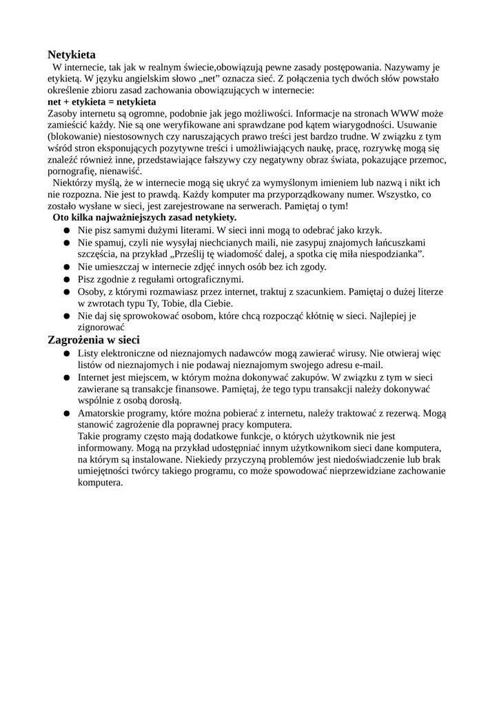 Netykieta W internecie, tak jak w realnym świecie,obowiązują pewne zasady postępowania. Nazywamy je etykietą. W języku angielskim słowo „net” oznacza sieć. Z połączenia tych dwóch słów powstało określenie zbioru zasad zachowania obowiązujących w internecie: net + etykieta = netykieta Zasoby internetu są ogromne, podobnie jak jego możliwości. Informacje na stronach WWW może zamieścić każdy. Nie są one weryfikowane ani sprawdzane pod kątem wiarygodności. Usuwanie (blokowanie) niestosownych czy naruszających prawo treści jest bardzo trudne. W związku z tym wśród stron eksponujących pozytywne treści i umożliwiających naukę, pracę, rozrywkę mogą się znaleźć również inne, przedstawiające fałszywy czy negatywny obraz świata, pokazujące przemoc, pornografię, nienawiść. Niektórzy myślą, że w internecie mogą się ukryć za wymyślonym imieniem lub nazwą i nikt ich nie rozpozna. Nie jest to prawdą. Każdy komputer ma przyporządkowany numer. Wszystko, co zostało wysłane w sieci, jest zarejestrowane na serwerach. Pamiętaj o tym! Oto kilka najważniejszych zasad netykiety. ● Nie pisz samymi dużymi literami. W sieci inni mogą to odebrać jako krzyk. ● Nie spamuj, czyli nie wysyłaj niechcianych maili, nie zasypuj znajomych łańcuszkami szczęścia, na przykład „Prześlij tę wiadomość dalej, a spotka cię miła niespodzianka”. ● Nie umieszczaj w internecie zdjęć innych osób bez ich zgody. ● Pisz zgodnie z regułami ortograficznymi. ● Osoby, z którymi rozmawiasz przez internet, traktuj z szacunkiem. Pamiętaj o dużej literze w zwrotach typu Ty, Tobie, dla Ciebie. ● Nie daj się sprowokować osobom, które chcą rozpocząć kłótnię w sieci. Najlepiej je zignorować Zagrożenia w sieci ● Listy elektroniczne od nieznajomych nadawców mogą zawierać wirusy. Nie otwieraj więc listów od nieznajomych i nie podawaj nieznajomym swojego adresu e-mail. ● Internet jest miejscem, w którym można dokonywać zakupów. W związku z tym w sieci zawierane są transakcje finansowe. Pamiętaj, że tego typu transakcji należy dokonywać wspólnie z osobą dorosłą. ● Amatorskie programy, które można pobierać z internetu, należy traktować z rezerwą. Mogą stanowić zagrożenie dla poprawnej pracy komputera. Takie programy często mają dodatkowe funkcje, o których użytkownik nie jest informowany. Mogą na przykład udostępniać innym użytkownikom sieci dane komputera, na którym są instalowane. Niekiedy przyczyną problemów jest niedoświadczenie lub brak umiejętności twórcy takiego programu, co może spowodować nieprzewidziane zachowanie komputera.