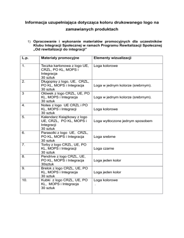 Informacja uzupełniająca dotycząca koloru drukowanego logo na zamawianych produktach 1) Opracowanie i wykonanie materiałów promocyjnych dla uczestników Klubu Integracji Społecznej w ramach Programu Rewitalizacji Społecznej „Od rewitalizacji do integracji” L.p. Materiały promocyjne Elementy wizualizacji 1. Teczka kartonowa z logo UE, CRZL, PO KL, MOPS i Integracja 30 sztuk Długopisy z logo, UE, CRZL, PO KL, MOPS i Integracja 30 sztuk Ołówek z logo CRZL, UE, PO KL, MOPS i Integracja 30 sztuk Notes z logo UE CRZL i PO KL, MOPS i Integracji 30 sztuk Kalendarz Książkowy z logo UE, CRZL, PO KL, MOPS i Integracji 30 sztuk Parasolki z logo UE, CRZL, PO KL, MOPS i Integracja 30 sztuk Torby z logo CRZL, UE, PO KL, MOPS i Integracji 30 sztuk Pendrive z logo CRZL, UE, PO KL, MOPS i Integracja 30sztuk Brelok z logo CRZL, UE, PO KL, MOPS i Integracja 30 sztuk Kubki z logo CRZL, UE, PO KL, MOPS i Integracja 30 sztuk Loga kolorowe 2. 3 4. 5. 6. 7. 8. 9. 10. Loga w jednym kolorze (srebrnym). Loga w jednym kolorze (srebrnym). Loga kolorowe Loga wytłoczone jednym sposobem Loga srebrne Loga czarne Loga jeden kolor Loga jeden kolor Loga kolorowe . 2) Opracowanie i wykonanie materiałów promocyjnych dla uczestników Centrum Aktywnej Młodzieży w ramach Społecznej „Od rewitalizacji do integracji” L.p. 1. 2. 3 4. 5. 6. 7. 8. 9. 10. Materiały promocyjne Kubek Termiczny z logo CRZL, UE, PO KL, MOPS i Integracja 30 sztuk Programu Rewitalizacji Elementy wizualizacji Loga nadruk w jednym kolorze Plecaki z logo CRZL, UE, PO KL, MOPS i Integracja 30 sztuk Loga kolorowe Długopisy z logo CRZL, UE, PO KL, MOPS i Integracja 30 sztuk Loga w jednym kolorze (srebrnym). Podkładki z Klipsem z logo CRZL, UE, PO KL, MOPS i Integracji 30 sztuk Ołówek z logo CRZL, UE, PO KL, MOPS i Integracja 30 sztuk Identyfikator + smycz z logo CRZL, UE, PO KL, MOPS i Integracja 30 sztuk Koszulki bawełniane z logo CRZL, UE, PO KL, MOPS i Integracji 30 sztuk: rozmiar S – 5 szt. rozmiar M- 10 szt. rozmiar L- 15 szt. Pendrive z logo CRZL, UE, PO KL, MOPS i Integracja 30 sztuk Brelok z logo CRZL, UE, PO KL, MOPS i Integracja 30 sztuk Czapeczki z daszkiem z logo CRZL, UE, PO KL, MOPS i Integracji 30 sztuk Loga kolorowe Loga w jednym kolorze (srebrnym). Loga kolorowe Loga kolorowe Loga jeden kolor Loga jeden kolor Loga kolorowe 3) Opracowanie i wykonanie materiałów promocyjnych w ramach Programu Rewitalizacji Społecznej „Od rewitalizacji do integracji” L.p. 1. 2. 3 4. 5. 6. 7. 8. Materiały promocyjne Kubek Termiczny z logo CRZL, UE, PO KL, MOPS i Integracja 20 sztuk Koszulki bawełniane z logo CRZL, UE, PO KL, MOPS i Integracji 40 sztuk, w tym dla dorosłych: Rozmiar S – 10 szt. Rozmiar M – 10 szt. Rozmiar L – 10 szt. Junior (dla dzieci) Rozmiar M – 10 szt. Długopisy z logo CZRL, UE, PO KL, MOPS i Integracja 110 sztuk Brelok z logo CZRL, UE, PO KL, MOPS i Integracja 70sztuk Ołówek z logo CRZL, UE, PO KL, MOPS i Integracja 50 sztuk Notes Magnetyczny na lodówkę z logo CRZL, UE, PO KL,MOPS i Integracji 60 sztuk Kubki z logo CRZL, UE, PO KL, MOPS i Integracja 50 sztuk Pendrive z logo CRZL, UE, PO KL, MOPS i Integracja 50 sztuk Elementy wizualizacji Loga nadruk w jednym kolorze Loga kolorowe Loga w jednym kolorze (srebrnym). Loga jeden kolor Loga w jednym kolorze (srebrnym). Loga kolorowe Loga kolorowe Loga jeden kolor Ilekroć w niniejszym wykazie mowa o logotypach: UE, CRZL, PO KL powinny być zamieszczone w następującej kolejności UE, CRZL, PO KL jeżeli chodzi o kolorystykę to należy je zrobić zgodnie z wytycznymi dotyczącymi oznaczenia projektów w ramach Programu Operacyjnego Kapitał Ludzki.