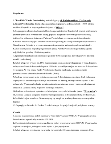 Regulamin 1.”Eco Kids” Punkt Przedszkolny mieści się przy ul. Rodakowskiego 1/3a Szczecin 2.Punkt Przedszkolny działa od poniedziałku do piątku w godzinach 6:00- 19:00. Istnieje możliwość opieki w innych godzinach (patrz - "Oferta"). 3.Do przyprowadzania i odbierania Dziecka upoważnieni są Rodzice lub prawni opiekunowie (można upoważnić również inne osoby, poprzez podpisanie stosownego oświadczenia). 4.Wszelkie informacje dotyczące Państwa Pociech będą przekazywane indywidualnie. 5.Rodzic zobowiązany jest odebrać Dziecko do godziny,do której zobowiązał się w umowie . Nieodebranie Dziecka w wyznaczonym czasie powoduje naliczenie godzinowej stawki. 6.Chęć skorzystania z opieki po godzinach pracy Punktu Przedszkolnego należy zgłosić najpóźniej do godziny 15:00 danego dnia. 7.Zgłoszenie nieobecności Dziecka do godziny 8:30 danego dnia powoduje zwrot dziennej stawki żywieniowej. 8.Rabat urlopowy wynosi ok. 50% miesięcznego czesnego i przysługuje raz w roku. Przerwa urlopowa w Punkcie Przedszkolnym w 2016roku przewidywana jest na okres od 3 sierpnia do 14 sierpnia. W tym czasie Punkt Przedszkolny będzie zamknięty, a opłata zostanie pomniejszona o okres nieobecności dziecka (9 dni). 9.Rodzice zobowiązani są do wpłaty czesnego do 5 dnia każdego miesiąca. Brak dokonania zapłaty do 20 dnia miesiąca skutkuje wezwaniem do zapłaty, którego termin wynosi 7 dni roboczych. W przypadku braku wpłaty następuje rozwiązanie umowy oraz natychmiastowe skreślenie Dziecka z listy. Wpisowe nie ulega zwrotowi. 10.Rodzice zobowiązani są dostarczyć niezbędne rzeczy dla Maluszka (patrz -"Wyprawka"). 11.Rodzice Dzieci z alergiami pokarmowymi proszeni są o dostarczenie listy produktów, na które Dziecko jest uczulone. To samo tyczy się alergii na produkty kosmetyczne (mydełka, kremy). 12.O przyjęciu Dziecka do Punktu Przedszkolnego decyduje kolejność podpisania umowy. Cennik 1.Czesne miesięczne za pobyt Dziecka w "Eco Kids" wynosi 700 PLN. W przypadku dwójki Dzieci opłata wynosi odpowiednio 600 PLN. 2.Obowiązuje jednorazowe wpisowe. Kwota opłaty wpisowej wynosi 300PLN. W przypadku zapisania więcej niż jednego dziecka opłata ta jest pojedyncza. 3.Rabat urlopowy przysługuje raz w roku i wynosi ok. 50% miesięcznego czesnego. Czas urlopu ustalony jest odgórnie przez właściciela Punktu Przedszkolnego. 4.Dzienna stawka żywieniowa wynosi 10 PLN. W przypadku zgłoszonej nieobecności dziecka do godziny 8:30, kwota ta będzie zwrócona. Wyżywienie zapewnia firma cateringowa. 5. Koszt opieki po godzinie umówionej indywidualnie to 10 PLN za każdą rozpoczętą godzinę. Wyprawka Maleństwa 1.Ubranka na zmianę - podpisane 2.Kapcie bądź grubsze skarpetki antypoślizgowe 3.Smoczek (jeśli Dziecko używa) 4.Ulubiona zabawka, przytulanka bądź pieluszka, która umożliwi Maluszkowi spokojne zasypianie 5.Pieluchy jednorazowe – podpisane ( jeśli dziecko używa) 6.Butelka bądź kubek, z którego Dziecko pije najchętniej, 7.Chusteczki mokre: 1 paczka miesięcznie , 8.Chusteczki suche raz w miesiącu, 9. Kocyk, poduszeczka – podpisane.