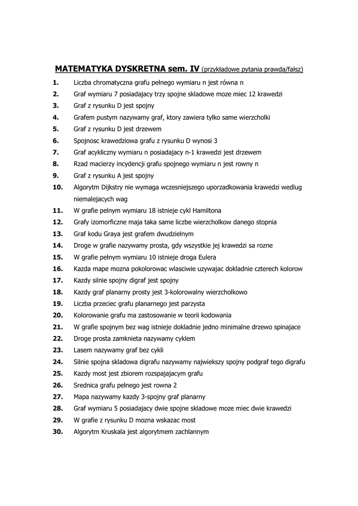 MATEMATYKA DYSKRETNA sem. IV (przykładowe pytania prawda