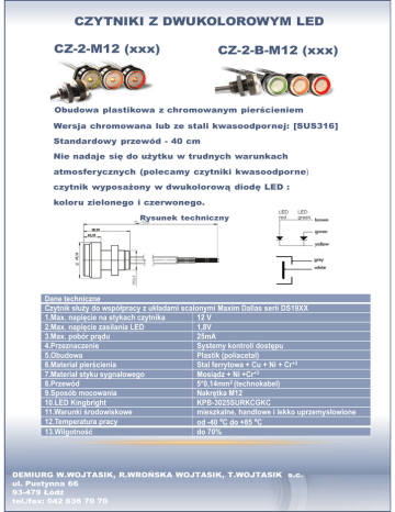 CZYTNIKI Z DWUKOLOROWYM LED 22,12 22,12 22,12 CZ-2-M12 (xxx) CZ-2-B-M12 (xxx) Obudowa plastikowa z chromowanym pierścieniem Wersja chromowana lub ze stali kwasoodpornej: [SUS316] Standardowy przewód - 40 cm Nie nadaje się do użytku w trudnych warunkach atmosferycznych (polecamy czytniki kwasoodporne) czytnik wyposażony w dwukolorową diodę LED : koloru zielonego i czerwonego. Rysunek techniczny Dane techniczne Czytnik służy do współpracy z układami scalonymi Maxim Dallas serii DS19XX 1.Max. napięcie na stykach czytnika 12 V 2.Max. napięcie zasilania LED 1,8V 3.Max. pobór prądu 25mA 4.Przeznaczenie Systemy kontroli dostępu 5.Obudowa Plastik (poliacetal) 6.Materiał pierścienia Stal ferrytowa + Cu + Ni + Cr+3 7.Materiał styku sygnałowego Mosiądz + Ni +Cr+3 8.Przewód 5*0,14mm2 (technokabel) 9.Sposób mocowania Nakrętka M12 10.LED Kingbright KPB-3025SURKCGKC 11.Warunki środowiskowe mieszkalne, handlowe i lekko uprzemysłowione 12.Temperatura pracy od -40 ºC do +85 ºC 13.Wilgotność do 70% DEMIURG W.WOJTASIK, R.WROŃSKA WOJTASIK, T.WOJTASIK s.c. ul. Pustynna 66 93-479 Łódź tel./fax: 042 636 70 70