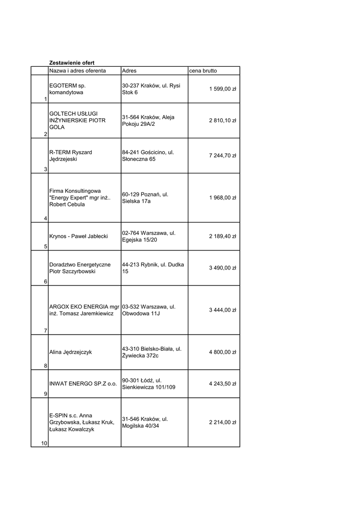 Zestawienie ofert Nazwa i adres oferenta Adres EGOTERM sp. komandytowa 30-237 Kraków, ul. Rysi Stok 6 1 599,00 zł GOLTECH USŁUGI INŻYNIERSKIE PIOTR GOLA 31-564 Kraków, Aleja Pokoju 29A/2 2 810,10 zł R-TERM Ryszard Jędrzejeski 84-241 Gościcino, ul. Słoneczna 65 7 244,70 zł Firma Konsultingowa "Energy Expert" mgr inż.. Robert Cebula 60-129 Poznań, ul. Sielska 17a 1 968,00 zł Krynos - Paweł Jabłecki 02-764 Warszawa, ul. Egejska 15/20 2 189,40 zł Doradztwo Energetyczne Piotr Szczyrbowski 44-213 Rybnik, ul. Dudka 15 3 490,00 zł cena brutto 1 2 3 4 5 6 ARGOX EKO ENERGIA mgr 03-532 Warszawa, ul. inż. Tomasz Jaremkiewicz Obwodowa 11J 3 444,00 zł 7 Alina Jędrzejczyk 43-310 Bielsko-Biała, ul. Żywiecka 372c 4 800,00 zł INWAT ENERGO SP.Z o.o. 90-301 Łódź, ul. Sienkiewicza 101/109 4 243,50 zł E-SPIN s.c. Anna Grzybowska, Łukasz Kruk, Łukasz Kowalczyk 31-546 Kraków, ul. Mogilska 40/34 2 214,00 zł 8 9 10 STUDIOV13 Paweł Niedzielski 42-215 Częstochowa, ul. Armii Krajowej 53/124 2 214,00 zł Pracownia Audytorska inż. Jacek Stępień 27-400 Ostrowiec, ul. Bławatna 22 6 150,00 zł 11 12 Edward Kusiak Przedsiębiorstwo Usługowe 43 - 346 Bielsko - Biała, Wielobranżowe ul. Bystra 44 "EGZERGIA, 13 1 463,70 zł