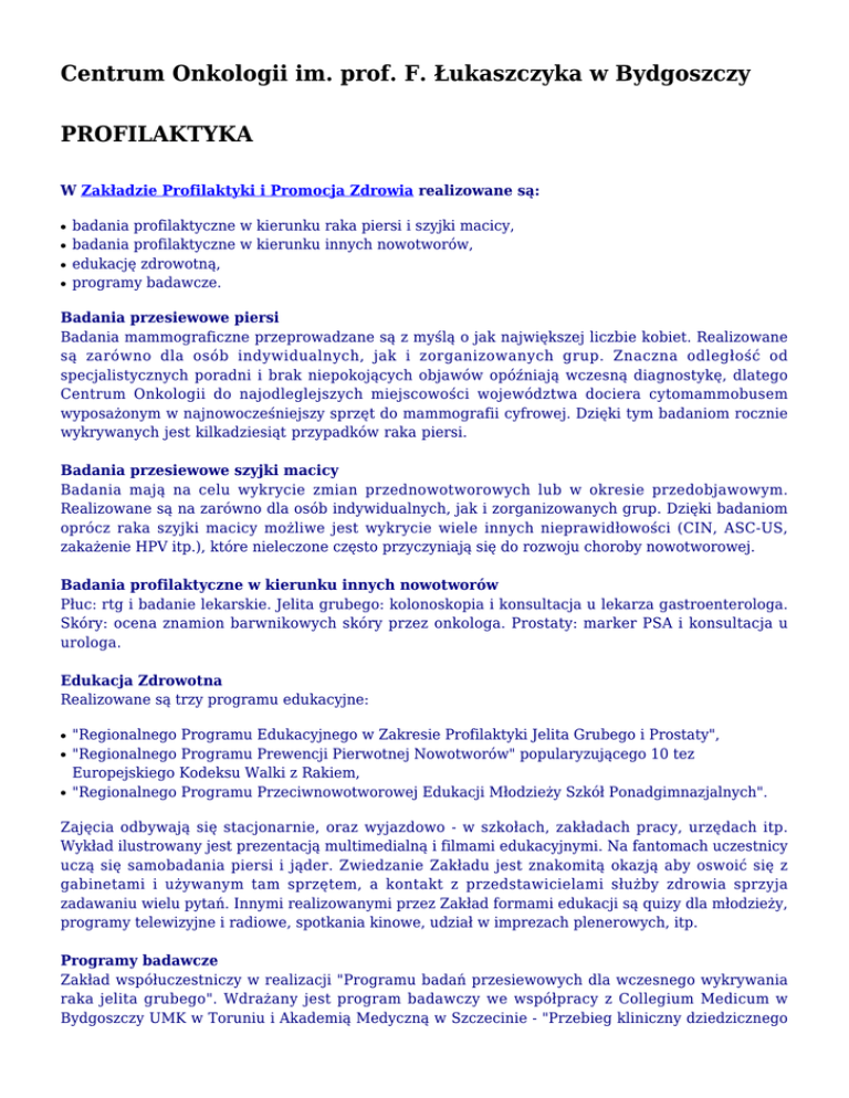 Centrum Onkologii im. prof. F. Łukaszczyka w Bydgoszczy PROFILAKTYKA W Zakładzie Profilaktyki i Promocja Zdrowia realizowane są: ● ● ● ● badania profilaktyczne w kierunku raka piersi i szyjki macicy, badania profilaktyczne w kierunku innych nowotworów, edukację zdrowotną, programy badawcze. Badania przesiewowe piersi Badania mammograficzne przeprowadzane są z myślą o jak największej liczbie kobiet. Realizowane są zarówno dla osób indywidualnych, jak i zorganizowanych grup. Znaczna odległość od specjalistycznych poradni i brak niepokojących objawów opóźniają wczesną diagnostykę, dlatego Centrum Onkologii do najodleglejszych miejscowości województwa dociera cytomammobusem wyposażonym w najnowocześniejszy sprzęt do mammografii cyfrowej. Dzięki tym badaniom rocznie wykrywanych jest kilkadziesiąt przypadków raka piersi. Badania przesiewowe szyjki macicy Badania mają na celu wykrycie zmian przednowotworowych lub w okresie przedobjawowym. Realizowane są na zarówno dla osób indywidualnych, jak i zorganizowanych grup. Dzięki badaniom oprócz raka szyjki macicy możliwe jest wykrycie wiele innych nieprawidłowości (CIN, ASC-US, zakażenie HPV itp.), które nieleczone często przyczyniają się do rozwoju choroby nowotworowej. Badania profilaktyczne w kierunku innych nowotworów Płuc: rtg i badanie lekarskie. Jelita grubego: kolonoskopia i konsultacja u lekarza gastroenterologa. Skóry: ocena znamion barwnikowych skóry przez onkologa. Prostaty: marker PSA i konsultacja u urologa. Edukacja Zdrowotna Realizowane są trzy programu edukacyjne: ● ● ● "Regionalnego Programu Edukacyjnego w Zakresie Profilaktyki Jelita Grubego i Prostaty", "Regionalnego Programu Prewencji Pierwotnej Nowotworów" popularyzującego 10 tez Europejskiego Kodeksu Walki z Rakiem, "Regionalnego Programu Przeciwnowotworowej Edukacji Młodzieży Szkół Ponadgimnazjalnych". Zajęcia odbywają się stacjonarnie, oraz wyjazdowo - w szkołach, zakładach pracy, urzędach itp. Wykład ilustrowany jest prezentacją multimedialną i filmami edukacyjnymi. Na fantomach uczestnicy uczą się samobadania piersi i jąder. Zwiedzanie Zakładu jest znakomitą okazją aby oswoić się z gabinetami i używanym tam sprzętem, a kontakt z przedstawicielami służby zdrowia sprzyja zadawaniu wielu pytań. Innymi realizowanymi przez Zakład formami edukacji są quizy dla młodzieży, programy telewizyjne i radiowe, spotkania kinowe, udział w imprezach plenerowych, itp. Programy badawcze Zakład współuczestniczy w realizacji "Programu badań przesiewowych dla wczesnego wykrywania raka jelita grubego". Wdrażany jest program badawczy we współpracy z Collegium Medicum w Bydgoszczy UMK w Toruniu i Akademią Medyczną w Szczecinie - "Przebieg kliniczny dziedzicznego raka piersi" oraz finansowany przez Min. Zdrowia "Wczesne wykrywanie nowotworów złośliwych w rodzinach wysokiego, dziedzicznie uwarunkowanego ryzyka zachorowania na raka piersi i raka jajnika" oraz ocena naukowa Programu. http://bip.co.bydgoszcz.pl/lecznictwo/profilaktyka/profilaktyka,635.html 2010 Centrum Onkologii im. prof. F. Łukaszczyka w Bydgoszczy