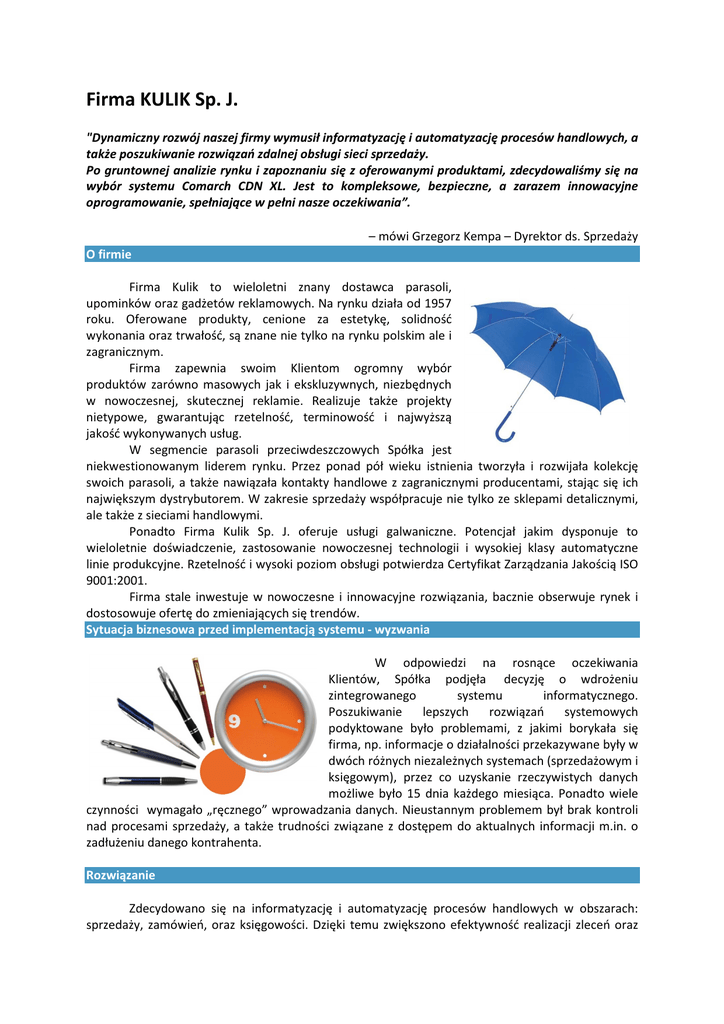 Firma KULIK Sp. J. "Dynamiczny rozwój naszej firmy wymusił informatyzację i automatyzację procesów handlowych, a także poszukiwanie rozwiązań zdalnej obsługi sieci sprzedaży. Po gruntownej analizie rynku i zapoznaniu się z oferowanymi produktami, zdecydowaliśmy się na wybór systemu Comarch CDN XL. Jest to kompleksowe, bezpieczne, a zarazem innowacyjne oprogramowanie, spełniające w pełni nasze oczekiwania”. – mówi Grzegorz Kempa – Dyrektor ds. Sprzedaży O firmie Firma Kulik to wieloletni znany dostawca parasoli, upominków oraz gadżetów reklamowych. Na rynku działa od 1957 roku. Oferowane produkty, cenione za estetykę, solidność wykonania oraz trwałość, są znane nie tylko na rynku polskim ale i zagranicznym. Firma zapewnia swoim Klientom ogromny wybór produktów zarówno masowych jak i ekskluzywnych, niezbędnych w nowoczesnej, skutecznej reklamie. Realizuje także projekty nietypowe, gwarantując rzetelność, terminowość i najwyższą jakość wykonywanych usług. W segmencie parasoli przeciwdeszczowych Spółka jest niekwestionowanym liderem rynku. Przez ponad pół wieku istnienia tworzyła i rozwijała kolekcję swoich parasoli, a także nawiązała kontakty handlowe z zagranicznymi producentami, stając się ich największym dystrybutorem. W zakresie sprzedaży współpracuje nie tylko ze sklepami detalicznymi, ale także z sieciami handlowymi. Ponadto Firma Kulik Sp. J. oferuje usługi galwaniczne. Potencjał jakim dysponuje to wieloletnie doświadczenie, zastosowanie nowoczesnej technologii i wysokiej klasy automatyczne linie produkcyjne. Rzetelność i wysoki poziom obsługi potwierdza Certyfikat Zarządzania Jakością ISO 9001:2001. Firma stale inwestuje w nowoczesne i innowacyjne rozwiązania, bacznie obserwuje rynek i dostosowuje ofertę do zmieniających się trendów. Sytuacja biznesowa przed implementacją systemu - wyzwania W odpowiedzi na rosnące oczekiwania Klientów, Spółka podjęła decyzję o wdrożeniu zintegrowanego systemu informatycznego. Poszukiwanie lepszych rozwiązań systemowych podyktowane było problemami, z jakimi borykała się firma, np. informacje o działalności przekazywane były w dwóch różnych niezależnych systemach (sprzedażowym i księgowym), przez co uzyskanie rzeczywistych danych możliwe było 15 dnia każdego miesiąca. Ponadto wiele czynności wymagało „ręcznego” wprowadzania danych. Nieustannym problemem był brak kontroli nad procesami sprzedaży, a także trudności związane z dostępem do aktualnych informacji m.in. o zadłużeniu danego kontrahenta. Rozwiązanie Zdecydowano się na informatyzację i automatyzację procesów handlowych w obszarach: sprzedaży, zamówień, oraz księgowości. Dzięki temu zwiększono efektywność realizacji zleceń oraz usprawniono proces obsługi klientów. Ponadto dynamiczny rozwój wymusił poszukiwanie rozwiązań zdalnej obsługi sieci sprzedaży do klientów korporacyjnych, w oparciu o elektroniczną platformę współpracy B2B Pulpit Kontrahenta. Po bliższej obserwacji rynku i zapoznaniu się z oferowanymi produktami zdecydowano się na wybór systemu Comarch CDN XL. Jest to kompletne, nowoczesne oprogramowanie, bardzo proste w obsłudze, funkcjonalne, z przejrzystym interfejsem. Wdrożenie systemu firma Kulik powierzyła Platynowemu Partnerowi Comarch - Infortes Sp. z o.o., z siedzibą we Wrocławiu. Dzięki sprawnemu działaniu oraz doświadczeniu jej konsultantów, prace wdrożeniowe przebiegły szybko, sprawnie i efektywnie. Dzięki szerokim możliwościom oraz bogatej funkcjonalności system został dostosowany do indywidualnych potrzeb, spełniając w pełni oczekiwania. Od 2011 roku system CDN XL obsługuje jednocześnie 17 aktywnych użytkowników. Do codziennej pracy wykorzystywane są moduły: Handel – Sprzedaż, Zamówienia, CRM, Pulpit Kontrahenta, Księgowość, HR Płace i Kadry, Środki Trwałe, ECOD. Korzyści Kompleksowo wdrożony przez firmę Infortes system Comarch CDN XL, przyniósł Spółce wiele wymiernych korzyści, takich jak: • bieżące rozliczanie wyników z poszczególnych działów, • integrację w systemie danych z trzech prowadzonych przez firmę działalności, • efektywniejszą kontrolę należności i zmniejszenie zaległości płatniczych klientów o ok. 30%. Ponadto dzięki rozbudowanym raportom oraz analizom, udostępnionym w Comarch CDN XL, Spółka uzyskała znacznie większy dostęp do informacji sprzedażowych, z możliwością generowania zestawień transakcji z podziałem na regiony, miasta czy województwa. Zaimplementowane rozwiązanie informatyczne znacząco usprawniło obsługę zamówień do dostawców, odczuwalnie dla obu stron. Dzięki mechanizmom elektronicznej wymiany danych nastąpiła redukcja czasu poświęconego na obsługę zamówień o ok. 40%, całkowicie eliminując błędy. Niezwykle przydatnym modułem wykorzystywanym w codziennej pracy przez pracowników firmy okazał się Mobilny Sprzedawca. Jest to kompleksowe narzędzie dające możliwość dostępu w każdym miejscu i o każdej porze do wszystkich niezbędnych informacji. Wyeliminowane zostały czynności ponownego wprowadzania danych z dokumentów handlowych, bardzo upraszczając proces obsługi Klienta. Kadra zarządzająca uzyskała tym samym pełną informację na temat prowadzonych działań mobilnych przedstawicieli handlowych, a także monitoring realizacji założonych planów sprzedaży. "Optymalnie dostosowany do naszych potrzeb system Comarch CDN XL umożliwia pracę na jednolitej bazie danych, zawierającej dane kontrahentów, towarów, dokumentów handlowych wewnętrznych i magazynowych. Mamy dostęp do aktualnych informacji, bieżących raportów, lepiej kontrolujemy płatności oraz efektywniej organizujemy politykę handlową, zachowując gwarancję bezpieczeństwa danych. System Comarch CDN XL to kompletne i nowoczesne narzędzie wspomagające pracę w przedsiębiorstwie”. – podsumowuje Grzegorz Ke