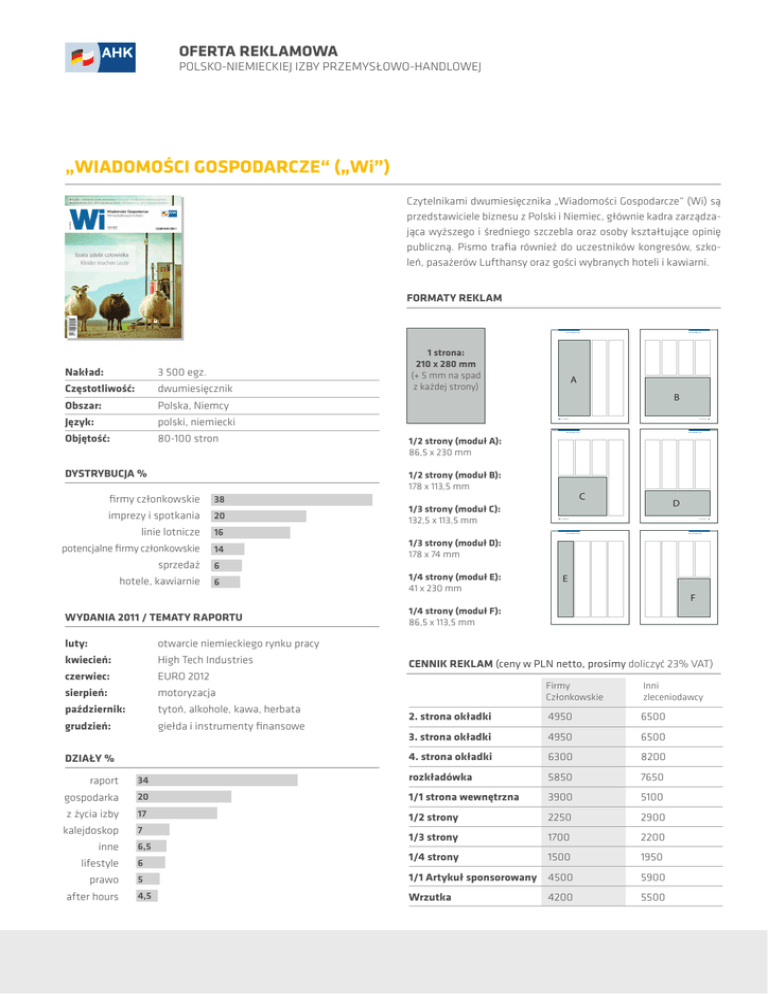 OFERTA REKLAMOWA POLSKO-NIEMIECKIEJ IZBY PRZEMYSŁOWO-HANDLOWEJ Czytelnikami dwumiesięcznika „Wiadomości Gospodarcze“ (Wi) są przedstawiciele biznesu z Polski i Niemiec, głównie kadra zarządzająca wyższego i średniego szczebla oraz osoby kształtujące opinię publiczną. Pismo trafia również do uczestników kongresów, szkoleń, pasażerów Lufthansy oraz gości wybranych hoteli i kawiarni. FORMATY REKLAM Nakład: 3 500 egz. Częstotliwość: dwumiesięcznik Obszar: Polska, Niemcy Język: polski, niemiecki Objętość: 80-100 stron DYSTRYBUCJA % A B 1/2 strony (moduł A): 86,5 x 230 mm 1/2 strony (moduł B): 178 x 113,5 mm firmy członkowskie 38 imprezy i spotkania 20 linie lotnicze 16 potencjalne firmy członkowskie 14 sprzedaż 6 hotele, kawiarnie 6 WYDANIA 2011 / TEMATY RAPORTU luty: otwarcie niemieckiego rynku pracy kwiecień: High Tech Industries czerwiec: EURO 2012 sierpień: motoryzacja październik: tytoń, alkohole, kawa, herbata grudzień: giełda i instrumenty finansowe DZIAŁY % 1 strona: 210 x 280 mm (+ 5 mm na spad z każdej strony) C D 1/3 strony (moduł C): 132,5 x 113,5 mm 1/3 strony (moduł D): 178 x 74 mm 1/4 strony (moduł E): 41 x 230 mm E F 1/4 strony (moduł F): 86,5 x 113,5 mm CENNIK REKLAM (ceny w PLN netto, prosimy doliczyć 23% VAT) Firmy Członkowskie Inni zleceniodawcy 2. strona okładki 4950 6500 3. strona okładki 4950 6500 4. strona okładki 6300 8200 raport 34 rozkładówka 5850 7650 gospodarka 20 1/1 strona wewnętrzna 3900 5100 z życia izby 17 1/2 strony 2250 2900 kalejdoskop 7 1/3 strony 1700 2200 inne 6,5 lifestyle 6 1/4 strony 1500 1950 prawo 5 1/1 Artykuł sponsorowany 4500 5900 4,5 Wrzutka 5500 after hours 4200 OFERTA REKLAMOWA POLSKO-NIEMIECKIEJ IZBY PRZEMYSŁOWO-HANDLOWEJ W wersji polskiej zamieszczamy informacje o polsko-niemieckich relacjach gospodarczych, aktualnościach AHK Polska i najciekawszych wydarzeniach na rynku niemieckim. Wersja niemiecka zawiera pogłębione informacje o rynku polskim. Reklama w Newsletterze może mieć zarówno formę banneru jak i tekstu sponsorowanego. forma reklamy: Banner 485 x 65 px, (JPG, GIF) lub artykuł sponsorowany liczba czytelników: 13 000 częstotliwość: miesięcznik forma Newslettera: mail, HTML CENA ZA REKLAMĘ W JEDNYM WYDANIU I JEDNEJ WERSJI JĘZYKOWEJ (ceny w PLN netto, prosimy doliczyć 23% VAT) Firmy Członkowskie Inni zleceniodawcy Newsletter 1200 1650 wymiary Banneru: 750 x 100 px waga: do 100 kB. formaty: JPEG, GIF, FLASH liczba unikalnych użytkowników rocznie: 170 000 liczba odwiedzanych stron rocznie: 2 000 000 CENA ZA 5.000 ODSŁON (ceny w PLN netto, prosimy doliczyć 23% VAT) Bannery pojawią się zamiennie. 5 tys. odsłon wystarcza na ok. 2 tygodnie. Firmy Członkowskie Inni zleceniodawcy Banner 700 1000 wymiary Banneru: waga: 750 x 100 px, (JPG, GIF) do 100 kB. liczba unikalnych użytkowników rocznie: 179 000 liczba odwiedzanych stron rocznie: 398 963 CENA ZA 5.000 ODSŁON (ceny w PLN netto, prosimy doliczyć 23% VAT) Bannery pojawią się zamiennie. 5 tys. odsłon wystarcza na ok. 2 tygodnie. Banner Firmy Członkowskie Inni zleceniodawcy 750 1000 OFERTA REKLAMOWA POLSKO-NIEMIECKIEJ IZBY PRZEMYSŁOWO-HANDLOWEJ Sprawozdanie Roczne podsumowujące działalność Polsko-Niemieckiej Izby Przemysłowo-Handlowej ukaże się na początku kwietnia. Publikacja zostanie rozesłana do tysiąca firm zrzeszonych w naszej Izbie wraz z kwietniowym wydaniem magazynu „Wi” oraz będzie rozprowadzana przez pracowników Izby podczas wszystkich organizowanych przez nas szkoleń, konferencji i spotkań z prasą. Sprawozdanie będzie nam towarzyszyć przez kolejne 12 miesięcy jako wizytówka naszej działalności oraz firm, które się w nim prezentują. Termin rezerwacji powierzchni reklamowej upływa z dniem 10 marca. FORMATY REKLAM 1 strona: 210 x 280 mm (+ 5 mm na spad z każdej strony) CENNIK REKLAM (ceny w PLN, prosimy doliczyć 23% VAT) B A 2/3 strony (moduł A): 129 x 280 mm (+ 5 mm na spad z każdej strony) 1/3 strony (moduł B): 62 x 280 mm (+ 5 mm na spad z każdej strony) 1/2 strony (moduł C): 210 x 140 mm (+ 5 mm na spad z każdej strony) C D Firmy Członkowskie Inni zleceniodawcy 2. strona okładki 4500 5850 3. strona okładki 4500 5850 4. strona okładki 5700 7400 1/1 strona wewnętrzna 3500 4550 2/3 strony 2400 3150 1/2 strony 1990 2600 1/3 strony 1500 1950 1/4 strony 1350 1755 1/1 Artykuł sponsorowany 3990 5200 Wrzutka 4940 3800 1/4 strony (moduł D): 210 x 71 mm (+ 5 mm na spad z każdej strony) WYDAWCA KONTAKT REKLAMA Polsko-Niemiecka Izba Przemysłowo-Handlowa Danuta Kwasek ul. Miodowa 14 e-mail: [email protected] 00-246 Warszawa tel. +48 (22) 53 10 521, 53 10 500, fax +48 (22) 53 10 677 tel. +48 (22) 53 10 500, fax +48 (22) 53 10 600 KONTAKT PRENUMERATA „WI” www.ahk.pl Cecylia Kosmalska e-mail: [email protected] tel. +48 (22) 53 10 522, 53 10 500, fax +48 (22) 53 10 677 ZAMÓWIENIE REKLAMY „WIADOMOŚCI GOSPODARCZE”(„Wi”) Wydanie: Cena (PLN netto): FORMAT: luty kwiecień czerwiec sierpień październik grudzień ______________ 2. strona okładki 3. strona okładki 4. strona okładki 1/1 cała strona 1/2 strony rok ______________ SPRAWOZDANIE ROCZNE NEWSLETTER AHK POLSKA BANNER NA STRONIE WWW.AHK.PL BANNER NA STRONIE WWW.MARKTPLATZ.PL 1/3 strony 1/4 strony ogłoszenie drobne art. sponsorowany wrzutka Cena (PLN netto): FORMAT: _______________ 2. strona okładki 3. strona okładki 4. strona okładki 1/1 cała strona 2/3 strony 1/2 strony 1/3 strony 1/4 strony art. sponsorowany wrzutka Miesiąc, rok: Cena (PLN netto): FORMA REKLAMY: WERSJA JĘZYKOWA: _______________ _______________ Banner Artykuł sponsorowany polska niemiecka Od /Do Cena (PLN netto): _______________ _______________ Od /Do Cena (PLN netto): _______________ _______________ ZLECENIODAWCA NAZWA FIRMY: ADRES: NIP: Imię i nazwisko osoby odpowiedzialnej: TEL. FAX e-mail: Nr karty członkowskiej: Gotowa reklama zostanie dostarczona do dnia: na adres: Polsko-Niemiecka Izba Przemysłowo-Handlow