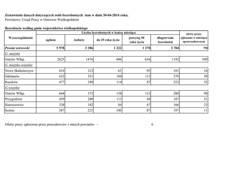 Zestawienie danych dotyczących osób bezrobotnych stan w dniu 30-04-2014 roku. Powiatowy Urząd Pracy w Ostrowie Wielkopolskim Bezrobocie wedáug gmin województwa wielkopolskiego Liczba bezrobotnych w koĔcu miesiąca Wyszczególnienie Powiat ostrowski ogóáem do 25 roku Īycia kobiety powyĪej 50 roku Īycia dáugotrwale bezrobotni oferty pracy zgáoszone w miesiącu sprawozdawczym 5 978 3 386 1 222 1 278 2 704 758 2625 1476 406 634 1192 509 Nowe Skalmierzyce 416 212 63 95 181 16 Odolanów 632 351 184 112 279 50 Raszków 477 288 114 87 222 32 Ostrów Wlkp. 644 372 158 112 280 90 Przygodzice 459 280 113 84 187 21 Sieroszewice 338 182 84 67 166 23 SoĞnie 387 225 100 87 197 11 G. miejska Ostrów Wlkp. G. miejsko-wiejskie G.wiejskie 752 Oferty pracy zgáoszone przez pracodawców z innych powiatów - 6