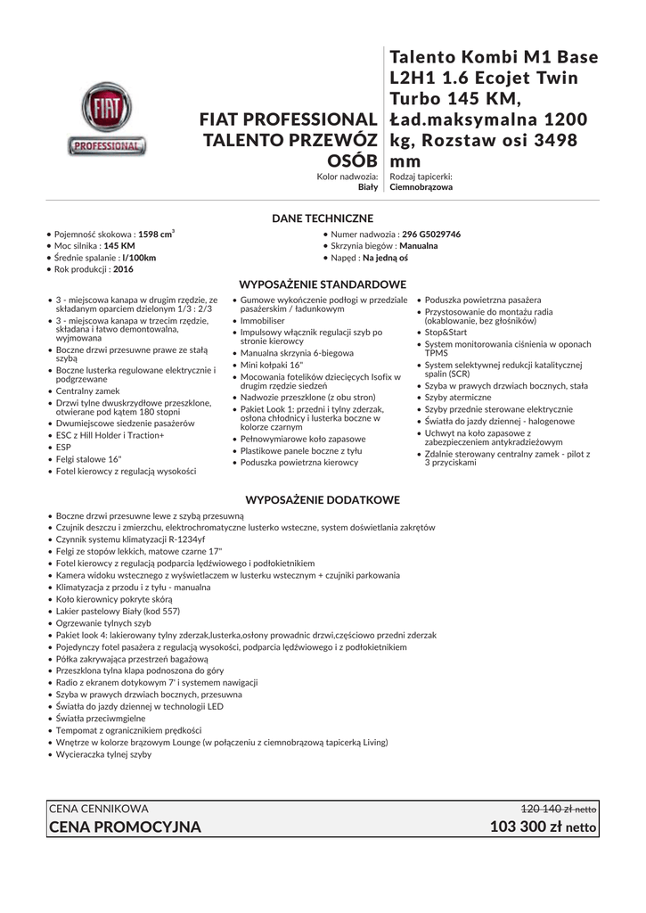 Talento Kombi M1 Base L2H1 1.6 Ecojet Twin Turbo 145 KM, FIAT PROFESSIONAL Ład.maksymalna 1200 TALENTO PRZEWÓZ kg, Rozstaw osi 3498 OSÓB mm Kolor nadwozia: Biały Rodzaj tapicerki: Ciemnobrązowa DANE TECHNICZNE • Pojemność skokowa : 1598 cm3 • Moc silnika : 145 KM • Średnie spalanie : l/100km • Rok produkcji : 2016 • Numer nadwozia : 296 G5029746 • Skrzynia biegów : Manualna • Napęd : Na jedną oś WYPOSAŻENIE STANDARDOWE • 3 - miejscowa kanapa w drugim rzędzie, ze składanym oparciem dzielonym 1/3 : 2/3 • 3 - miejscowa kanapa w trzecim rzędzie, składana i łatwo demontowalna, wyjmowana • Boczne drzwi przesuwne prawe ze stałą szybą • Boczne lusterka regulowane elektrycznie i podgrzewane • Centralny zamek • Drzwi tylne dwuskrzydłowe przeszklone, otwierane pod kątem 180 stopni • Dwumiejscowe siedzenie pasażerów • ESC z Hill Holder i Traction+ • ESP • Felgi stalowe 16" • Fotel kierowcy z regulacją wysokości • Gumowe wykończenie podłogi w przedziale pasażerskim / ładunkowym • Immobiliser • Impulsowy włącznik regulacji szyb po stronie kierowcy • Manualna skrzynia 6-biegowa • Mini kołpaki 16" • Mocowania fotelików dziecięcych Isofix w drugim rzędzie siedzeń • Nadwozie przeszklone (z obu stron) • Pakiet Look 1: przedni i tylny zderzak, osłona chłodnicy i lusterka boczne w kolorze czarnym • Pełnowymiarowe koło zapasowe • Plastikowe panele boczne z tyłu • Poduszka powietrzna kierowcy • Poduszka powietrzna pasażera • Przystosowanie do montażu radia (okablowanie, bez głośników) • Stop&Start • System monitorowania ciśnienia w oponach TPMS • System selektywnej redukcji katalitycznej spalin (SCR) • Szyba w prawych drzwiach bocznych, stała • Szyby atermiczne • Szyby przednie sterowane elektrycznie • Światła do jazdy dziennej - halogenowe • Uchwyt na koło zapasowe z zabezpieczeniem antykradzieżowym • Zdalnie sterowany centralny zamek - pilot z 3 przyciskami WYPOSAŻENIE DODATKOWE • • • • • • • • • • • • • • • • • • • • • Boczne drzwi przesuwne lewe z szybą przesuwną Czujnik deszczu i zmierzchu, elektrochromatyczne lusterko wsteczne, system doświetlania zakrętów Czynnik systemu klimatyzacji R-1234yf Felgi ze stopów lekkich, matowe czarne 17" Fotel kierowcy z regulacją podparcia lędźwiowego i podłokietnikiem Kamera widoku wstecznego z wyświetlaczem w lusterku wstecznym + czujniki parkowania Klimatyzacja z przodu i z tyłu - manualna Koło kierownicy pokryte skórą Lakier pastelowy Biały (kod 557) Ogrzewanie tylnych szyb Pakiet look 4: lakierowany tylny zderzak,lusterka,osłony prowadnic drzwi,częściowo przedni zderzak Pojedynczy fotel pasażera z regulacją wysokości, podparcia lędźwiowego i z podłokietnikiem Półka zakrywająca przestrzeń bagażową Przeszklona tylna klapa podnoszona do góry Radio z ekranem dotykowym 7' i systemem nawigacji Szyba w prawych drzwiach bocznych, przesuwna Światła do jazdy dziennej w technologii LED Światła przeciwmgielne Tempomat z ogranicznikiem prędkości Wnętrze w kolorze brązowym Lounge (w połączeniu z ciemnobrązową tapicerką Living) Wycieraczka tylnej szyby CENA CENNIKOWA CENA PROMOCYJNA 120 140 zł netto 103 300 zł netto Raty skalkulowane dla pojazdów objętych promocją Leasing PRO. Promocja ważna przy skorzystaniu z ubezpieczenia GAP oferowanego przez FCA Leasing Polska Sp. z o.o., którego składka zostanie doliczona do rat leasingowych. Usługa leasingu skierowana jest wyłącznie do przedsiębiorców. Okres gwarancji „Maximum Care” oferowany przez FCA Poland S.A., w ramach promocji Leasing PRO jest uzależniony od modelu pojazdu i zgodny z informacją poniżej. Dla modeli Fiorino i Doblo Cargo: Gwarancja "Maximum Care" 4 lata 120.000 km obejmuje 2 lata gwarancji kontraktowej i 2 lata gwarancji dodatkowej z limitem przebiegu całkowitego 120.000 km. Dla modeli Talento i Ducato: Gwarancja "Maximum Care" 4 lata 160.000 km obejmuje 2 lata gwarancji kontraktowej i 2 lata gwarancji dodatkowej z limitem przebiegu całkowitego 160.000 km. Dla modelu Fullback: Gwarancja "Maximum Care" 5 lat 150.000 km obejmuje 3 lata gwarancji kontraktowej i 2 lata gwarancji dodatkowej z limitem przebiegu całkowitego 150.000 km. Oferta dotyczy samochodów z rocznika produkcji 2016. Ilość samochodów ograniczona. Niniejsze ogłoszenie jest wyłącznie informacją handlową i nie stanowi oferty w myśl art. 66, § 1. Kodeksu Cywilnego. Sprzedający nie odpowiada za ewentualne błędy lub nieaktualność ogłoszenia.