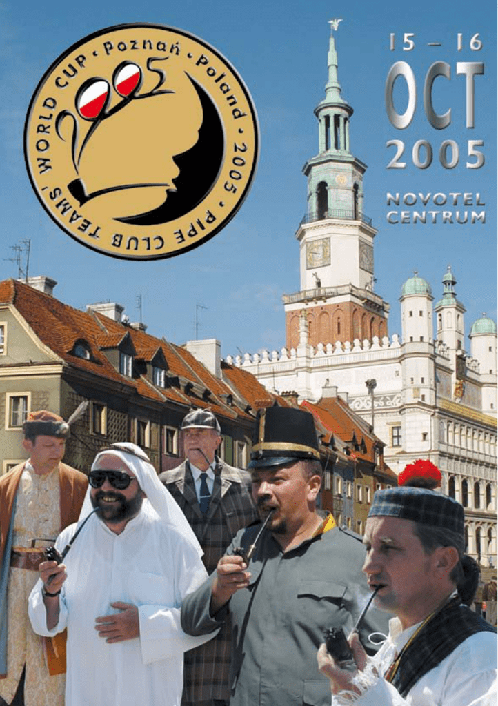 XI Pipe Club Teams’ World Cup • Poznań 2005 Drodzy przyjaciele z 4 stron świata, w tym roku wielu z was zawita poraz pierwszy do Polski, by wspólnie wypalić fajkę według reguł CIPC. 2005 jest rokiem szczególnym dla polskich fajczarzy. Po wielu staraniach i przygotowaniach, których początek datuje się na 1996, będziemy brać udział w XI Pucharze Świata Drużyn Klubów Fajkowych, a pierwszym zorganizowanym na ziemiach polskich. Ruch fajczarski w Polsce ma 31 lat. Pierwsze Mistrzostwa Polski wg reguł CIPC zostały przeprowadzone 25 maja 1974 roku w Szczecinie. Cztery lata później, 7 października 1978 roku w Bremie podczas obrad CIPC polskie kluby fajkowe zostały przyjęte w poczet członków CIPC. Wybór Poznania na miejsce tych prestiżowych zawodów to decyzja przemyślana. KKF Poznań od 1997 roku nieprzerwanie co roku organizuje najbardziej popularne w Polsce międzynarodowe zawody o Puchar Novotelu, w których udział bierze około 100 fajczarzy z Polski i zagranicy. Poznań ma odpowiednią bazę noclegową i doskonałe połączenia z największymi miastami Europy. W tym miejscu chciałbym wyrazić gorące podziękowania firmom, bez których Puchar Świata nie mógłby być zorganizowany. Wielkie brawa należą się Sponsorowi Głównemu Orlik Tobacco Company A/S i jego przedstawicielowi Scandinavian Tobacco S.A., Sponsorowi strategicznemu hotelowi Novotel Centrum w Poznaniu, który użyczył miejca imprezie, Henrykowi Worobcowi, który wykonał przepiękną fajkę konkursową, magazynowi Tobacco Polska za wsparcie miedialne i wielu innym firmom wymienionym na stronie sponsorskiej tego biuletynu. Liczę, że wszyscy z was odczują tradycyjną gościnność mieszkańców Poznania i będą dobrze się bawić. Wszystkim życzę jak najlepszych rezultatów i niezapomnianych wrażeń. Henryk Rogalski Prezydent RPKF Dear friends from all over the world, This year you are welcomed for the first time to Poland in order to smoke a pipe together according to the rules of CIPC. The 2005 is a particular year for the Polish pipe’s smokers. After numerous efforts that have been made since 1996 we will take part in The 11-th Pipe Club Teams’ World Cup, which is organized for the first time in Poland. The pipe’s movement in Poland has already 31 years. The first Pipe World Cup was organized on May 25th ,1974 in Szczecin. Four years later on September 7th, 1978 in Brema during the summit of CIPC the Polish pipe clubs were admitted to CIPC. The choice of Poznań as a place of this prestigious competition was a through decision. It is since 1997 that KKF has been annually organizing Novotel’s Cup, the most popular pipe competition in Poland, in which about 100 competitors from Poland and abroad takes part. Poznań is the city that offers an excellent ac- commodation and has good connections with the biggest cities of Europe. At this point I would like to express my greatest thanks to the companies, without which it would not be possible to organize this World Cup. A great applause is due to the main sponsor Orlik Tobacco Company and its representative Scandinavian Tobacco as well as to the strategic sponsor the hotel Novotel Centrum in Poznań, on which premises the World Cup takes place. I would also like to thank Mr Henryk Worobiec, who manufactured the beautiful competition pipe, Tobacco Poland magazine for their support in media and to all the companies enumerated on the sponsor’s page in this bulletin. I hope that all of you will enjoy the traditional Poznań hospitality and will spend a good time here. wish all of you the best results and unforgettable impressions from your stay here. Henryk Rogalski President of RPKF Chers amis de tous les coins du monde, Cette année la plupart de vous sera pur la première fois en Pologne pour fumer la pipe ensemble, selon les règles de CIPC. L’an 2005 est une année particuliere pour beaucoup entre nous. Après les efforts et preparations qui ont commence en 1996 nous allons participer aux IX- ème Coupe du Monde des Pipe Clubs. Le mouvement de fumeurs de pipe en Pologne a dèja 31 ans. Les première Championnats de Pologne ont eu la place le 25 Mai 1974 à Szczecin. Quartre années plus tard, le 7 octobre 1978 á Brema pendant le debat de CIPC les clubs polonais de pipes sont devenus les membres de CIPC.On n’a pas choisi Poznań par hasard. A partir de 1997 KKF Poznań organise chaque année les Championnats Internationaux de fumeurs de pipe- Novotel Cup. C’est environ 100 participants de Pologne et de l’ étranger se présentent dans cette competition. Poznań possède les excellentes conditions de logement et ade bonnes connections avec les plus grands villes de l’Europe. Je voudrais remercier toutes les entreprises sans aide desquelles il ne serait pas possible d’organiser ce championnat à organiser. Il faut applaudir le sponsor général Orlik Tobacco, son representant Scandinavian Tobacco, le sponsor stratégique l’hôtel Novotel Centrum á Poznań, qui nous a proposé une endroit agréable pour accueillir les Pipe Clubs. Je voudrais aussi bien remercier Monsieur Henryk Worobiec qui a manufacturé la pipe de concours, le magazine Tobacco Pologne pour le soutien dans la presse et toutes les autres entreprises enumerées dans la page de sponsors mise dans ce bulletin. J’espère que tout le monde va sentir l’hospitalité traditionelle de Poznań et va bien s’amuser. Je souhaite á tous les meilleurs resultats et les inoubliables impressions de votre séjour. Henryk Rogalski Le Président de RPKF XI Pipe Club Teams’ World Cup • Poznań 2005 Fajka konkursowa • Contest pipe • Pipe de concours Wymiary • Dimensions • Les dimensions Długość części wrzoścowej (główka z szyjką) • Lenght of the briar part (bowl plus shank) • Longueur de la bruyére 73 mm Wysokość główki • Height of the bowl • Hauteur du fourneau 52 mm 44 mm 20 mm 37 mm 85 mm Szerokość główki • Width of the b