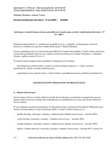 Sporządził: G. Pencuła Data sporządzenia: 2010-02-05 Osoba odpowiedzialna: Data upublicznienia: 2010-02-05 Redaktor Biuletynu Joanna Tudruj Wyroby konfekcyjne dla dzieci - IV kw.2009 r. 28/2009 Informacja z kontroli bezpieczeństwa i prawidłowości oznakowania wyrobów konfekcyjnych dla dzieci - IV kw. 2009 r. Kontrolę przeprowadzono w 3 podmiotach gospodarczych, tj: w zakładzie produkcyjnym i hurtowni firmowej w Lublinie oraz placówce handlu detalicznego w Białej Podlaskiej. Ocenie organoleptycznej oraz sprawdzeniu prawidłowości oznakowania poddano 27 partii odzieży dziecięcej i niemowlęcej produkcji krajowej oraz 2 partie wyrobów pochodzących z krajów Wspólnoty, tj. Holandii i Niemiec, ogólnej wartości 9,4 tys. zł. W ramach kontroli bezpieczeństwa produktów włókienniczych do badań: - laboratoryjnych, pobrano próby z 8 partii wyrobów produkcji krajowej i z 2 partii wyrobów pochodzących z obrotu wewnątrzwspólnotowego, - organoleptycznych, pobrano próby z 7 partii odzieży wyprodukowanej przez polskich przedsiębiorców. BEZPIECZEŃSTWO PRODUKTÓW WŁÓKIENNICZYCH a) badania laboratoryjne Oceny bezpieczeństwa wyrobów odzieżowych dla dzieci dokonano na podstawie wymagań dotyczących dopuszczalnej zawartości wolnego lub uwalniającego się formaldehydu oraz amin, jak również obecności ołowiu i kadmu. W celu ustalenia zawartości formaldehydu do Specjalistycznego Laboratorium Produktów Włókienniczych i Analizy Instrumentalnej w Łodzi, przekazano próby z 4 partii wyrobów krajowych, tj.: - spodnie bawełna, wykonane z dzianiny o deklarowanym składzie surowcowym – bawełna 100%; - szorty bawełna, wykonane z dzianiny o składzie surowcowym – bawełna 100%, - spodnie chłopięce, wykonane z tkaniny o deklarowanym składzie surowcowym – bawełna 100%; - bluzkę z krótkim rękawem, wykonaną z dzianiny o składzie surowcowym – bawełna 95% i elastan 5%. 1/7 Dokument pobrany ze strony ihlublin.netbip.pl dn. 2017-01-25 12:23 W zbadanych wyrobach nie stwierdzono obecności wolnego lub uwalniającego się formaldehydu. Z uwagi na fakt, iż dla produktów włókienniczych przeznaczonych dla dzieci do 3 lat poziom wolnego lub uwalniającego się formaldehydu jest ściśle określony (nie więcej niż 20 mg/kg), od przedsiębiorców, u których pobierano próby do badań, przyjęto oświadczenia dotyczące wieku dziecka dla którego dany wyrób jest przeznaczony. Do Laboratorium w Łodzi, pobrano i przekazano próby z 6 partii produktów włókienniczych, w tym 2 partie pochodziły z obrotu wewnątrzunijnego, natomiast 4 partie wyprodukowane zostały przez podmioty krajowe. W celu ustalenia zawartości formaldehydu oraz kadmu i ołowiu badaniom poddano koszulkę (kraj pochodzenia Holandia) oraz próbki z 3 partii wyrobów krajowych, (bluzkę dziewczęcą, wykonaną z dzianiny o deklarowanym składzie surowcowym – bawełna 100%; bluzę , wykonaną z dzianiny o składzie surowcowym – bawełna 100% i koszulę chłopięcą, wykonaną z tkaniny drukowanej o deklarowanym składzie surowcowym – bawełna 100%). Analizę dopuszczalnego poziomu amin przeprowadzono w: - partii bluzek dziewczęcych pochodzących z Niemiec, - sukienkach dziewczęcych, wykonanych z tkaniny typu „sztruks” o deklarowanym składzie surowca – bawełna 98% i lycra 2%. Badania wykazały, że: - w użytych do produkcji barwnikach nie stwierdzono obecności amin aromatycznych, - zastosowane w procesie uszlachetniania przędzy substancje nie zawierały w swoim składzie formaldehydu, - w barwnikach pigmentowych zastosowanych do farbowania przędzy i drukowania wyrobu gotowego nie stwierdzono metali ciężkich: kadmu oraz ołowiu. b) badania organoleptyczne Dokonując oceny bezpieczeństwa produktów odzieżowych przeznaczonych dla dzieci do 3 lat zwracano uwagę, czy do tych wyrobów dołączone są drobne ozdoby, które podczas użytkowania mogą zostać łatwo oderwane i połknięte przez dziecko, co mogłoby spowodować jego udławienie lub uduszenie. Nieprawidłowości w wymienionym zakresie nie stwierdzono. Oceny bezpieczeństwa okryć i ubiorów dla dzieci do 14 roku życia dokonano w oparciu o postanowienia normy PN - EN 14682:2006 „Bezpieczeństwo odzieży dziecięcej – Sznury i sznurki ściągające w odzieży dziecięcej – Specyfikacja”. Badaniom w w/w zakresie poddano 7 partii okryć jesienno-zimowych dla dzieci, które zakupione zostały przez jednostkę kontrolowaną u krajowych przedsiębiorców. Oględziny wykazały, że do podkroju szyi kurtek i kombinezonów dziecięcych wszyty jest kaptur ściągany sznurkiem. Sznurek przy przesuwaniu w tunelu dopasowuje wielkość otworu kaptura do głowy dziecka, a 2/7 Dokument pobrany ze strony ihlublin.netbip.pl dn. 2017-01-25 12:23 jego końce zabezpieczone są przed strzępieniem się plastikowymi końcówkami lub węzłem. Powyższe rozwiązania konstrukcyjne zastosowano w następujących wyrobach: - 5 partiach odzieży (6 sztukach) tj.: 2 kombinezonach dziecięcym w rozmiarze 104, 2 kurtkach dziecięcych w rozmiarach 92 i 98, kurtce dziecięcej w rozmiarze 80 i kurtce dziecięcej rozm. 104, - 2 partiach okryć wierzchnich (30 sztukach), tj.: kurtkach – odzieży niemowlęcej, występujących w grupie rozmiarowej 74–86 i kurtkach występujących w grupie rozmiarowej 92–104. Wymagania w zakresie projektowania, produkowania lub dostarczania ubrań dla małych dzieci (0-7 lat) ze sznurkami ściągającymi, funkcyjnymi lub dekoracyjnymi stosowanymi w odzieży, określone są w w/w normie (pkt 3.2 stanowi, że: „ubrania przeznaczone dla małych dzieci nie powinny być projektowane, produkowane lub dostarczane ze sznurkami ściągającymi, sznurami funkcyjnymi lub dekoracyjnymi przy kapturze i na elementach osłaniających szyję”). Zaciśnięcie się sznurka kaptura wskutek przypadkowego zaczepienia o różne elementy, np. wyposażenie placu zabaw, może stanowić wysoki stopień zagrożenia zdrowia lub 
