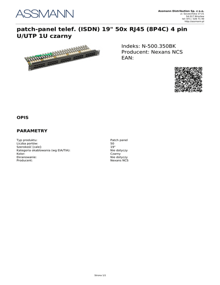 Karta produktu: patch-panel telef. (ISDN) 19" 50x RJ45