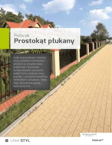 Polbruk Prostokąt płukany Urok nowoczesnej, miejskiej ulicy z wielkim rozmachem wkracza w przydomową przestrzeń. Stylistyka komponowania otoczenia wokół domu zyskuje nowy wymiar – prostota kształtów, minimalizm rozwiązań, lekka linia, stonowana paleta kolorystyczna. Polbruk Prostokąt żółty płukany 112 LINIA STYL Polbruk Prostokąt płukany Kształt | Wymiary Rodzaj wykończenia Palisada/obrzeże Palisada Ring strona 136 10×10 cm Obrzeże Palinea strona 140 20×10 cm Schody Palisada Zen strona 124 STYL grubość [cm] faktura 6 płukana 8 wymiary [cm] pojedynczy wymiar lub komplet: wykończenie kolor bez fazy szary żółty grafitowy czerwony brązowy 20×10 10×10 Murek j.m. ilość na palecie [m²] m² waga palety [kg] od 9,6 od 1 316 do 10,8 do 1 478 od 7,68 od 1 402 do 9,6 do 1 748 Palisada Zen strona 124 Produkt jest dostępny na zamówienie. Kolorystyka szary płukany żółty płukany grafitowy płukany Może Cię zainteresować Kostka Polbruk Complex strona 82 Polbruk Prostokąt strona 162 czerwony płukany brązowy płukany LINIA STYL 113