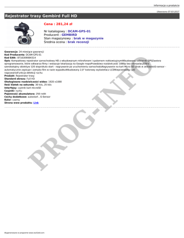 Informacje o produkcie Utworzono 07-03-2017 Rejestrator trasy Gembird Full HD Cena : 281,24 zł Nr katalogowy : DCAM-GPS-01 Producent : GEMBIRD Stan magazynowy : brak w magazynie Średnia ocena : brak recenzji PR O G -I N FO Gwarancja: 24 miesiące gwarancji Kod Producenta: DCAM-GPS-01 Kod EAN:: 8716309084314 Opis: Kompaktowy rejestrator samochodowy HD z wbudowanym mikrofonem i systemem noktowizyjnymWbudowany odbiornik GPSZawiera oprogramowanie, które odtwarza filmy i wskazuje lokalizację na Google mapsPrawdziwa rozdzielczość 1080p bez interpolacjiUltra szerokokątny obiektyw 120 stopniAuto start - nagrywanie po uruchomieniu samochoduNagrywanie na kart Micro SD (brak w zestawie)G-sensor automatycznie zapisuje i zamyka film w razie wypadkuWbudowany 2,0" kolorowy wyświetlacz LCDNieprzerwany cykl nagrywaniaFunkcja detekcji ruchu Produkt: Rejestrator trasy Standard obrazu: Full HD Obsługiwane rozdzielczości wideo: 1920 x1080 Ilość klatek na sekundę: 30 kl/s, 25 kl/s Interfejsy: czytnik kart microSD Czujniki: ruchu Pojemność akumulatora: 250 mAh Cechy dodatkowe: autostart , G-Sensor Kolor: czarny Strona www produktu: Link Wygenerowano w programie www.oscGold.com