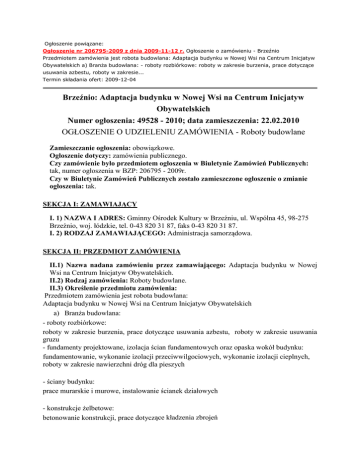 Ogłoszenie powiązane: Ogłoszenie nr 206795-2009 z dnia 2009-11-12 r. Ogłoszenie o zamówieniu - Brzeźnio Przedmiotem zamówienia jest robota budowlana: Adaptacja budynku w Nowej Wsi na Centrum Inicjatyw Obywatelskich a) BranŜa budowlana: - roboty rozbiórkowe: roboty w zakresie burzenia, prace dotyczące usuwania azbestu, roboty w zakresie... Termin składania ofert: 2009-12-04 Brzeźnio: Adaptacja budynku w Nowej Wsi na Centrum Inicjatyw Obywatelskich Numer ogłoszenia: 49528 - 2010; data zamieszczenia: 22.02.2010 OGŁOSZENIE O UDZIELENIU ZAMÓWIENIA - Roboty budowlane Zamieszczanie ogłoszenia: obowiązkowe. Ogłoszenie dotyczy: zamówienia publicznego. Czy zamówienie było przedmiotem ogłoszenia w Biuletynie Zamówień Publicznych: tak, numer ogłoszenia w BZP: 206795 - 2009r. Czy w Biuletynie Zamówień Publicznych zostało zamieszczone ogłoszenie o zmianie ogłoszenia: tak. SEKCJA I: ZAMAWIAJĄCY I. 1) NAZWA I ADRES: Gminny Ośrodek Kultury w Brzeźniu, ul. Wspólna 45, 98-275 Brzeźnio, woj. łódzkie, tel. 0-43 820 31 87, faks 0-43 820 31 87. I. 2) RODZAJ ZAMAWIAJĄCEGO: Administracja samorządowa. SEKCJA II: PRZEDMIOT ZAMÓWIENIA II.1) Nazwa nadana zamówieniu przez zamawiającego: Adaptacja budynku w Nowej Wsi na Centrum Inicjatyw Obywatelskich. II.2) Rodzaj zamówienia: Roboty budowlane. II.3) Określenie przedmiotu zamówienia: Przedmiotem zamówienia jest robota budowlana: Adaptacja budynku w Nowej Wsi na Centrum Inicjatyw Obywatelskich a) Branża budowlana: - roboty rozbiórkowe: roboty w zakresie burzenia, prace dotyczące usuwania azbestu, roboty w zakresie usuwania gruzu - fundamenty projektowane, izolacja ścian fundamentowych oraz opaska wokół budynku: fundamentowanie, wykonanie izolacji przeciwwilgociowych, wykonanie izolacji cieplnych, roboty w zakresie nawierzchni dróg dla pieszych - ściany budynku: prace murarskie i murowe, instalowanie ścianek działowych - konstrukcje żelbetowe: betonowanie konstrukcji, prace dotyczące kładzenia zbrojeń - podłogi i posadzki: kładzenie podłóg, wykonanie izolacji przeciwwilgociowych, wykonanie izolacji cieplnych, prace dotyczące kładzenia elastycznych wykładzin podłogowych, kładzenie parkietu, prace dotyczące kładzenia płytek - stolarka okienna i drzwiowa: instalowanie okien z tworzyw sztucznych, instalowanie drzwi drewnianych, instalowanie drzwi metalowych - dach: prace dotyczące wznoszenia dachów, prace dotyczące krycia dachu, prace dotyczące obróbki blacharskiej oraz kładzenia rynien, prace dotyczące wykonania izolacji termicznej, instalacja podwieszanych sufitów - tynki, ocieplenie ścian i ich malowanie: prace dotyczące wykonywania izolacji termicznej, prace dotyczące wykonywania okładziny tynkowej, roboty malarskie b) Instalacje wodno – kanalizacyjne - instalacja wodociągowa: układanie wodociągów, izolacja rurociągowa, montaż osprzętu, wykonanie próby ciśnieniowej i dezynfekcja, wykucie bruzd i zamurowanie; - instalacja kanalizacyjna: układanie rurociągów, montaż białego osprzętu, wykonanie próby szczelności, wykucie bruzd i zamurowanie; - instalacja centralnego ogrzewania: układanie rurociągów, izolacja rurociągowa, montaż zaworów i grzejników, wykonanie próby ciśnienia, płukanie instalacji, regulacja, wykucie bruzd i zamurowanie; - kotłownia: montaż kotła, połączenie z kominem, połączenie z instalacja CO, instalacja naczynia wzbiorczego, montaż pomp i osprzętu, układania rurociągów, płukanie rurociągów, próba ciśnienia na zimno i na gorąco, czyszczenie rurociągów, izolacja antykorozyjna, zakładanie izolacji termicznej, rozruch kotłowni. c) Branża elektryczna - wykonanie zasilania głównego WZL - wykonanie rozdzielni głównej RG - wykonanie rozdzielni kotłowni RK i zasilania - wykonanie instalacji gniazd - wykuwanie bruzd - układanie przewodu w bruzdach - zaprawianie bruzd - montaż gniazd - wykonanie instalacji oświetlenia - wykuwanie bruzd - układanie przewodów pod tynkiem - układanie przewodów na suficie - zaprawianie bruzd - montaż opraw i osprzętu - wykonanie instalacji odgromowej i połączeń wyrównawczych - wykonanie zwodów pionowych - wykonanie uziomu pionowego - wykonanie zwodów odprowadzających - wykonanie zacisków kontrolnych - wykonanie połączeń wyrównawczych - wykonanie szyny wyrównawczej - wykonanie szyny uziemiającej - wykonanie badań i pomiarów instalacji. Adaptacja budynku w Nowej Wsi na Centrum Inicjatyw Obywatelskich realizowana będzie w ramach środków: Programu Rozwoju Obszarów Wiejskich na lata 2007-2013 w ramach działania Odnowa i rozwój wsi. Szczegółowy opis przedmiotu zamówienia przedstawiony został w Rozdziale III SIWZ. Szczegółowy opis przedmiotu zamówienia stanowi dokumentacja projektowa i specyfikacje techniczne wykonania i odbioru robót. Kosztorysy nakładcze (ślepe) są wyłącznie elementem pomocniczym. Wykonawca wykona wszystkie roboty wynikające z dokumentacji projektowej, nawet wtedy, gdy nie zostały wcześniej ujęte w przedmiarach robót. Jeżeli gdziekolwiek w SIWZ (dokumentacji przetargowej tj. projekty budowlane, opisy techniczne, kosztorysy nakładcze i przedmiary robót) pojawia się nazwa, marka lub typ wskazujący na konkretnego producenta, to należy to interpretować, że określenie to ma jedynie charakter przykładowy, a wykonawca sporządzając ofertę może uwzględnić wyrób każdego innego producenta, który jest równoważny tzn. posiada co najmniej takie same lub korzystniejsze parametry wydajnościowe i jakościowe oraz standard wykonania w stosunku do podanych w SIWZ przykładów. Równoważność zaoferowanych materiałów i urządzeń musi być udokumentowane załączonymi do oferty obliczeniami, szczegółowymi rysunkami technicznymi, atestami PZH, aprobatami, deklaracjami zgodności, kartami katalogowymi urządzeń zamiennych. Niniejsze dokumenty muszą w sposób jednoznaczny stwierdzać równoważność proponowanych urządzeń i mat