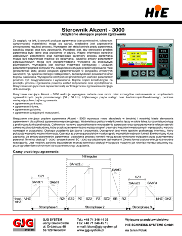 Sterownik Akzent - 3000 Urządzenie sterujące prądem zgrzewania Ze względu na fakt, iż warunki podczas zgrzewania (stan powierzchni, tolerancje, wytrzymałość materiałów) mogą się wahać, niezbędne jest zapewnienie zintegrowanej regulacji procesu. Wymagana jest stała kontrola prądu zgrzewania, spadków napięć oraz toru zgrzewania. Pożądane jest, aby sterowanie prądem zgrzewania było łatwe oraz przyjemne w użyciu. Ważne informacje odnośnie ustawionych parametrów oraz najważniejsze parametry procesu zgrzewania muszą być natychmiast możliwe do odczytania. Wszelkie zmiany parametrów zgrzewalniczych mogą być przeprowadzone wyłącznie za stosownym pozwoleniem. Wymagana jest również możliwość konfiguracji i ustawień parametrów poprzez komputer PC. Urządzenie sterujące prądem zgrzewania musi gwarantować stałą jakość połączeń zgrzewalniczych w przypadku zmiennych warunków, np. łączenia różnego rodzaju blach, zanieczyszczeń powierzchni oraz błędów pasowania. Wystąpienie odchyleń od prawidłowych wartości parametrów powinno być zasygnalizowane i wyświetlone. Błędne części konstrukcyjne na początku procesu zgrzewania powinny zostać rozpoznane oraz wyodrębnione. Urządzenie sterujące musi zapewniać stałą kontrolę procesu zgrzewania oraz jego dokumentację. Urządzenie sterujące Akzent - 3000 realizuje wymagane zadania oraz może mieć szczególne zastosowanie w urządzeniach zgrzewalniczych prądu przemiennego (50 / 60 Hz), trójfazowego prądu stałego oraz średnioczęstotliwościowego, podczas następujących rodzajów zgrzewania: zgrzewanie punktowe, zgrzewanie liniowe, zgrzewanie garbowe, zgrzewanie specjalnymi maszynami. Urządzenie sterujące prądem zgrzewania Akzent - 3000 wyznacza nowe standardy w średniej i wysokiej klasie sterowania zgrzewaniem dla aplikacji zgrzewania rezystancyjnego. Wyświetlacz graficzny użytkownika łączy w sobie łatwą i zrozumiałą obsługę z praktyczną funkcjonalnością. Całkowicie na nowo zaprojektowane wyposażenie sprzętowe oraz oprogramowanie oferuje szeroki zakres możliwości rozbudowy, który przekłada się również na wyższy stopień pewności kosztów inwestycyjnych w przypadku wzrostu wymagań w przyszłości. Obsługa urządzenia jest jasna i zrozumiała. Dostępnych jest wiele języków graficznego interfejsu, który pokazuje wszystkie ważne informacje. Operator za pomocą przycisków ma dostęp do wszystkich ważnych funkcji. Elektroniczny klucz zapewnia, że zmiany parametrów zgrzewania i ustawienia procesu kontroli mogą zostać wykonane wyłącznie przez autoryzowany personel. Terminal obsługi T - 3000 i system kontroli SC - 3000 są oddzielnymi jednostkami. Zwarta forma budowy oferuje różnorodne rozwiązania. Jest możliwy zarówno bezpośredni montaż terminalu obsługi w korpusie maszyny jak również montaż oddzielny np. poza ogrodzeniem ochronnym lub w panelu obsługi urządzenia. Czasy przebiegu zgrzewania: GJG SYSTEM Jerzy Gniewowski ul. Dróżnicza 48 52-129 Wrocław Tel.: +48 71 346 44 33 Fax: +48 71 346 45 19 e-mail: [email protected] www.gjg-system.pl Wyłączne przedstawicielstwo HIE SCHWEISS-SYSTEME GmbH na teren Polski Dane techniczne: Terminal obsługi T - 3000: wymiary (szer. x wys. x dł.) mm: 182 x 129 x 45 (bez wtyczki), alternatywnie dostępne w formacie 19'', wyświetlacz kolorowy 4,3'' TFT o rozdzielczości 480 x 274 pikseli, obsługa: sterowanie w menu za pomocą gałki lub ekranu dotykowego, ustawianie parametrów za pomocą gałki, 7 przycisków funkcyjnych do bezpośredniego wywołania najważniejszych funkcji, kontrola dostępu poprzez klucz cyfrowy, język obsługi: Niemiecki i Angielski, inne języki na zamówienie. System kontroli SC - 3000 (AC, 3 - fazowy DC lub średnioczęstotliwościowe) zawór elektromagnetyczny: 2 wyjścia zaworu, 24V DC, max. moc obciążenia 25 VA, kompensacja sieci elektrycznej: spadki napięcia w sieci od 15% do 20% są równoważone, styk przełączeniowy: dowolnie konfigurowalny, zestyk blokujący: dowolnie konfigurowalny, ilość programów: 128, możliwość rozszerzenia do 512, 50 / 60 Hz: automatyczne rozpoznanie, rodzaje pracy: pojedynczy punkt, punkt szeregowy, zgrzewanie liniowe, wejścia cyfrowe: do 20 dowolnie konfigurowalnych wejść dla: startu, kontaktu kontroli ciśnienia, OK (gotowości do pracy) oraz wejścia: z / bez prądowe, wyboru programu i zewnętrznej blokady, wyjścia cyfrowe: do 20 dowolnie konfigurowalnych wyjść dla zaworu elektromagnetycznego, zestyku blokującego, styku przełączeniowego, monitorowania błędów, licznika punktów końcowych, P2 / P3, wyjścia analogowe: 2 - 4 analogowych wyjść (0 - 10 V) do sterowania proporcjonalnym wentylem, wejścia kanałów pomiarowych: 1 analogowe wejście pomiarowe dla prądu wtórnego, 2 analogowe wejścia pomiarowe opcjonalnie dla prądu pierwotnego, napięcia, ciśnienia lub siły, 1 przyrostowe wejście pomiarowe dla pomiaru przemieszczenia (rozdzielczość 10 m), przebiegi zgrzewania: 16 przebiegów zgrzewania w tym 12 czasów trwania impulsu prądowego (patrz wykres czasów przebiegu zgrzewania), regulacja stałoprądowa pierwotna lub wtórna (opcjonalnie), dynamiczna regulacja prądu (opcjonalnie), dynamiczna regulacja napięcia (opcjonalnie), regulacja adaptacyjna (opcjonalnie), monitorowanie: kontrola sumaryczna oraz obwiedniowa dla prądu, napięcia, przemieszczenia, ciśnienia, siły odpowiednio do skonfigurowanych wielkości, interfejs PC: 100 MB Ethernet, interfejsy komunikacyjne: opcjonalnie Profibus lub Profinet, inne na zamówienie, wydatek mocy: wyjście impulsu wyzwalającego dla regulatora mocy AC i DC jak również analogowe ustawienie wartości żądanych dla średnioczęstotliwościowego inwertera, wymiary (szer. x wys. x dł.) mm: 290 x 166 x 150 (bez wtyczki). Terminal obsługi T - 3000 Kabina kontrolna GSK-680 System kontroli SC-3000 z modułem tyrystorowym TS-3 GJG SYSTEM Jerzy Gniewowski ul. Dró