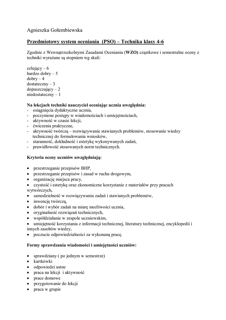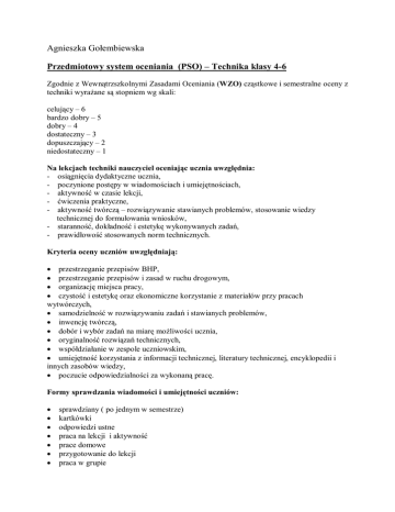 Agnieszka Gołembiewska Przedmiotowy system oceniania (PSO) – Technika klasy 4-6 Zgodnie z Wewnątrzszkolnymi Zasadami Oceniania (WZO) cząstkowe i semestralne oceny z techniki wyrażane są stopniem wg skali: celujący – 6 bardzo dobry – 5 dobry – 4 dostateczny – 3 dopuszczający – 2 niedostateczny – 1 Na lekcjach techniki nauczyciel oceniając ucznia uwzględnia: - osiągnięcia dydaktyczne ucznia, - poczynione postępy w wiadomościach i umiejętnościach, - aktywność w czasie lekcji, - ćwiczenia praktyczne, - aktywność twórczą – rozwiązywanie stawianych problemów, stosowanie wiedzy technicznej do formułowania wniosków, - staranność, dokładność i estetykę wykonywanych zadań, - prawidłowość stosowanych norm technicznych. Kryteria oceny uczniów uwzględniają: przestrzeganie przepisów BHP, przestrzeganie przepisów i zasad w ruchu drogowym, organizację miejsca pracy, czystość i estetykę oraz ekonomiczne korzystanie z materiałów przy pracach wytwórczych, samodzielność w rozwiązywaniu zadań i stawianych problemów, inwencję twórczą, dobór i wybór zadań na miarę możliwości ucznia, oryginalność rozwiązań technicznych, współdziałanie w zespole uczniowskim, umiejętność korzystania z informacji technicznej, literatury technicznej, encyklopedii i innych zasobów wiedzy, poczucie odpowiedzialności za wykonaną pracę. Formy sprawdzania wiadomości i umiejętności uczniów: sprawdziany ( po jednym w semestrze) kartkówki odpowiedzi ustne praca na lekcji i aktywność prace domowe przygotowanie do lekcji praca w grupie prowadzenie dokumentacji technicznej - zeszyt przedmiotowy, plany pracy, rysunki techniczne prace wytwórcze obowiązkowe prace dodatkowe – plakaty, prezentacje multimedialne WYMAGANIA WOBEC UCZNIA NA POSZCZEGÓLNE OCENY Ocenę celującą otrzymuje uczeń, który: posiada wiadomości i umiejętności wykraczające ponad wymagania programowe, sporządza materiały pomocne przy prowadzeniu lekcji z własnej inicjatywy, posługuje się bardzo bogatym słownictwem technicznym, czyta literaturę techniczną, samodzielnie rozwija zainteresowania techniczne, wykonuje wszystkie prace wytwórcze starannie i terminowo, wypełnia wszystkie kryteria na ocenę bardzo dobrą, jest wzorem dla innych Ocenę bardzo dobrą otrzymuje uczeń, który: ma pomysły i chętnie się nimi dzieli, pobudza innych do aktywności, przejmuje inicjatywę innych i ją realizuje, zna i rozumie wszystkie pojęcia wprowadzone na lekcji, zna i rozumie wszystkie zagadnienia poruszane na lekcji, dostrzega i formułuje problemy samodzielnie, samodzielnie tworzy uogólnienia i wyciąga wnioski, skutecznie stosuje zdobytą wiedzę w praktycznym działaniu, jest zawsze przygotowany do zajęć pod względem formalnym, właściwie stosuje normy techniczne, szczególnie w rysunku technicznym, wykonuje wszystkie prace wytwórcze starannie i terminowo, prowadzi zeszyt przedmiotowy starannie i systematycznie. Ocenę dobrą otrzymuje uczeń, który: czynnie uczestniczy w lekcji, wykonuje polecenia nauczyciela, zna i rozumie większość pojęć, zna i rozumie większość zagadnień poruszanych na lekcji, wykonuje wszystkie prace wytwórcze w terminie, z niewielkimi niedokładnościami, rysunek techniczny i zeszyt przedmiotowy nie budzą zastrzeżeń. Ocenę dostateczną otrzymuje uczeń, który: współpracuje z grupą w realizacji zadania przy wsparciu kolegów i nauczyciela, zna i rozumie podstawowe pojęcia, zna i rozumie podstawowe zagadnienia omawiane na lekcji, prawie zawsze wykonuje prace wytwórcze w terminie, z pewnymi niedokładnościami, wykonuje proste rysunki techniczne, zeszyt przedmiotowy prowadzi nie zawsze systematycznie i starannie Ocenę dopuszczającą otrzymuje uczeń, który: jest biernym uczestnikiem zajęć i nie przeszkadza w ich prowadzeniu, przy pomocy nauczyciela potrafi wyjaśnić znaczenie najprostszych pojęć, w minimalnym stopniu opanował zagadnienia poruszane na lekcji, nie zawsze stosuje normy techniczne prowadzi zeszyt przedmiotowy niesystematycznie i niestarannie wykonuje prace wytwórcze niedokładnie i nieterminowo Ocenę niedostateczną otrzymuje uczeń, który: nie włącza się w realizację zadań, przeszkadza innym w pracy, nie zna podstawowych pojęć, nie opanował w stopniu minimalnym zagadnień poruszanych na lekcji, nie potrafi wykonać prostych rysunków technicznych, nie wykonuje prac wytwórczych, nie wykonuje ćwiczeń zadanych jako praca domowa, nie prowadzi zeszytu przedmiotowego.