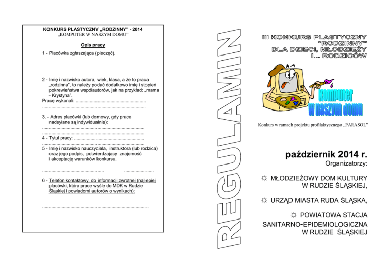 KONKURS PLASTYCZNY „RODZINNY” - 2014 „KOMPUTER W NASZYM DOMU” Opis pracy 1 - Placówka zgłaszająca (pieczęć). 2 - Imię i nazwisko autora, wiek, klasa, a że to praca „rodzinna”, to należy podać dodatkowo imię i stopień pokrewieństwa współautorów, jak na przykład: „mama - Krystyna”. Pracę wykonali: ....................................................... ................................................................................. 3. - Adres placówki (lub domowy, gdy prace nadsyłane są indywidualnie): ................................................................................ ................................................................................ 4 - Tytuł pracy: ....................................................... ................................................................................ 5 - Imię i nazwisko nauczyciela, instruktora (lub rodzica) oraz jego podpis, potwierdzający znajomość i akceptację warunków konkursu. ................................................ Konkurs w ramach projektu profilaktycznego „PARASOL” październik 2014 r. Organizatorzy: ....................... 6 - Telefon kontaktowy, do informacji zwrotnej (najlepiej placówki, która prace wyśle do MDK w Rudzie Śląskiej i powiadomi autorów o wynikach): ☼ MŁODZIEŻOWY DOM KULTURY W RUDZIE ŚLĄSKIEJ, ☼ URZĄD MIASTA RUDA ŚLĄSKA, ................................................................................... ☼ POWIATOWA STACJA SANITARNO-EPIDEMIOLOGICZNA W RUDZIE ŚLĄSKIEJ REGULAMIN KONKURSU Uwagi organizacyjne, warunki udziału w konkursie. Cele: - promocja uzdolnionych plastycznie młodych twórców, - stworzenie możliwości prezentacji, konfrontacji i wymiany doświadczeń, - propagowanie wiedzy z zakresu profilaktyki społecznej i zdrowotnej, - inicjowanie działań integrujących rodzinę, - zachęcanie rodziców do wspólnej zabawy z dzieckiem, - pobudzanie działań profilaktycznych w rodzinie i środowisku, - zachęcanie do działań w obszarze wychowania przez sztukę. O konkursie ... czyli o czym i dla kogo. Po raz trzeci zapraszamy dzieci, młodzież i... rodziców do udziału w konkursie plastycznym, który jest „inny”. Ta „inność” polega na zachęceniu do wspólnej pracy twórczej rodziców z dziećmi. Zdarza się, że w konkursach plastycznych prace młodych autorów są dyskwalifikowane z uwagi na widoczny „wkład” osoby dorosłej. W tym konkursie to jest zaleta!. Tematem pracy jest „Komputer w naszym domu”, a hasłem wiodącym „Parasol”. Parasol, to coś co chroni, a komputer? Może być bardzo przydatny w nauce, zabawie, komunikacji miedzy ludźmi, ale... I o to „ale” chodzi. Może też być niebezpieczny! Może uzależniać, zjadać czas, który powinien być poświęcony na rzeczy ważne, takie jak wspólny spacer, zabawa, czytanie prawdziwych książek, czy rozmowa. Młodzi ludzie spędzają długie godziny, brnąc w wirtualny świat, zapominają o realnym świecie. Internet jest wspaniała baza wiadomości, ale może być niewłaściwie wykorzystywany do rzeczy złych. Zbyt długie wysiadywanie przy komputerze często staje się uzależnieniem, chorobą, którą trzeba leczyć (tak dzieje się w wielu krajach). - To co mamy przedstawić w naszej pracy? Sądzimy, że właściwym tropem będzie wykonanie rodzaju ulotki, plakatu, na którym pokażemy, co dobrego daje obcowanie z komputerem, ale też jakie niesie zagrożenia. Potrzebna jest pomoc osoby dorosłej (chcemy, aby była widoczna), ale „ręka” dziecka też powinna być widoczna. Najlepsze prace nagrodzimy i sporządzimy plakat lub ulotkę , którą rozpowszechnimy po konkursie. Kategorie wiekowe: (w każdej kategorii autor + członek rodziny. Autorów może być kilku). Wychowankowie przedszkoli Uczniowie klas I do III, Uczniowie klas IV do VI, Uczniowie gimnazjów. Termin nadsyłania prac: do 18 października 2014 r., na adres: Młodzieżowy Dom Kultury w Rudzie Śląskiej 41-700 Ruda Śląska ul. Janasa 28 (tel. 2 48 13 46 lub 2 43 22 20) Uwagi: Uczestniczą wyłącznie prace wspólne (autor + starszy członek rodziny (mama, tata, brat, siostra, ciocia lub dziadek). 1/ Ilość prac: jedna praca z jednej rodziny; Ilość prac z jednej placówki - bez limitu ilościowego (placówka może zebrać prace rodzinne i dostarczyć zbiorowo). Format dowolny. 2/ Zalecamy techniki płaskie. Prace wykorzystujące materiały typu plastelina, wyklejanki bibułą (i tym podobne) łatwo ulegają uszkodzeniu, deformacji, a to utrudnia ocenę i ekspozycję prac. Dopuszczamy małe prace przestrzenne w rodzaju makiety (odpowiednio zapakowane (dostarczone). Nagrody, jury, finał: 1/ W każdej z kategorii wiekowej przyznane zostaną atrakcyjne nagrody i wyróżnienia. Prace oceni i wyłoni laureatów konkursu jury powołane przez organizatorów. Decyzje jury są niepodważalne. 2/ Uroczystość wręczenia nagród i otwarcie wystawy pokonkursowej: 12 listopada, podczas Gali finałowej Konkursu Piosenki Pozytywnej i Konkursu plastycznego. Uczestnicy konkursu (placówki) zostaną powiadomieni telefonicznie o wynikach oraz terminie i miejscu uroczystości. Opis prac: Prace należy opisać na odwrocie pracy, według wzoru: 1 - Placówka zgłaszająca (pieczęć). 2 - Imię i nazwisko autora, wiek, klasa, a że to praca „rodzinna”, to należy podać dodatkowo imię i stopień pokrewieństwa współautorów, jak na przykład: „mama - Krystyna”. 3 - Adres placówki (lub domowy, gdy prace nadsyłane są indywidualnie). 4 - Tytuł pracy. 5 - Imię i nazwisko nauczyciela, instruktora (lub rodzica) oraz jego podpis, potwierdzający znajomość i akceptację warunków konkursu. 6 - Telefon kontaktowy, do informacji zwrotnej (najlepiej placówki, która prace wyśle do MDK w Rudzie Śląskiej i powiadomi autorów o wynikach). Uwagi dotyczące przepisów prawa autorskiego i ochrony danych osobowych: 1. Nadesłane prace - oryginały - przechodzą na własn