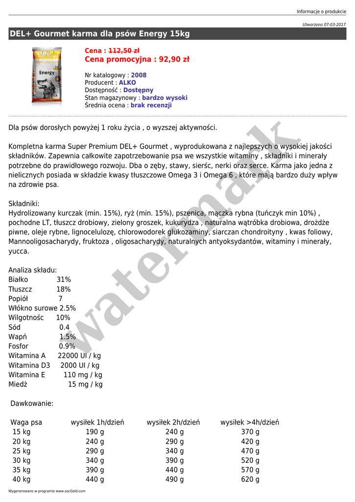 Informacje o produkcie Utworzono 07-03-2017 DEL+ Gourmet karma dla psów Energy 15kg Cena : 112,50 zł Cena promocyjna : 92,90 zł Nr katalogowy : 2008 Producent : ALKO Dostępność : Dostępny Stan magazynowy : bardzo wysoki Średnia ocena : brak recenzji er m ar k Dla psów dorosłych powyżej 1 roku życia , o wyzszej aktywności. Kompletna karma Super Premium DEL+ Gourmet , wyprodukowana z najlepszych o wysokiej jakości składników. Zapewnia całkowite zapotrzebowanie psa we wszystkie witaminy , składniki i minerały potrzebne do prawidłowego rozwoju. Dba o zęby, stawy, sierśc, nerki oraz serce. Karma jako jedna z nielicznych posiada w składzie kwasy tłuszczowe Omega 3 i Omega 6 , które mają bardzo duży wpływ na zdrowie psa. Składniki: Hydrolizowany kurczak (min. 15%), ryż (min. 15%), pszenica, mączka rybna (tuńczyk min 10%) , pochodne LT, tłuszcz drobiowy, zielony groszek, kukurydza , naturalna wątróbka drobiowa, drożdże piwne, oleje rybne, lignocelulozę, chlorowodorek glukozaminy, siarczan chondroityny , kwas foliowy, Mannooligosacharydy, fruktoza , oligosacharydy, naturalnych antyoksydantów, witaminy i minerały, yucca. w at Analiza składu: Białko 31% Tłuszcz 18% Popiół 7 Włókno surowe 2.5% Wilgotnośc 10% Sód 0.4 Wapń 1.5% Fosfor 0.9% Witamina A 22000 UI / kg Witamina D3 2000 UI / kg Witamina E 110 mg / kg Miedż 15 mg / kg Dawkowanie: Waga psa 15 kg 20 kg 25 kg 30 kg 35 kg 40 kg wysiłek 1h/dzień 190 g 240 g 290 g 340 g 390 g 440 g Wygenerowano w programie www.oscGold.com wysiłek 2h/dzień 240 g 290 g 340 g 390 g 440 g 490 g wysiłek >4h/dzień 370 g 420 g 470 g 520 g 570 g 620 g 490 g 540 g 670 g w at er m ar k 45 kg