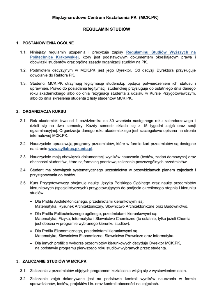 Międzynarodowe Centrum Kształcenia PK (MCK.PK) REGULAMIN STUDIÓW 1. POSTANOWIENIA OGÓLNE 1.1. Niniejszy regulamin uzupełnia i precyzuje zapisy Regulaminu Studiów Wyższych na Politechnice Krakowskiej, który jest podstawowym dokumentem określającym prawa i obowiązki studentów oraz ogólne zasady organizacji studiów na PK. 1.2. Podmiotem decyzyjnym w MCK.PK jest jego Dyrektor. Od decyzji Dyrektora przysługuje odwołanie do Rektora PK. 1.3. Studenci MCK.PK otrzymują legitymację studencką, będącą potwierdzeniem ich statusu i uprawnień. Prawo do posiadania legitymacji studenckiej przysługuje do ostatniego dnia danego roku akademickiego albo do dnia rezygnacji studenta z udziału w Kursie Przygotowawczym, albo do dnia skreślenia studenta z listy studentów MCK.PK. 2. ORGANIZACJA KURSU 2.1. Rok akademicki trwa od 1 października do 30 września następnego roku kalendarzowego i dzieli się na dwa semestry. Każdy semestr składa się z 15 tygodni zajęć oraz sesji egzaminacyjnej. Organizacja danego roku akademickiego jest szczegółowo opisana na stronie internetowej MCK.PK. 2.2. Nauczyciele opracowują programy przedmiotów, które w formie kart przedmiotów są dostępne na stronie www.syllabus.pk.edu.pl. 2.3. Nauczyciele mają obowiązek dokumentacji wyników nauczania (testów, zadań domowych) oraz obecności studentów, które są formalną podstawą zaliczenia poszczególnych przedmiotów. 2.4. Student ma obowiązek systematycznego uczestnictwa w przewidzianych planem zajęciach i przystępowania do testów. 2.5. Kurs Przygotowawczy obejmuje naukę Języka Polskiego Ogólnego oraz naukę przedmiotów kierunkowych (specjalistycznych) przygotowujących do podjęcia określonego stopnia i kierunku studiów. Dla Profilu Architektonicznego, przedmiotami kierunkowymi są: Matematyka, Rysunek Architektoniczny, Słownictwo Architektoniczne oraz Budownictwo. Dla Profilu Politechnicznego ogólnego, przedmiotami kierunkowymi są: Matematyka, Fizyka, Informatyka i Słownictwo Chemiczne (to ostatnie, tylko jeżeli Chemia jest obecna w programie wybranego kierunku studiów). Dla Profilu Ekonomicznego, przedmiotami kierunkowymi są: Matematyka, Słownictwo Ekonomiczne, Słownictwo Prawnicze oraz Informatyka. Dla innych profili: o wyborze przedmiotów kierunkowych decyduje Dyrektor MCK.PK, na podstawie programu pierwszego roku studiów wybranych przez studenta. 3. ZALICZANIE STUDIÓW W MCK.PK 3.1. Zaliczenia z przedmiotów objętych programem kształcenia wiążą się z wystawieniem ocen. 3.2. Zaliczanie zajęć dokonywane jest na podstawie kontroli wyników nauczania w formie sprawdzianów, testów, projektów i in. oraz kontroli obecności na zajęciach. 3.3. Student, który bez usprawiedliwienia (zwolnienia lekarskiego) opuścił w jednym semestrze: 20 godzin zajęć z Języka Polskiego Ogólnego – otrzymuje upomnienie; za kolejne 20 godzin nieobecności – otrzymuje naganę. Nagana skutkuje obniżeniem oceny semestralnej o ½ stopnia. Jeżeli liczba nieusprawiedliwionych godzin nieobecności na zajęciach z Języka Polskiego Ogólnego przekracza 60, następuje skreślenie z listy studentów. 3.4. Zajęcia z przedmiotów kierunkowych odbywają się raz lub dwa razy w tygodniu. Jest to odpowiednio 15 albo 30 spotkań w semestrze. Opuszczenie bez usprawiedliwienia 15% zajęć (odpowiednio 2 albo 4 spotkania w semestrze) skutkuje naganą i obniżeniem oceny semestralnej o ½ stopnia. Przekroczenie 25% nieusprawiedliwionych nieobecności na zajęciach z przedmiotów kierunkowych (odpowiednio 4 albo 7 spotkań w semestrze) powoduje niezaliczenie przedmiotu i skreślenie z listy studentów. Prowadzący zajęcia ma prawo ustalić własne zasady dotyczące nieusprawiedliwionych nieobecności oraz zaliczania przedmiotu. 3.5. Od dn. 20 października każdego roku akademickiego w MCK.PK akceptowane są wyłącznie zwolnienia lekarskie w języku polskim. 3.6. Uczestnicy Kursu Przygotowawczego, którzy z powodu wielu nieobecności nie otrzymali zaliczeń i nie przystąpili do egzaminów końcowych, nie mogą otrzymać dyplomu ukończenia kursu, ani skierowania na studia. Mogą otrzymać tylko zaświadczenie o udziale w kursie. 3.7. Student ma prawo ubiegać się o możliwość powtarzania semestru lub roku akademickiego. Decyzję w tej sprawie wydaje Dyrektor MCK PK po zapoznaniu się z opinią prowadzących zajęcia ze studentem. 4. OCENY 4.1. W MCK PK obowiązuje następująca skala ocen: bardzo dobry (5): 100 – 92% plus dobry (4,5): 91,9 – 84% dobry (4): 83,9 – 76% plus dostateczny (3,5): 75,9 – 68% dostateczny (3): 67,9 – 60% niedostateczny (2): 59,9 – 0%. 4.2. Na ocenę zaliczeniową z danego przedmiotu składają się oceny cząstkowe uzyskane przez studenta w ciągu semestru (z prac domowych, testów i in.). Za szczególną aktywność i zaangażowanie studenta, nauczyciel ma prawo podnieść ocenę zaliczeniową o pół stopnia. Nieusprawiedliwione nieobecności powodują obniżenie oceny zaliczeniowej (jak opisano w pp. 3.3 i 3.4). 4.3. Oceny semestralne są liczone wg następujących wag: 20% – średnia semestralna (ze wszystkich ocen zaliczeniowych), 20% – ocena z egzaminu połówkowego (przeprowadzanego w połowie każdego semestru), 20% – ocena z egzaminu semestralnego ustnego, 40% – ocena z egzaminu semestralnego pisemnego. 4.4. Ocena z przedmiotu kierunkowego składa się z następujących elementów: 25% – ocena z egzaminu połówkowego, 25% – ocena zaliczeniowa na koniec semestru, 50% – ocena z egzaminu semestralnego (w I semestrze) albo końcowego (w II semestrze). Przy braku egzaminu połówkowego (Matematyka, Fizyka) ocena składa się z dwóch elementów: 50% – ocena zaliczeniowa, 50% – ocena z egzaminu semestralnego. 4.5. Ocena końcowa – znajdująca się na dyplomie – jest średnią dwóch ocen semestralnych (uzyskanych po pierwszym i drugim semestrze). 4.6. Oceny semestralne i ocenę końcową egzaminatorzy ustalają komisyjnie. 