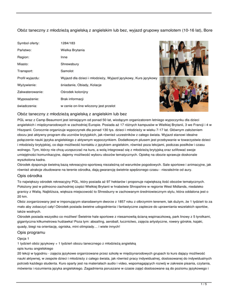 Obóz taneczny z młodzieżą angielską z angielskim lub bez, wyjazd grupowy samolotem (10-16 lat), Bore Symbol oferty: 1284/183 Państwo: Wielka Brytania Region: Inne Miasto: Shrewsbury Transport: Samolot Profil wyjazdu: Wyjazd dla dzieci i młodzieży, Wyjazd językowy, Kurs językowy Wyżywienie: śniadanie, Obiady, Kolacje Zakwaterowanie: Ośrodek kolonijny Wyposażenie: Brak informacji świadczenia: w cenie on-line wliczony jest przelot Obóz taneczny z młodzieżą angielską z angielskim lub bez PGL wraz z Camp Beaumont jest istniejącym od ponad 50 lat, wiodącym organizatorem letniego wypoczynku dla dzieci angielskich i międzynarodowych w zachodniej Europie. Posiada aż 17 różnych kampusów w Wielkiej Brytanii, 3 we Francji i 4 w Hiszpanii. Corocznie organizuje wypoczynek dla ponad 130 tys. dzieci i młodzieży w wieku 7-17 lat. Głównym założeniem obozu jest aktywny program dla uczniów brytyjskich, jak również uczestników z całego świata. Wyjazd stanowi idealne połączenie nauki języka angielskiego z aktywnym wypoczynkiem. Dodatkowym plusem jest przebywanie w towarzystwie dzieci i młodzieży brytyjskiej, co daje możliwość kontaktu z językiem angielskim, również poza lekcjami, podczas posiłków i czasu wolnego. Tym, którzy nie chcą uczęszczać na kurs, a wolą integrować się z młodzieżą brytyjską oraz szlifować swoje umiejętności komunikacyjne, dajemy możliwość wyboru obozów tematycznych. Opiekę na obozie sprawuje doskonale wyszkolona kadra. Ośrodek dysponuje świetną bazą rekreacyjno-sportową niezależną od warunków pogodowych. Sale sportowe i animacyjne, jak również atrakcje zbudowane na terenie ośrodka, dają gwarancję świetnie spędzonego czasu - niezależnie od aury. Opis ośrodka To największy ośrodek rekreacyjny PGL, który posiada aż 97 hektarów i proponuje największą ilość obozów tematycznych. Położony jest w północno-zachodniej części Wielkiej Brytanii w hrabstwie Shropshire w regionie West Midlands, niedaleko granicy z Walią. Najbliższa, większa miejscowość to Shresburry w zachowanym średniowiecznym stylu, która oddalona jest o 20 km. Obóz zorganizowany jest w imponującym starodawnym dworze z 1857 roku z olbrzymim terenem, tak dużym, że 1 tydzień to za mało aby zobaczyć cały! Ośrodek posiada świetne udogodnienia i fantastyczne zaplecze do uprawniania wszelakich sportów, także wodnych. Ośrodek posiada wszystko co możliwe! Świetnie hale sportowe z niesamowitą ścianą wspinaczkową, park linowy z 5 tyrolkami, gigantyczna kilkumetrowa huśtawka! Poza tym: absailing, aeroball, łucznictwo, zajęcia artystyczne, rowery górskie, kajaki, quady, biegi na orientację, ogniska, mini olimpiady… i wiele innych! Opis programu Opcja 1 1 tydzień obóz językowy + 1 tydzień obozu tanecznego z młodzieżą angielską opis kursu angielskiego 20 lekcji w tygodniu - zajęcia językowe organizowane przez szkołę w międzynarodowych grupach to kurs dający możliwość nauki aktywnej, w zespole dzieci i młodzieży z całego świata, jak również pracy indywidualnej, dostosowanej do indywidualnych potrzeb każdego studenta. Kurs oparty jest na materiałach audio i video, wspomagających rozwój w zakresie pisania, czytania, mówienia i rozumienia języka angielskiego. Zagadnienia poruszane w czasie zajęć dostosowane są do poziomu językowego i 1/5 wieku uczestników. Zajęcia prowadzone są w ciekawy sposób. Gry, zabawy, dyskusje, planowanie, przygotowywanie i prezentacja własnych materiałów mają za zadanie praktyczne wykorzystanie umiejętności językowych, a poruszane tematy nie odbiegają od najważniejszych tematów poruszających dzisiejszą opinię społeczną: dylematów ekologicznych, zagadnień związanych z mediami, kulturą czy historią. Opis programu Multi Activity Dzieci i młodzież na kursie językowym mają do wyboru bogaty program, ponad 20 atrakcji sportowych. Przy wyborze zajęć pozalekcyjnych brany jest pod uwagę wiek i możliwości fizyczne uczestników. Wieczorami wszystkie grupy spotykają się na wspólnym posiłku i zajęciach animacyjnych: wieczorkach tematycznych, dyskotekach, w kampusowym kinie i sali gier. Ponadto organizowana jest 1 półdniowa wycieczka np. do Alton Towers i Drayton Manor Park. • Taniec (10-16 lat) Jeśli marzy Ci się zostać mistrzem parkietu lub zatańczyć w klipie muzycznym, albo po prostu chcesz nauczyć się kilku nowych ruchów, to obóz taneczny w Boreatton Park spełni Twoje oczekiwania! Zajęcia taneczne prowadzone są przez specjalnych instruktorów tańca, którzy nauczą Was różnych ruchów popularnego -street dance”. Więc jeśli wydaje Ci się, że możesz zostać następną gwiazdą telewizyjnego show lub zatańczyć w najnowszym klipie MTV, to koniecznie spróbuj swoich sił właśnie tu! Nie ważne jeśli nigdy nie chodziłeś/-aś na kurs tańca, wystarczy abyś miał/-a dużo entuzjazmu i energii! Każdego dnia poznasz nowy styl, ruchy i kroki. Instruktorzy dadzą Wam rady oraz pomogą przygotować Wasz własny taniec, aby na koniec obozu pokazać go swoim przyjaciołom! Opcja 2 2 tygodnie obozu tanecznego z młodzieżą angielską bez języka angielskiego Jeśli wolisz integrację z dziećmi i młodzieżą brytyjską zamiast kursu językowego, proponujemy ekscytujące obozy tematyczne realizowane na kampusie. Programy te obejmują 6 przedpołudni w formie Multi-activity i 6 popołudni tematycznych oraz nie zawierają wycieczek autokarowych. Inne dostępne programy Multi Activity Mission Spy Motorsports Wspinaczka Studio Urody Warsztaty fotograficzne Obóz konny Music Studio Film Making Video Games Zakwaterowanie i wyżywienie Pokoje wieloosobowe, prosto urządzone, z łóżkami piętrowymi. Dzieci 7-10 lat zakwaterowane są na kampusie w pokojach wieloosobowych (8-16 osób w pokoju). Łazienki dzielone wraz z innymi. Natomiast młodzież 13-17 lat zakwaterowana jest w pokojach 4-6 osobowych z łazienkami. Dzi