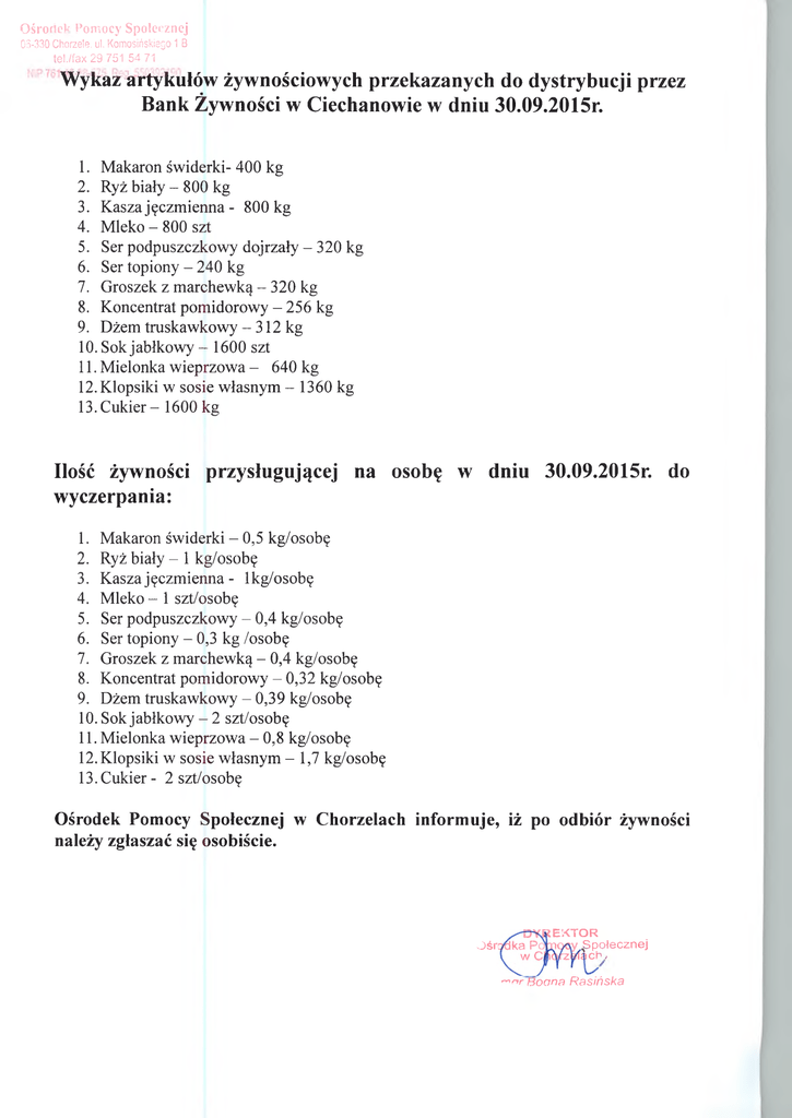 Ośrodek Pomocy Społecznej 06-330 Chorzele, ul. Komosińskiego 1 B te l./fa x 29 751 54 71 Wykaz artykułów żywnościowych przekazanych do dystrybucji przez Bank Żywności w Ciechanowie w dniu 30.09.2015r. 1. Makaron świderki- 400 kg 2. Ryż biały - 800 kg 3. Kasza j ęczmienna - 800 kg 4. Mleko - 800 szt 5. Ser podpuszczkowy dojrzały - 320 kg 6. Ser topiony - 240 kg 7. Groszek z marchewką - 320 kg 8. Koncentrat pomidorowy - 256 kg 9. Dżem truskawkowy - 312 kg 10. Sok jabłkowy - 1600 szt 11. Mielonka wieprzowa - 640 kg 12. Klopsiki w sosie własnym - 1360 kg 13. Cukier - 1600 kg Ilość żywności przysługującej na osobę w dniu 30.09.2015r. do wyczerpania: 1. Makaron świderki - 0,5 kg/osobę 2. Ryż biały - 1 kg/osobę 3. Kasza jęczmienna - 1kg/osobę 4. Mleko - 1 szt/osobę 5. Ser podpuszczkowy - 0,4 kg/osobę 6. Ser topiony - 0,3 kg /osobę 7. Groszek z marchewką - 0,4 kg/osobę 8. Koncentrat pomidorowy - 0,32 kg/osobę 9. Dżem truskawkowy - 0,39 kg/osobę 10. Sok jabłkowy - 2 szt/osobę 11. Mielonka wieprzowa - 0,8 kg/osobę 12. Klopsiki w sosie własnym - 1,7 kg/osobę 13. Cukier - 2 szt/osobę Ośrodek Pomocy Społecznej w Chorzelach informuje, iż po odbiór żywności należy zgłaszać się osobiście. EKTO R O śn ,S p o łe c z n e j ch > ^rirBoana Rasińska