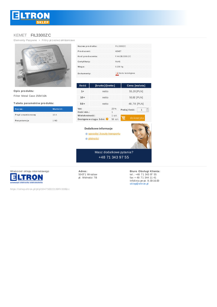 KEMET FIL3300Z C El em entyPasywne > Fi l tr ypr z eci wz akł óceni owe N a z wa p ro d u ktu : FI L3300Z C P ro d u c en t: KEMET K o d p ro d u c en ta : F.AK.DB.3300.Z C C ertyfi ka ty: RoHS Wa g a : 0.208 kg Ka rta ka ta logowa D o ku m en ty: O pis pro duktu: Fi l ter Metal Case250V/10A T a bela pa ra m etró wpro duktu: N a z wa : Wa rto ś ć : P rą d z n a m i o n o wy 10A R ez ys ta n c j a 1MΩ Ilo ś ć [brutto ] /[netto ] Cena [wa luta ] 1+ netto 55,20[PLN] 10 + netto 50,92[PLN] 50+ netto 48 ,7 8 [PLN] Vat: Ilośćmin.: Wielokrotność: 23% 1 1sz t. Dostępnewciąg u 3d ni: 58 sz t. Pod ajIlość: 1 + - dokosz yka Maszdodatkowepytania? +48713439755 Wł aści ci el skl epui nter netowego: https://skl ep.el tr on.pl /pl /p/18 47 50222139/fi l 3300z c Adres : 50-07 1Wr ocł aw pl .Wol ności 7 B Biuro O bs ługiKlienta : tel .:+48 7 134397 55 fax+48 7 13441141 Infol i ni apn-pt.8 .00-16.00 skl ep@ el tr on.pl