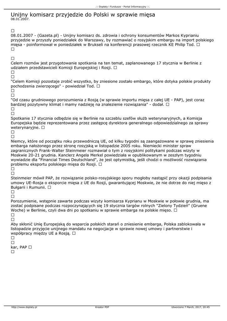 .:: Dopłaty i Fundusze - Portal Informacyjny ::. Unijny komisarz przyjedzie do Polski w sprawie mięsa 08.01.2007. 08.01.2007 - (Gazeta.pl) - Unijny komisarz ds. zdrowia i ochrony konsumentów Markos Kyprianiu przyjedzie w przyszły poniedziałek do Warszawy, by rozmawiać o rosyjskim embargu na import polskiego mięsa - poinformował w poniedziałek w Brukseli na konferencji prasowej rzecznik KE Philip Tod. Celem rozmów jest przygotowanie spotkania na ten temat, zaplanowanego 17 stycznia w Berlinie z udziałem przedstawicieli Komisji Europejskiej i Rosji. "Celem Komisji pozostaje zrobić wszystko, by zniesione zostało embargo, które dotyka polskie produkty pochodzenia zwierzęcego" - powiedział Tod. "Od czasu grudniowego porozumienia z Rosją (w sprawie importu mięsa z całej UE - PAP), jest coraz bardziej pozytywny klimat i mamy nadzieję na znalezienie rozwiązania" - dodał. Spotkanie 17 stycznia odbędzie się w Berlinie na szczeblu szefów służb weterynaryjnych, a Komisja Europejska będzie reprezentowana przez zastępcę dyrektora generalnego odpowiedzialnego za sprawy weterynaryjne. Niemcy, które od początku roku przewodniczą UE, od kilku tygodni są zaangażowane w sprawę zniesienia embarga nałożonego przez stronę rosyjską w listopadzie 2005 roku. Niemiecki minister spraw zagranicznych Frank-Walter Steinmeier rozmawiał o tym z rosyjskimi politykami podczas wizyty w Moskwie 20-21 grudnia. Kanclerz Angela Merkel powiedziała w opublikowanym w zeszłym tygodniu wywiadzie dla "Financial Times Deutschland", że jest optymistką, jeśli chodzi o możliwość rozwiązania problemu eksportu polskiego mięsa do Rosji. Steinmeier mówił PAP, że rozwiązanie polsko-rosyjskiego sporu mogłoby nastąpić przy okazji podpisania umowy UE-Rosja o eksporcie mięsa z UE do Rosji, gwarantującej Moskwie, że nie dotrze do niej mięso z Bułgarii i Rumunii. Porozumienie, wstępnie zawarte podczas wizyty komisarza Kyprianu w Moskwie w połowie grudnia, ma zostać podpisane podczas rozpoczynających się 19 stycznia targów rolnych "Zielony Tydzień" (Gruene Woche) w Berlinie, czyli dwa dni po spotkaniu w sprawie embarga na polskie mięso. Aby skłonić Unię Europejską do wsparcia polskich starań o zniesienie embarga, Polska zablokowała w listopadzie przyjęcie unijnego mandatu na negocjacje w sprawie nowej umowy i partnerstwie i współpracy między UE a Rosją. kar, PAP http://www.doplaty.pl Kreator PDF Utworzono 7 March, 2017, 20:45