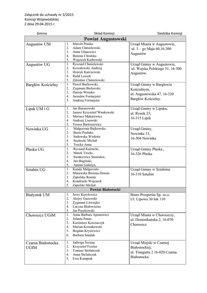 Załącznik do uchwały nr 3/2015 Komisji Wojewódzkiej Z dnia 29.04.2015 r. Gmina Skład Komisji Siedziba Komisji Powiat Augustowski Augustów UM Augustów UG Bargłów Kościelny Lipsk UM i G Nowinka UG Płaska UG Sztabin UG 1. 2. 3. 4. 5. 1. 2. 3. 4. 5. 1. 2. 3. 4. 5. Marcin Prusko Adam Chmielewski Anna Ułanowicz Bożena Chrulska Wojciech Karbowski Ryszard Chmielewski Kowalewski Andrzej Henryk Karczewski Rafał Leszek Zdzisław Chmielewski Paweł Bućkowski, Zygmunt Bielawski, Dorota Wronko Jarosław Formejster Andrzej Formejster Urząd Miasta w Augustowie, ul. 3 – go Maja 60,16-300 Augustów 1. 2. 3. 4. 5. 1. 2. 3. 4. 5. 1. 2. 3. 4. 5. 1. 2. 3. 4. 5. Jan Baranowski Janusz Krzysztof Wnukowski Mariusz Makarewicz Andrzej Lisowski Teresa Bartoszewicz Małgorzata Bujkowska Beata Paulako Sadowska Wioletta Suchocki Michał Trocka Anna Ryszard Kuźnicki, Marek Trocki, Sienkiewicz Stanisław, Jan Bagiński, Antoni Gałażyn, Kunda Małgorzata Murawska Bożena-Dorota Zapolska Renata Kondracki Wojciech Zapolski Michał Urząd Gminy w Lipsku, ul. Rynek 23, 16-315 Lipsk 1. 2. 3. 4. 5. 1. 2. 3. 4. 5. 6. Jerzy Kuryłowicz Alojzy Guzowski Zygmunt Litwiejko Lucyna Białowieżec Jan Paszkowski Anna Barbara Aponowicz Jolanta Panas Kazimierz Kościuczyk Marian Kossakowski Bogdan Krysiewicz Barbara Smalak Biuro Prosperita Sp. zo.o. Ul. Lipowa 30 lok 110 1. 2. 3. 4. 5. Jadwiga Świenc Krzysztof Feszler Tomasz Stefańczuk Anna Stefańczuk Ewa Kumpiak Urząd Miejski w Czarnej Białostockiej, ul. Traugutta 2 16-020 Czarna Białostocka. Urząd Gminy w Augustowie, ul. Wojska Polskiego 51, 16-300 Augustów. Urząd Gminy w Bargłowie Kościelnym, ul. Augustowska 47, 16-320 Bargłów Kościelny. Urząd Gminy, Nowinka 33, 16-304 Nowinka Urząd Gminy Płaska., 16-326 Płaska Urząd Gminy w Sztabinie 16-310 Sztabin Powiat Białostocki Białystok UM Choroszcz UGiM Czarna Białostocka UGIM Urząd Miasta w Choroszczy, ul. Dominikańska 2, 16-070 Choroszcz Załącznik do uchwały nr 3/2015 Komisji Wojewódzkiej Z dnia 29.04.2015 r. Gmina Dobrzyniewo Duże. UG Gródek UG Juchnowiec Kość UG Łapy UMIG Michałowo UG Poświętne UG Supraśl UMIG Suraż UMIG Turośń Kość. UG Tykocin UMIG Wasilków UGIM Skład Komisji 1. 2. 3. 4. 5. 1. 2. 3. 4. 5. 1. 2. 3. 4. 5. 1. 2. 3. 4. 5. 1. 2. 3. 4. 5. 1. 2. 3. 4. 5. 1. 2. 3. 4. 5. 1. 2. 3. 4. 5. 1. 2. 3. 4. 5. 6. 1. 2. 3. 4. 5. 1. 2. 3. 4. 5. Sadowski Błażej Krystyna Snarska Małgorzata Dobrzyńska Grażyna Woźniewska Antoni Adamski Mirosława Iwona Gościk Krystyna Sawicka Zenon Świątkowski Stanisław Szemiot Agnieszka Wojcieszuk. Bruczko Karol Wojszko Celina Matys Bożena Szumska Maria Zalewska Małgorzata Janusz Borowski Jolanta Łapińska Brzozowska Dorota Zarzecka Marianna Krystyna Falkowska Jarosław Anchim Agnieszka Monach Grażyna Gwoździej Halina Kardasz Halina Doroszko Warpechowski Przemysław Kusielczuk Robert Roszkowska Wiesława Pietryńczak Tomasz Łapiński Marcin Marian Brajczewski Bogdan Augustynowicz Michał Arciszewski Wojciech Jan Fiłonowicz Sławomir Leszek Grabowski Hamerszmit Magdalena Sacharko Danuta Skrzypkowska Teresa Owczarczuk Krzysztof Marciszewski Marek Kowalewicz Sławomir Szymkowska Malgorzata Rygorczuk Krzysztof Dryl Aleksandra Halicka Honorata Dojlida Irena Piotr Korziński Katarzyna Wołosik Małgorzata Alicja Kałudzińska Małgorzata Ostrowska Anna Zajkowska Miroslaw Szymański Małgorzata Czaban Czesław Łukaszewicz Piotr Maksimowicz Zygmunt Onichimiuk Siedziba Komisji Urząd Gminy w Dobrzyniewie Dużym ul. Białostocka 25, 16-002 Dobrzyniewo Duże Urząd Gminy w Gródku Aleksandra i Grzegorza Chodkiewiczów 2, 16-040 Gródek Urząd Gminy w Juchnowcu Kościelnym, 16-061 Juchnowiec Kościelny UMiG w Łapach ul. Gen. Sikorskiego 24, 18-100 Łapy Urząd Gminy w Michałowie, ul. Wąska 1, 16-050 Michałowo 085 7131774 Urząd Gminy w Poświętnem 21, 18-112 Poświętne. 0850 650 13 1450 13 14 Urząd Miejski w Supraślu Ul. Piłsudskiego 58, 16-030 Supraśl Urząd Miejski w Surażu Ul. 11 Listopada, 18-105 Suraż Urząd Gminy w Turośni Kościelnej, ul. Białostocka 5, 18-106 Turośń Kościelna. Urząd Miasta w Tykocinie, ul. Złota 2, 16-080 Tykocin. Urząd Miasta w Wasilkowie, ul. Białostocka 7, 16-010 Wasilków. Załącznik do uchwały nr 3/2015 Komisji Wojewódzkiej Z dnia 29.04.2015 r. Gmina Zabłudów UMIG Skład Komisji Siedziba Komisji Urząd Miasta w Zabłudowie, ul. Rynek 8, 16-060 Zabłudów 1. 2. 3. 4. 5. 1. 2. 3. 4. 5. Michał Harasimczuk Krzysztof Kamil Halicki Wojciech Babul Przemysław Matysewicz Andrzej Misztalewski Konopka Krystyna Anna Rogalewska Katarzyna Mielnicka Wasilewska Jolanta Grabowski Jarosław Bielsk Podlaski UM 1. 2. 3. 4. 5. Iwona Sieliwoniuk Ewa Bowtruczuk Anna Skiepko Krzysztof Wielanowski Władysław Kobus Urząd Miasta w Bielsku Podlaskim, ul. Kopernika 1, 17-100 Bielsk Podlaski. Bielsk Podlaski UG 1. 2. 3. 4. 5. Halina Jekateryńczuk Irena Wróblewska Jolanta Skorbiłowicz Krystyna Jakimiuk Irena Niestieruk Urząd Gminy w Bielsku Podlaskim, ul. Mickiewicza 46, 17-100 Bielsk Podlaski. Brańsk UM 1. 2. 3. 4. 5. 1. 2. 3. 4. 5. 6. 1. 2. 3. 4. 5. 1. 2. 3. 4. 5. 1. 2. 3. 4. 5. 1. 2. 3. 4. 5. Janina Sędziak Izba Anna Ożarowska Stanisław Laskowski Adam Malinowski Eugeniusz Ożarowski Puchalski Krzysztof Małgorzata Zielińska Cereniewicz Przemysław Paweł Wysocki Rafał Tymosiak Kazimierz Krzemień Jabłoński Tadeusz Derehajło Teresa Kłosińska Helena Szymczyk Anna Teresa Tymińska – Malinowska Marta Alina Pietruczuk Miroslawa Szajkowska Zenaida Nowicka Dariusz Ostapczuk Bohdan Leoniuk Agnieszka Dominiuk Marianna Moczulska Krystyna Parzonko Karol Iwańczuk Jan Marciniak Ewa Twarowska Zdzisława Jabłońska Bożena Siemieńczuk Teresa Falkowska Małgorzata Młodzianowska Urząd Miasta W Brańsku ul. Rynek 8 17-120 Brańsk Zawady UG Urząd Gminy w Zawadach, ul. Plac Wolności 12, 18-314 Zawady Powiat Bielski Brańsk UG Boćki UG Orla UG Rudka UG Wyszki UG Powiat Grajewski Urząd Gminy w Brańsku, ul. 