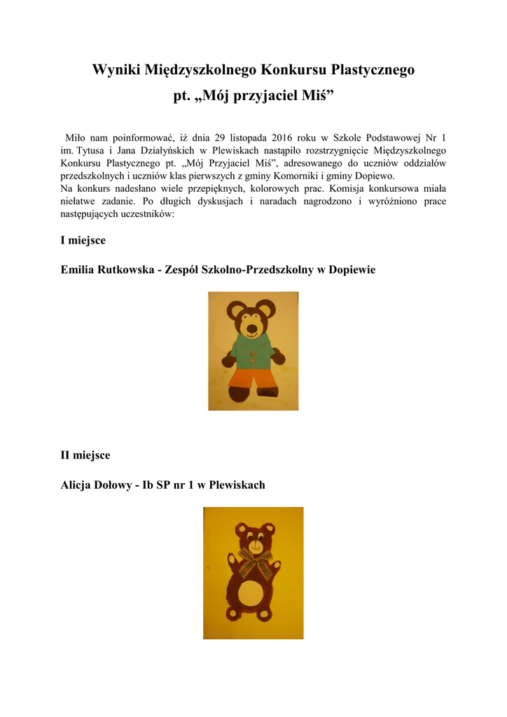 Wyniki Międzyszkolnego Konkursu Plastycznego pt. „Mój przyjaciel Miś” Miło nam poinformować, iż dnia 29 listopada 2016 roku w Szkole Podstawowej Nr 1 im. Tytusa i Jana Działyńskich w Plewiskach nastąpiło rozstrzygnięcie Międzyszkolnego Konkursu Plastycznego pt. „Mój Przyjaciel Miś”, adresowanego do uczniów oddziałów przedszkolnych i uczniów klas pierwszych z gminy Komorniki i gminy Dopiewo. Na konkurs nadesłano wiele przepięknych, kolorowych prac. Komisja konkursowa miała niełatwe zadanie. Po długich dyskusjach i naradach nagrodzono i wyróżniono prace następujących uczestników: I miejsce Emilia Rutkowska - Zespół Szkolno-Przedszkolny w Dopiewie II miejsce Alicja Dołowy - Ib SP nr 1 w Plewiskach III miejsce Marta Linkowska – oddział „0” SP w Chomęcicach Wyróżnienia: Jan Woronowicz - 0b SP nr 1 w Plewiskach Jagoda Wojciechowska - I b SP nr 2 w Plewiskach Maria Arent - 0b SP nr 1 w Plewiskach Nagrody rzeczowe wraz z dyplomami zostaną dostarczone do szkół. Dziękujemy wszystkim uczestnikom konkursu, a laureatom gratulujemy! Koordynator konkursu: Dorota Borowiak-Bączyńska