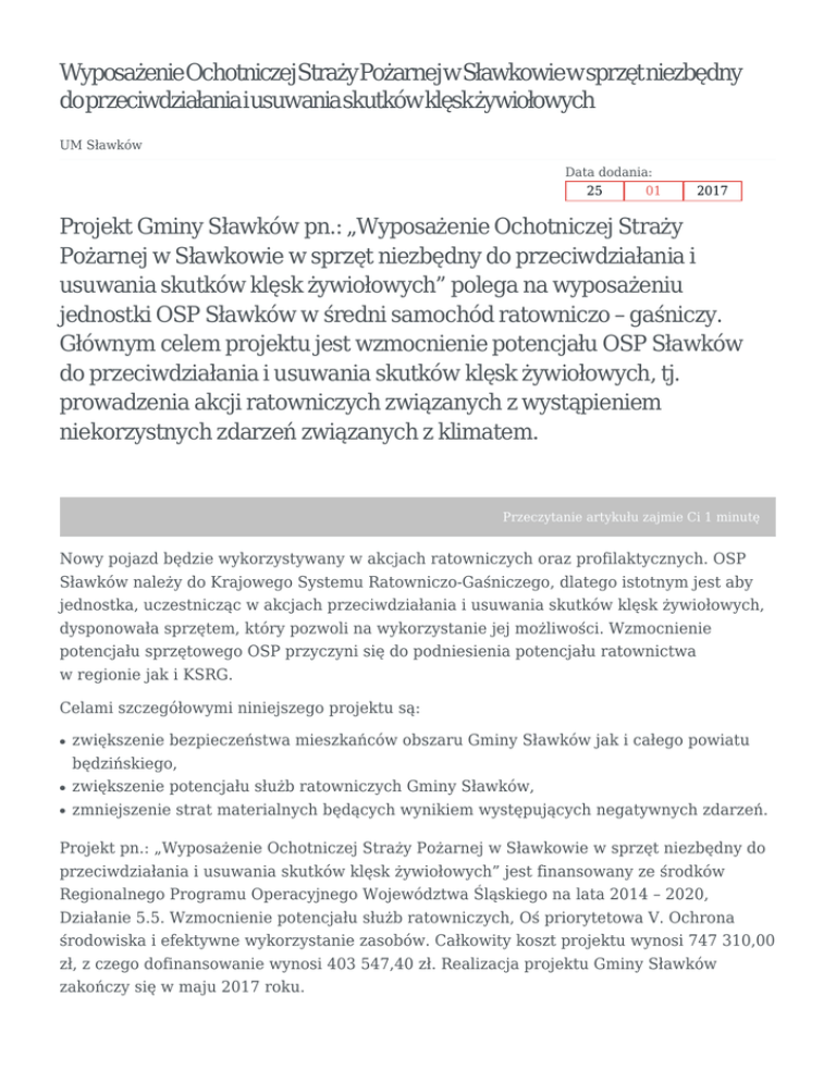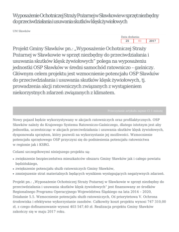 WyposażenieOchotniczejStrażyPożarnejwSławkowiewsprzętniezbędny doprzeciwdziałaniaiusuwaniaskutkówklęskżywiołowych UM Sławków Data dodania: 25 01 2017 Projekt Gminy Sławków pn.: „Wyposażenie Ochotniczej Straży Pożarnej w Sławkowie w sprzęt niezbędny do przeciwdziałania i usuwania skutków klęsk żywiołowych” polega na wyposażeniu jednostki OSP Sławków w średni samochód ratowniczo – gaśniczy. Głównym celem projektu jest wzmocnienie potencjału OSP Sławków do przeciwdziałania i usuwania skutków klęsk żywiołowych, tj. prowadzenia akcji ratowniczych związanych z wystąpieniem niekorzystnych zdarzeń związanych z klimatem. Przeczytanie artykułu zajmie Ci 1 minutę Nowy pojazd będzie wykorzystywany w akcjach ratowniczych oraz profilaktycznych. OSP Sławków należy do Krajowego Systemu Ratowniczo-Gaśniczego, dlatego istotnym jest aby jednostka, uczestnicząc w akcjach przeciwdziałania i usuwania skutków klęsk żywiołowych, dysponowała sprzętem, który pozwoli na wykorzystanie jej możliwości. Wzmocnienie potencjału sprzętowego OSP przyczyni się do podniesienia potencjału ratownictwa w regionie jak i KSRG. Celami szczegółowymi niniejszego projektu są: ● ● ● zwiększenie bezpieczeństwa mieszkańców obszaru Gminy Sławków jak i całego powiatu będzińskiego, zwiększenie potencjału służb ratowniczych Gminy Sławków, zmniejszenie strat materialnych będących wynikiem występujących negatywnych zdarzeń. Projekt pn.: „Wyposażenie Ochotniczej Straży Pożarnej w Sławkowie w sprzęt niezbędny do przeciwdziałania i usuwania skutków klęsk żywiołowych” jest finansowany ze środków Regionalnego Programu Operacyjnego Województwa Śląskiego na lata 2014 – 2020, Działanie 5.5. Wzmocnienie potencjału służb ratowniczych, Oś priorytetowa V. Ochrona środowiska i efektywne wykorzystanie zasobów. Całkowity koszt projektu wynosi 747 310,00 zł, z czego dofinansowanie wynosi 403 547,40 zł. Realizacja projektu Gminy Sławków zakończy się w maju 2017 roku. D R U KUJ D RUKUJ DO PDF http://www.slawkow.pl/print.php?pdf=true&unique=wyposazenie-ochotniczej-strazy-pozarnej-w-slawkowie-w-spr zet-niezbedny-do-przeciwdzialania-i-usuwania-skutkow-klesk-zywiolowych