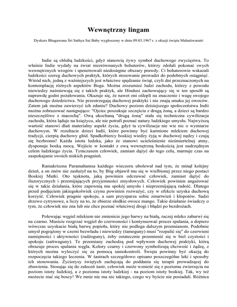 Wewnętrzny lingam Dyskurs Bhagawana Śri Sathya Sai Baby wygłoszony w dniu 09.03.1967 r. z okazji święta Mahaśiwaratri Indie są chlubą ludzkości, gdyż stanowią żywy symbol duchowego zwycięstwa. To właśnie Indie wydały na świat niezrównanych bohaterów, którzy zdołali pokonać swych wewnętrznych wrogów i spenetrowali niedostępne obszary prawdy. Ci bohaterowie wskazali ludzkości szereg duchowych praktyk, których stosowanie prowadzi do podobnych osiągnięć. Wśród nich, jedną z ważniejszych jest właściwe spędzanie świąt, czyli dni przeznaczonych na kontemplację różnych aspektów Boga. Można zrozumieć ludzi zachodu, którzy z powodu niewiedzy naśmiewają się z takich praktyk, ale Hindusi zachowujący się w ten sposób są naprawdę godni pożałowania. Okazuje się, że nawet oni oślepli na znaczenie i wagę swojego duchowego dziedzictwa. Nie przestrzegają duchowej praktyki i nie znają smaku jej owoców. Zatem jak można zawierzyć ich zdaniu? Duchowy poziom dzisiejszego społeczeństwa Indii można zobrazować następująco: "Ojciec poszukuje szczęścia z drugą żoną, a dzieci są bardzo nieszczęśliwe z macochą". Ową ukochaną "drugą żoną" stała się techniczna cywilizacja zachodu, która ląduje na księżycu, ale nie potrafi poznać natury ludzkiego umysłu. Najwyższą wartość stanowi dlań materialny aspekt życia, gdyż ta cywilizacja nie wie nic o wymiarze duchowym. W rezultacie dzieci Indii, które powinny być karmione mlekiem duchowej tradycji, cierpią duchowy głód. Spadkobiercy boskiej wiedzy żyją w duchowej nędzy i czują się bezbronni! Każda istota ludzka, jako że stanowi ucieleśnienie nieśmiertelnej atmy, dysponuje boską mocą. Wejście w kontakt z ową wewnętrzną boskością jest nadrzędnym celem ludzkiego życia. Tymczasem człowiek, zamiast dążyć do tego celu, marnuje czas na zaspokajanie swoich niskich pragnień. Ramakriszna Paramahamsa każdego wieczoru ubolewał nad tym, że minął kolejny dzień, a on znów nie zasłużył na to, by Bóg objawił mu się w wielbionej przez niego postaci Boskiej Matki. Oto tęsknota, jaką powinien odczuwać człowiek, zamiast dążyć do iluzorycznych i przemijających przyjemności zmysłowych. Człowiek powinien angażować się w takie działania, które zapewnią mu spokój umysłu i nieprzemijającą radość. Dlatego przed podjęciem jakiegokolwiek czynu powinien rozważyć, czy w efekcie uzyska duchową korzyść. Człowiek pragnie spokoju, a sam przysparza sobie zmartwień i kłopotów. Sadzi drzewo cytrynowe, a liczy na to, że zbierze słodkie owoce mango. Takie działanie świadczy o tym, że człowiek nie zna lub nie chce poznać właściwej drogi i błądzi po bezdrożach. Polewając węgiel mlekiem nie zmienicie jego barwy na białą, raczej mleko zabarwi się na czarno. Musicie rozgrzać węgiel do czerwoności i kontynuować proces spalania, a dopiero wówczas uzyskacie białą barwę popiołu, który nie podlega dalszym przemianom. Podobnie umysł pogrążony w czerni bezwładu i niewiedzy (tamoguny) musi "rozpalić się" do czerwieni namiętności i aktywności (radżoguny), żeby ostatecznie przemienić się w biel czystości i spokoju (sattwaguny). Te przemiany zachodzą pod wpływem duchowej praktyki, którą obrazuje proces spalania węgla. Kolory czarny i czerwony symbolizują chciwość i żądzę, z których można wyleczyć się za pomocą samokontroli. Święta powinny być okazją do rozpoczęcia takiego leczenia. W śastrach szczegółowo opisano poszczególne leki i sposoby ich stosowania. Życiorysy świętych zachęcają do poddania się terapii prowadzącej do zbawienia. Stosując się do zaleceń śastr, człowiek może wznieść się z poziomu zwierzęcia na poziom istoty ludzkiej, a z poziomu istoty ludzkiej - na poziom istoty boskiej. Tak, wy też możecie stać się boscy! We mnie nie ma nic takiego, czego wy byście nie posiadali. Różnica między nami polega jedynie na tym, że boskość w was jest przysłonięta, a we mnie widoczna. Życie jest bardzo krótkie. Jeżeli chcecie poznać swoją prawdziwą naturę i doznawać najwyższej szczęśliwości, musicie jak najefektywniej wykorzystywać każdą minutę. Nie traćcie czasu na zgłębianie natury bliźnich, zgłębiajcie własną jaźń. Chcąc wygrać wybory, chodzicie od domu do domu i nieomal padacie wyborcom do stóp, żeby tylko zdobyć ich głosy. Zamiast upokarzać się w ten sposób, padnijcie do stóp Bogu i stańcie się godni Jego łaski, a wówczas wyborcy sami na was zagłosują. Żeby tak się stało, musicie mieć niezachwianą wiarę w Boga i w działanie Jego łaski. Obecnie brak wam wiary, a co gorsze, traktujecie pogardliwie tych, którzy naprawdę w Niego wierzą. Na czym polega świętość Śiwaratri? Powiecie: "W tym dniu z wnętrza Swamiego wyłania się lingam". Tak naprawdę, każdy z was nosi w sobie lingam. Umysł związany z ciałem zawsze interesuje się przedmiotami świata zewnętrznego, w wyniku czego nawiązuje ze światem kontakt prowadzący do powstawania przywiązań. Przywiązanie do przemijających przedmiotów tego świata wiedzie ku cierpieniu. Cierpienie z kolei sprawia, że człowiek wycofuje się do wnętrza, a tam odnajduje atmę, którą dziś ujrzycie w materialnej postaci lingamu. Zatem oglądajcie lingam w chwili jego narodzin i odczuwajcie boską szczęśliwość. Pracujcie nad tym, żeby stać się godnymi tego wyjątkowego darśanu. Powiem wam, dlaczego dzisiejszy dzień jest święty. Otóż, dziś przypada noc poprzedzająca nów - czternasta noc po pełni księżyca, kiedy to na niebie widać jedynie maleńki jego skrawek. Księżyc symbolizuje umysł - źródło wszelkich pragnień i emocji. Tej nocy jego wpływ jest minimalny, zatem wystarczy spędzić czas na czuwaniu i kontemplowaniu Boga, żeby wznieść się ponad wpływ umysłu. Każda czternasta noc po pełni, zwana Śiwaratri, przeznaczona jest na intens