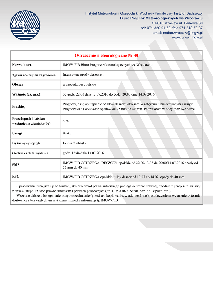 Instytut Meteorologii i Gospodarki Wodnej - Państwowy Instytut Badawczy Biuro Prognoz Meteorologicznych we Wrocławiu 51-616 Wrocław ul. Parkowa 30 tel: 071-320-01-50, fax: 071-348-73-37 email: [email protected] www: www.imgw.pl Ostrzeżenie meteorologiczne Nr 40 Nazwa biura IMGW-PIB Biuro Prognoz Meteorologicznych we Wrocławiu Zjawisko/stopień zagrożenia Intensywne opady deszczu/1 Obszar województwo opolskie Ważność (cz. urz.) od godz. 22:00 dnia 13.07.2016 do godz. 20:00 dnia 14.07.2016 Przebieg Prognozuje się wystąpienie opadów deszczu okresami o natężeniu umiarkowanym i silnym. Prognozowana wysokość opadów od 25 mm do 40 mm. Początkowo w nocy możliwe burze. Prawdopodobieństwo wystąpienia zjawiska(%) 80% Uwagi Brak. Dyżurny synoptyk Janusz Zieliński Godzina i data wydania godz. 12:44 dnia 13.07.2016 SMS IMGW-PIB OSTRZEGA: DESZCZ/1 opolskie od 22:00/13.07 do 20:00/14.07.2016 opady od 25 mm do 40 mm RSO IMGW-PIB OSTRZEGA opolskie, silny deszcz od 13.07 do 14.07, opady do 40 mm. Opracowanie niniejsze i jego format, jako przedmiot prawa autorskiego podlega ochronie prawnej, zgodnie z przepisami ustawy z dnia 4 lutego 1994r o prawie autorskim i prawach pokrewnych (dz. U. z 2006 r. Nr 90, poz. 631 z późn. zm.). Wszelkie dalsze udostępnianie, rozpowszechnianie (przedruk, kopiowanie, wiadomość sms) jest dozwolone wyłącznie w formie dosłownej z bezwzględnym wskazaniem źródła informacji tj. IMGW-PIB.
