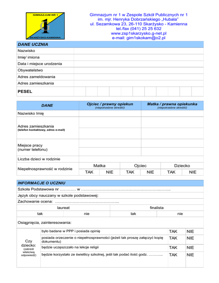 Gimnazjum nr 1 w Zespole Szkół Publicznych nr 1 im. mjr. Henryka Dobrzańskiego „Hubala” ul. Sezamkowa 23, 26-110 Skarżysko - Kamienna tel./fax (041) 25 25 632 www.zsp1skarzysko.g-net.pl e-mail: [email protected] DANE UCZNIA Nazwisko Imię/ imiona Data i miejsce urodzenia Obywatelstwo Adres zameldowania Adres zamieszkania PESEL DANE Ojciec / prawny opiekun Matka / prawna opiekunka (niepotrzebne skreślić) (niepotrzebne skreślić) Nazwisko Imię Adres zamieszkania (telefon kontaktowy, adres e-mail) Miejsce pracy (numer telefonu) Liczba dzieci w rodzinie Niepełnosprawność w rodzinie Matka TAK Ojciec NIE TAK Dziecko NIE TAK NIE INFORMACJE O UCZNIU Szkoła Podstawowa nr ………… w …………………………………………………..…….. Język obcy nauczany w szkole podstawowej: Zachowanie ocena: ………………………………………... laureat tak finalista nie tak nie Osiągnięcia, zainteresowania: Czy dziecko: (zakreśl właściwą odpowiedź) było badane w PPP i posiada opinię TAK NIE posiada orzeczenie o niepełnosprawności (jeżeli tak proszę załączyć kopię dokumentu) TAK NIE będzie uczęszczało na lekcje religii TAK NIE będzie korzystało ze świetlicy szkolnej, jeśli tak podać ilość godz. ………... TAK NIE DEKLARACJA UCZNIA: Prosimy o wybranie klasy, do której chcecie Państwo zapisać swoje dziecko. (zaznacz: X) klasa językowa ze zwiększoną liczbą godzin języka angielskiego i niemieckiego klasa turystyczna ze zwiększoną liczbą godzin geografii i języka obcego klasa na zasadach ogólnych ze zwiększoną liczbą godzin języka polskiego, obowiązkowy j. angielski i niemiecki oddział sportowy z dodatkowymi godzinami wychowania fizycznego: piłka siatkowa dziewcząt piłka siatkowa chłopców piłka nożna chłopców Wyrażam/my zgodę na przetwarzanie danych osobowych (zgodnie z ustawą o ochronie danych osobowych (Dz.U. z 2002r. Nr 101, poz.926 z późniejszymi zmianami) zawartych w kwestionariuszu osobowym przez Gimnazjum nr 1 w Skarżysku-Kamiennej w związku z procesem rekrutacji oraz realizacji celów dydaktycznych, wychowawczych i opiekuńczych szkoły w stosunku do mojego dziecka oraz rozpowszechnianiu wizerunku dziecka zgodnie z potrzebami szkoły (strona internetowa, gazetka szkolna, wycieczki, zawody sportowe, listy uczestników i laureatów konkursów). ……………………………………………………………. …………………………………………………………….. czytelny podpis ojca/prawnego opiekuna czytelny podpis matki/prawnego opiekuna Zobowiązuję się: 1. Ściśle przestrzegać wszystkich przepisów Statutu Szkoły i rozporządzeń organów szkoły, 2. Dotrzymywać terminów przy uiszczaniu opłat, 3. Pokrywać koszty ewentualnych szkód wyrządzonych przez moje dziecko podczas pobytu na terenie szkoły. Przyjmuję do wiadomości i akceptuję fakt, że szkoła nie bierze odpowiedzialności za rzeczy utracone w szatni i na terenie szkoły w czasie zajęć. Bardzo prosimy, aby dziecko nie przynosiło do szkoły rzeczy wartościowych (Tel. komórkowe, aparaty fotograficzne, mp3, itp.) ……………………………………………………………. ………………………………………………………… Wykaz dokumentów: 1. Zgłoszenie/wniosek o przyjęcie do klasy pierwszej - 01.04. - 22.04.2016 2. Świadectwo ukończenia szkoły podstawowej oraz zaświadczenie OKE - 24.06. - 29.06.2016 3. Jedna fotografia 4. Metryka urodzenia dziecka (do wglądu) Stwierdzam zgodność powyższych danych z aktem urodzenia dziecka. (wypełnia szkoła) ...................................................................................................................................................................................... (nazwisko i imiona dziecka) (data urodzenia) ( miejsce urodzenia) ...................................................................................................................................................................................... (adres zameldowania) ................................... ...................................... (data) (podpis sekretarza szkoły) Wpłata na konto Rady Rodziców - 30zł. Potwierdzenie wpłaty na konto Rady Rodziców /wypełnia szkoła/: Kwota .................................… wpłacona dnia ....................................... Podpis ..................................