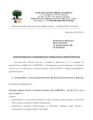 STOWARZYSZENIE OBRONA ZWIERZĄT ul. 11 Listopada 29, 28-300 Jędrzejów tel. 607-171-458, www.obrona-zwierzat.pl KRS 0000292939 REGON 260199276 NIP 656-22-72-801 Alior Bank S. A. 75 2490 0005 0000 4500 7398 2092 “Możemy człowieka ocenić po tym, jak traktuje zwierzęta” - Immanuel Kant (1724-1804) Jędrzejów, 25.10.2010 r. Prokuratura Rejonowa Kielce-Wschód ul. Sandomierska 106 25-318 Kielce ZAWIADOMIENIE O PODEJRZENIU POPEŁNIENIA PRZESTĘPSTWA Stowarzyszenie Obrona Zwierząt, z siedzibą w Jędrzejowie, ul. 11 Listopada 29, zarejestrowane w KRS pod nr 0000292939, wykonując prawa pokrzywdzonego na podstawie art. 39 w zw. z art. 40 Ustawy o ochronie zwierząt z dnia 21.08.1997 r., składa zawiadomienie o popełnieniu przez: 1. Grażynę Khier – kierowniczkę Schroniska dla Bezdomnych Zwierząt w Kielcach, przestępstwa polegającego na: złamaniu zapisów Ustawy o ochronie zwierząt z dnia 21.08.1997 r. - art. 35 w zw. z art. 6 ust. 1 i 2 pkt 1, 4 poprzez: – przyzwalanie na stosowanie okrucieństwa wobec zwierzęcia umieszczonego w Schronisku (bicie, kopanie, uderzanie twardymi narzędziami), – pozbawienie zwierzęcia umieszczonego w Schronisku właściwej opieki lekarsko – weterynaryjnej, co doprowadziło je do śmierci, – brak nadzoru nad pracownikami Schroniska 2. lekarzy weterynarii zatrudnionych w Schronisku dla Bezdomnych Zwierząt w Kielcach: Wojciecha Grubnera i Wojciecha Kiełek – złamania zapisów Ustawy o zawodzie lekarza weterynarii i izbach lekarsko weterynaryjnych z dnia 21.12.1990 r., – złamania zapisów Rozporządzenia Ministra Rolnictwa i Rozwoju Wsi w sprawie zakresu i sposobu prowadzenia ewidencji leczenia zwierząt i dokumentacji lekarsko – weterynaryjnej z dnia 28.04.2004 r. UZASADNIENIE Dnia 05.10.2010 r. członkowie Stowarzyszenia Obrona Zwierząt wzięli udział w konferencji poświęconej omówieniu sytuacji panującej w Schronisku dla Bezdomnych Zwierząt w Dyminach, zorganizowanej w Urzędzie Wojewódzkim w Kielcach. Następnie, w towarzystwie m. in. Powiatowego Lekarza Weterynarii Wiesława Wyszkowskiego, posła na Sejm RP Pawła Suskiego, pełnomocnika ds. zwierząt przy Kancelarii Prezydenta RP Kariny Schwerzler oraz przedstawicieli innych organizacji prozwierzęcych (Świętokrzyskiego Towarzystwa Opieki nad Zwierzętami “Zwierzak” i Towarzystwa Opieki nad Zwierzętami w Polsce, O/Kielce), udaliśmy się na niezapowiedzianą kontrolę do Schroniska przy ul. Ściegiennego 203. Na miejscu, członkowie Stowarzyszenia: Maciej Wilczyński i lek. wet. Joanna Świerczyńska zauważyli w boksie ogólnym, na służącym za podłoże piasku, wychudzone, nieruchome ciało psa. Natychmiast poinformowali o tym pozostałych wizytujących i nieliczny tego dnia personel Schroniska. Po ok. 10 minutach oczekiwania pojawił się pracownik Schroniska , który zabrał zwierzę z boksu, umieścił je na taczkach i usiłował się z nimi oddalić. Świadkowie tego zdarzenia uniemożliwili mu ten zamiar, odbierając taczki z ciałem psa. Ten sprawiał wrażenie nieżywego, był “luźny”, ale już zimny. Jednak w pewnym momencie obecni zauważyli nieznaczne ruchy powiek zwierzęcia, wskazujące na to, że może ono jeszcze żyć. Lek. wet. Joanna Świerczyńska obadała psa stetoskopem, nie potwierdzając jednak jakiejkolwiek akcji serca. Zwłoki zostały niezwłocznie przewiezione (ok. godz. 15.30) przez członków Stowarzyszenia Obrona Zwierząt i Świętokrzyskiego Towarzystwa Opieki nad Zwierzętami “Zwierzak” do Świętokrzyskiego Centrum Weterynarii, na ul. Koziej 7, gdzie zostały poddane ogólnym oględzinom (bez naruszania powłok skórnych) przez lek. wet. Macieja Grabca, który następnie wystawił skierowanie na sekcję zwłok do Zakładu Higieny Weterynaryjnej w Kielcach. Następnie zwłoki zostały przez nas przewiezione do ZHW, przy ul. Ściegiennego 205, gdzie ok. godz. 16 - tej zostały przyjęte przez pracownika ZHW Sławomira Tkacza. Sekcja rozpoczęła się następnego dnia o godz. 7.45. Jej wynik zamieszczamy w załączniku. Jeśli pies został przywieziony do schroniska już w takim stanie, to dlaczego nie przebywał przynajmniej w boksach przeznaczonych do obowiązkowej 14-dniowej kwarantanny? Oczywiście ciężki stan zwierzęcia nakazywałby umieścić go raczej w lecznicy weterynaryjnej pod opieką lekarza – tego przynajmniej należałoby wymagać od cywilizowanego schroniska dla bezdomnych zwierząt. Tymczasem pies znaleziony został w boksie ogólnym, co wskazuje na jego dłuższy pobyt w schronisku i jednoznacznie sugeruje, kto był sprawcą obrażeń zwierzęcia. Ujawniona odma jest objawem przyżyciowym i dowodem na to, że pies został pobity za życia. Zwierzę nie nosiło śladów pogryzienia, ani nie posiadało jakiegokolwiek oznaczenia umożliwiającego jego identyfikację, zaopatrzone było jedynie w parcianą, niebieską obrożę. Żądamy ścigania sprawców skatowania psa i nieudzielenia mu pomocy lekarsko – weterynaryjnej. Jednocześnie wnosimy o dopuszczenie Stowarzyszenia Obrona Zwierząt do udziału w sprawie w charakterze oskarżyciela posiłkowego. Lista świadków: – Agnieszka Lechowicz – Łączyn 99 A, 28 – 300 Jędrzejów, – Eliza Kwiecień - ul. Reymonta 27 A, 28-300 Jędrzejów, – Maciej Wilczyński - ul. Głowackiego 8, 28-300 Jędrzejów, – Piotr Szymański - ul. Głowackiego 6, 28-300 Jędrzejów, – Joanna Świerczyńska - Pępice 250, 26-080 Mniów, – Krystyna Sroczyńska - ul. Słoneczna 4, 96-321 Żabia Wola, – Katarzyna Śliwa – Łobacz - ul. Grodziska 13, 96-321 Musuły, – Wiesław Wyszkowski - Powiatowy Lekarz Weterynarii, ul. Ściegiennego 203, 25-116 Kielce, – Bogdan Konopka - Wojewódzki Lekarz Weterynarii, ul.Ściegiennego 203, 25-116 Kielce, – Karina Schwerzler - Biuro Inicjatyw Obywatelskich, Kancelaria Prezydenta RP, ul. Wiejska 4/6/8 00-902 Warszawa, – Paweł Suski - Poseł na Sejm RP, ul.Wiejska 4/6/8, 00-902 Warszawa, – Maciej Grabiec - Świ