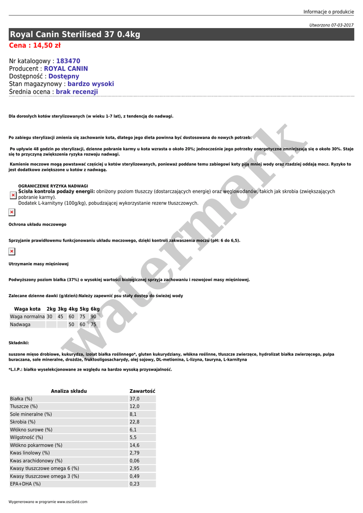 Informacje o produkcie Utworzono 07-03-2017 Royal Canin Sterilised 37 0.4kg Cena : 14,50 zł Nr katalogowy : 183470 Producent : ROYAL CANIN Dostępność : Dostępny Stan magazynowy : bardzo wysoki Średnia ocena : brak recenzji Dla dorosłych kotów sterylizowanych (w wieku 1-7 lat), z tendencją do nadwagi. er m ar k Po zabiegu sterylizacji zmienia się zachowanie kota, dlatego jego dieta powinna być dostosowana do nowych potrzeb: Po upływie 48 godzin po sterylizacji, dzienne pobranie karmy u kota wzrasta o około 20%; jednocześnie jego potrzeby energetyczne zmniejszają się o około 30%. Staje się to przyczyną zwiększenia ryzyka rozwoju nadwagi. Kamienie moczowe mogą powstawać częściej u kotów sterylizowanych, ponieważ poddane temu zabiegowi koty piją mniej wody oraz rzadziej oddają mocz. Ryzyko to jest dodatkowo zwiększone u kotów z nadwagą. OGRANICZENIE RYZYKA NADWAGI Ścisła kontrola podaży energii: obniżony poziom tłuszczy (dostarczających energię) oraz węglowodanów, takich jak skrobia (zwiększających pobranie karmy). Dodatek L-karnityny (100g/kg), pobudzającej wykorzystanie rezerw tłuszczowych. Ochrona układu moczowego Sprzyjanie prawidłowemu funkcjonowaniu układu moczowego, dzięki kontroli zakwaszenia moczu (pH: 6 do 6,5). Utrzymanie masy mięśniowej Podwyższony poziom białka (37%) o wysokiej wartości biologicznej sprzyja zachowaniu i rozwojowi masy mięśniowej. Waga kota at Zalecane dzienne dawki (g/dzień):Należy zapewnić psu stały dostęp do świeżej wody 2kg 3kg 4kg 5kg 6kg Waga normalna 30 45 60 75 90 50 60 75 w Nadwaga Składniki: suszone mięso drobiowe, kukurydza, izolat białka roślinnego*, gluten kukurydziany, włókna roślinne, tłuszcze zwierzęce, hydrolizat białka zwierzęcego, pulpa buraczana, sole mineralne, drożdże, fruktooligosacharydy, olej sojowy, DL-metionina, L-lizyna, tauryna, L-karnityna *L.I.P.: białko wyselekcjonowane ze względu na bardzo wysoką przyswajalność. Analiza składu Zawartość Białka (%) 37,0 Tłuszcze (%) 12,0 Sole mineralne (%) 8,1 Skrobia (%) 22,8 Włókno surowe (%) 6,1 Wilgotność (%) 5,5 Włókno pokarmowe (%) 14,6 Kwas linolowy (%) 2,79 Kwas arachidonowy (%) 0,06 Kwasy tłuszczowe omega 6 (%) 2,95 Kwasy tłuszczowe omega 3 (%) 0,49 EPA+DHA (%) 0,23 Wygenerowano w programie www.oscGold.com Bezazotowe substancje wyciągowe (NFE) (%) 31,3 Energia metaboliczna (obliczona wg NRC85) (kcal/kg) 3.410,5 Energia metaboliczna (mierzona) (kcal/kg) 3.640,0 Sole mineralne Zawartość Wapń (%) 1,11 Fosfor (%) 1,0 Magnez (%) 0,08 Sód (%) 0,7 Żelazo (mg/kg) 221,0 Cynk (mg/kg) 200,0 Jod (mg/kg) 2,7 Selen (mg/kg) 0,31 Potas (%) 0,7 Miedź (mg/kg) 15,0 Chlor (%) 0,81 Witaminy Witamina A (UI/kg) er m ar k Mangan (mg/kg) 62,0 Zawartość 22.000,0 Kwas foliowy (mg/kg) 4,5 Cholina (mg/kg) 2.100,0 Witamina B1 (tiamina) (mg/kg) Witamina B2 (ryboflawina) (mg/kg) 17,1 61,4 Witamina B5 (kwas pantotenowy) (mg/kg) 57,1 Witamina B3 (niacyna) (mg/kg) Witamina B6 (pirydoksyna) (mg/kg) Witamina D3 (UI/kg) 1,8 Witamina B12 (kobalamina) (mg/kg) Witamina C (mg/kg) 0,18 200,0 Witamina E (mg/kg) 500,0 Zawartość 2.400,0 L-karnityna (mg/kg) 100,0 Luteina (mg/kg) 5,0 Arginina (%) 1,9 L-lizyna (%) 1,28 at Tauryna (mg/kg) Metionina - cystyna (%) 1,53 0,96 w DL-metionina (%) 28,1 1.000,0 Biotyna (mg/kg) Inne 194,5