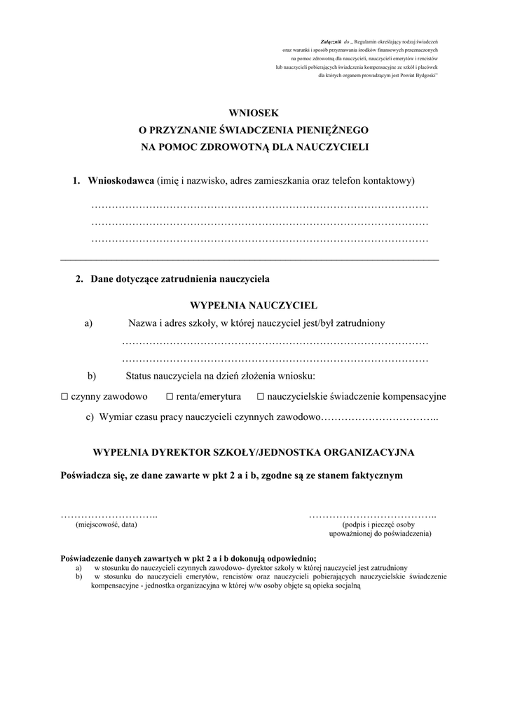 Załącznik do ,, Regulamin określający rodzaj świadczeń oraz warunki i sposób przyznawania środków finansowych przeznaczonych na pomoc zdrowotną dla nauczycieli, nauczycieli emerytów i rencistów lub nauczycieli pobierających świadczenia kompensacyjne ze szkół i placówek dla których organem prowadzącym jest Powiat Bydgoski” WNIOSEK O PRZYZNANIE ŚWIADCZENIA PIENIĘŻNEGO NA POMOC ZDROWOTNĄ DLA NAUCZYCIELI 1. Wnioskodawca (imię i nazwisko, adres zamieszkania oraz telefon kontaktowy) ……………………………………………………………………………………… ……………………………………………………………………………………… ……………………………………………………………………………………… __________________________________________________________________________ 2. Dane dotyczące zatrudnienia nauczyciela WYPEŁNIA NAUCZYCIEL Nazwa i adres szkoły, w której nauczyciel jest/był zatrudniony a) ……………………………………………………………………………… ……………………………………………………………………………… b) Status nauczyciela na dzień złożenia wniosku: □ czynny zawodowo □ renta/emerytura □ nauczycielskie świadczenie kompensacyjne c) Wymiar czasu pracy nauczycieli czynnych zawodowo…………………………….. WYPEŁNIA DYREKTOR SZKOŁY/JEDNOSTKA ORGANIZACYJNA Poświadcza się, ze dane zawarte w pkt 2 a i b, zgodne są ze stanem faktycznym ……………………….. ……………………………….. (miejscowość, data) (podpis i pieczęć osoby upoważnionej do poświadczenia) Poświadczenie danych zawartych w pkt 2 a i b dokonują odpowiednio; a) b) w stosunku do nauczycieli czynnych zawodowo- dyrektor szkoły w której nauczyciel jest zatrudniony w stosunku do nauczycieli emerytów, rencistów oraz nauczycieli pobierających nauczycielskie świadczenie kompensacyjne - jednostka organizacyjna w której w/w osoby objęte są opieka socjalną Proszę o przyznanie mi świadczenia z tytułu pomocy zdrowotnej z powodu: ………………………………………………………………………………………………… ………………………………………………………………………………………………… ………………………………………………………………………………………………… ………………………………………………………………………………………………… ………………………………………………………………………………………………… 3. Informacje wnioskodawcy W celu potwierdzenia zasadności mojego wniosku dołączam następujące dokumenty: aktualne zaświadczenie lekarza specjalisty o stanie zdrowia, wypis ze szpitala, dokumenty potwierdzające poniesione koszty leczenia, zakupu sprzętu,(faktury, rachunki), 3) inne dokumenty uzasadniające przyznanie pomocy zdrowotnej (wymienić jakie) 1) 2) ………………………………………………………………………………………………. …………………………………… ………………………………… (miejscowość, data ) ( podpis wnioskodawcy) OŚWIADCZENIE O DOCHODACH Niniejszym oświadczam, że łączny przychód roczny * wyniósł w mojej rodzinie w przeliczeniu na jedną osobę…………… słownie……………………………………………………………… Oświadczenie składam w celu przyznania świadczenia na pomoc zdrowotną dla nauczycieli świadoma/y odpowiedzialności karnej za zatajenie prawdy lub podanie nieprawdziwych danych. …………………….. podpis wnioskodawcy *oznacza łączny przychód roczny (za rok poprzedzający rok, w którym składana jest informacja) pomniejszony o koszty uzyskania przychodu oraz o składki na ubezpieczenie społeczne (nie odlicza się składek zdrowotnych) każdego członka rodziny prowadzącego wspólnie gospodarstwo domowe i uprawnionego zgodnie z Regulaminem ZFŚS do korzystania z pomocy funduszu, podzielonych przez 12. W przypadku dochodu uzyskiwanego z gospodarstwa rolnego przyjmuje się, że z 1 ha przeliczeniowego zyskuje się dochód miesięczny w wysokości 1/12 dochodu ogłaszanego corocznie, w drodze obwieszczenia przez prezesa Głównego Urzędu Statystycznego na podstawie art. 18 ustawy z dnia 15 listopada 1984r. o podatku rolnym (Dz. U. z 2006r. Nr 136 poz. 969 z późn. zm.). Prawidłowość powyższych danych potwierdzam własnoręcznym podpisem świadomy/a odpowiedzialności karnej (art. 233 §1 Kodeksu karnego, Dz. U. z 1997r. Nr 88, poz. 553) Jednocześnie wyrażam zgodę na gromadzenie, przetwarzanie i przekazywanie moich danych osobowych w celu rozpatrzenia mojego wniosku o przyznanie zasiłku z funduszu zdrowotnego zgodnie z ustawą z dnia 26 sierpnia 1997r. o ochronie danych osobowych (tekst jedn. Dz. U. z 2002r. Nr 101, poz. 926 z późn. zm.) . …………………………………… (miejscowość, data ) …………………………………. (podpis wnioskodawcy)