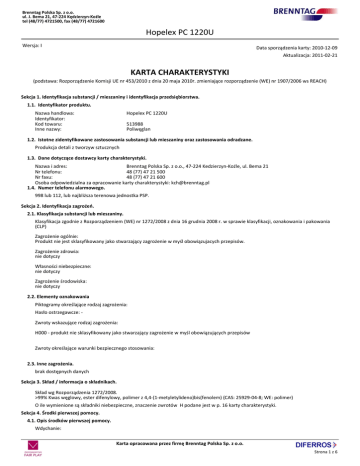 Brenntag Polska Sp. z o.o. ul. J. Bema 21, 47-224 Kędzierzyn-Koźle tel (48/77) 4721500, fax (48/77) 4721600 Hopelex PC 1220U Wersja: I Data sporządzenia karty: 2010-12-09 Aktualizacja: 2011-02-21 KARTA CHARAKTERYSTYKI (podstawa: Rozporządzenie Komisji UE nr 453/2010 z dnia 20 maja 2010r. zmieniające rozporządzenie (WE) nr 1907/2006 ws REACH) Sekcja 1. Identyfikacja substancji / mieszaniny i identyfikacja przedsiębiorstwa. 1.1. Identyfikator produktu. Nazwa handlowa: Identyfikator: Kod towaru: Inne nazwy: Hopelex PC 1220U 513988 Poliwęglan 1.2. Istotne zidentyfikowane zastosowania substancji lub mieszaniny oraz zastosowania odradzane. Produkcja detali z tworzyw sztucznych 1.3. Dane dotyczące dostawcy karty charakterystyki. Nazwa i adres: Brenntag Polska Sp. z o.o., 47-224 Kedzierzyn-Koźle, ul. Bema 21 Nr telefonu: 48 (77) 47 21 500 Nr faxu: 48 (77) 47 21 600 Osoba odpowiedzialna za opracowanie karty charakterystyki: [email protected] 1.4. Numer telefonu alarmowego. 998 lub 112, lub najbliższa terenowa jednostka PSP. Sekcja 2. Identyfikacja zagrożeń. 2.1. Klasyfikacja substancji lub mieszaniny. Klasyfikacja zgodnie z Rozporządzeniem (WE) nr 1272/2008 z dnia 16 grudnia 2008 r. w sprawie klasyfikacji, oznakowania i pakowania (CLP) Zagrożenie ogólnie: Produkt nie jest sklasyfikowany jako stwarzający zagrożenie w myśl obowiązujacych przepisów. Zagrożenie zdrowia: nie dotyczy Własności niebezpieczne: nie dotyczy Zagrożenie środowiska: nie dotyczy 2.2. Elementy oznakowania Piktogramy określające rodzaj zagrożenia: Hasło ostrzegawcze: Zwroty wskazujące rodzaj zagrożenia: H000 - produkt nie sklasyfikowany jako stwarzający zagrożenie w myśl obowiązujących przepisów Zwroty określające warunki bezpiecznego stosowania: 2.3. Inne zagrożenia. brak dostępnych danych Sekcja 3. Skład / informacja o składnikach. Skład wg Rozporządzenia 1272/2008. >99% Kwas węglowy, ester difenylowy, polimer z 4,4-(1-metyletylideno)bis(fenolem) (CAS: 25929-04-8; WE: polimer) O ile wymienione są składniki niebezpieczne, znaczenie zwrotów H podane jest w p. 16 karty charakterystyki. Sekcja 4. Środki pierwszej pomocy. 4.1. Opis środków pierwszej pomocy. Wdychanie: Karta opracowana przez firmę Brenntag Polska Sp. z o.o. Strona 1 z 6 Brenntag Polska Sp. z o.o. ul. J. Bema 21, 47-224 Kędzierzyn-Koźle tel (48/77) 4721500, fax (48/77) 4721600 Hopelex PC 1220U W razie narażenia inhalacyjnego wyprowadzić poszkodowanego na świeże powietrze. W przypadku złego samopoczucia skontaktować się z lekarzem. Kontakt ze skórą: W razie zanieczyszczenia skóry płukać wodą z mydłem. W razie kontaktu ze stopionym produktem natychmiast schłodzić zimna wodą, nie odrywać zakrzepnietego produktu ze skóry, zgłosić się do lekarza. Kontakt z oczami: W przypadku kontaktu pyłu lub roztopionego produktu z oczami płukać obficie wodą przez co najmniej 20 minut. W przypadku objawów podrażnienia skontaktować się z lekarzem. W razie kontaktu ze stopionym produktem płuk Spożycie: W razie spożycia wywołać wymioty, przepłukać usta wodą, przy wystąpieniu niepokojących objawów skonsultować się z lekarzem 4.2. Najważniejsze ostre i opóźnione objawy oraz skutki narażenia. brak dostępnych danych 4.3. Wskazania dotyczące wszelkiej natychmiastowej pomocy lekarskiej i szczególnego postępowania z poszkodowanym. brak dostępnych danych Sekcja 5. Postępowanie w przypadku pożaru. 5.1. Środki gaśnicze. woda, piany i proszki gaśnicze 5.2. Szczególne zagrożenia związane z substancją lub mieszaniną. brak dostępnych danych 5.3. Informacje dla straży pożarnej. Pojemniki narażone na działanie ognia lub wysokiej temperatury chłodzić rozpylając wodę z bezpiecznej odległości. Stosować niezależny aparat oddechowy oraz odzież ochronną Sekcja 6. Postępowanie w przypadku niezamierzonego uwolnienia do środowiska. 6.1. Indywidualne środki ostrożności, wyposażenie ochronne i procedury w sytuacjach awaryjnych. Unikać wzniecania pyłów. Uwaga: niebezpieczeństwo pośliźnięcia się na rozsypanym produkcie. 6.2. Środki ostrożności w zakresie ochrony środowiska. brak dostępnych danych 6.3. Metody i materiały zapobiegające rozprzestrzenianiu się skażenia i służące do usuwania skażenia. Zapobiec rozprzestrzenianiu się produktu, rozsypany produkt zebrać mechanicznie do oznakowanego pojemnika i przekazać do zniszczenia. 6.4. Odniesienia do innych sekcji. Informacje dotyczące odpowiedniego sprzętu ochrony osobistej podano w sekcji 8. Informacje dotyczące dodatkowej obróbki odpadów podano w sekcji 13. Sekcja 7. Postępowanie z substancjami i mieszaninami oraz ich magazynowanie. 7.1. Środki ostrożności dotyczące bezpiecznego postępowania. Zapewnić odpowiednią wentylację pomieszczeń. Unikać wzniacania pyłu. Zapobiegać gromadzeniu się ładunków elektrostatycznych stosować uziemienie. 7.2. Warunki bezpiecznego magazynowania, łącznie z informacjami dotyczącymi wszelkich wzajemnych niezgodności. Przechowywać w zamkniętych opakowaniach w chłodnymi i suchym miejscu. Chronić przed ogrzewaniem, bezpośrednim nasłonecznieniem. 7.3. Szczególne zastosowania końcowe. brak dostępnych danych Sekcja 8. Kontrola narażenia / środki ochrony indywidualnej. 8.1. Parametry dotyczące kontroli. NDS, NDSCh - nie oznaczono (wg Rozporządzenia MIPS z dn. 6 czerwca 2014, Dz.U. 2014, poz.817) Zalecenia dotyczące procedury monitoringu zawartości składników niebezpiecznych w powietrzu – metodyka pomiarów: -Rozporządzenie Ministra Zdrowia z dnia 20 kwietnia 2005 r. w sprawie badań i pomiarów czynników szkodliwych dla zdrowia w środowisku pracy (Dz.U. Nr 73, poz.645) Karta opracowana przez firmę Brenntag Polska Sp. z o.o. Strona 2 z 6 Brenntag Polska Sp. z o.o. ul. J. Bema 21, 47-224 Kędzierzyn-Koźle tel (48/77) 4721500, fax (48/77) 4721600 Hopelex PC 1220U -PN-89/Z-01001/06. Ochrona czystości powietrza. Nazwy, określenia i jednostki.